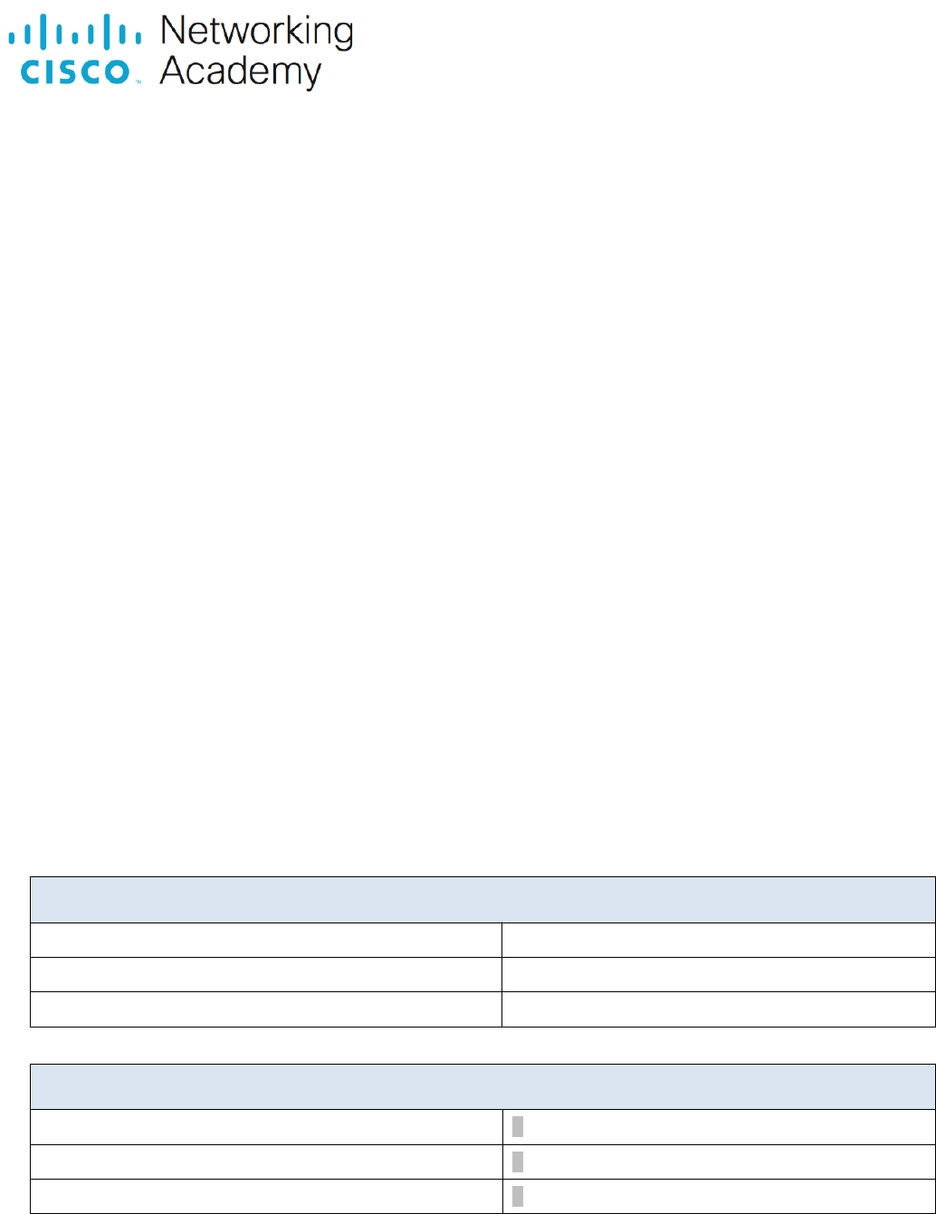 Laboratório - Calcular sub-redes IPv4 Laboratório - Calcular sub-redes IPv4 (Versão do Instrutor) Nota do Instrutor: Cor vermelha da fonte ou realces em cinza indicam o texto que aparece apenas na cópia do instrutor. Objetivos Parte 1: Determinar a Divisão de Endereços IPv4 em Sub-Redes Parte 2: Calcular a Divisão de Endereços IPv4 em Sub-Redes Histórico/Cenário A capacidade de trabalhar com sub-redes IPv4 e determinar informações de rede e de host com base em um endereço IP e uma máscara de sub-rede específicos é crucial para entender como as redes IPv4 operam. A primeira parte foi elaborada para reforçar como as informações de endereço IP de rede são calculadas para um endereço IP e uma máscara de sub-rede específicos. Ao receber um endereço IP e uma máscara de sub-rede, você poderá determinar outras informações sobre a sub-rede. Nota do instrutor: Esta atividade pode ser realizada em sala de aula ou atribuída como lição de casa. Se a tarefa for realizada em sala de aula, você poderá pedir aos alunos que trabalhem individualmente ou em grupos de dois. Sugere-se que o primeiro problema seja feito em conjunto na sala de aula para dar aos alunos uma orientação sobre como proceder no restante da tarefa. Os endereços IP públicos usados neste laboratório são de propriedade da Cisco. Recursos Necessários 1 PC (Windows com acesso à Internet) Opcional: calculadora de endereços IPv4 Instruções Preencha as tabelas abaixo com respostas apropriadas, tendo o endereço IPv4, a máscara de sub-rede original e a nova máscara de sub-rede. Dados: Endereço IP do Host: 192.168.200.139 Máscara de Sub-Rede Original: 255.255.255.0 Nova Máscara de Sub-Rede: 255.255.255.224 Descubra: Número de Bits de Sub-Rede 3 Número de Sub-Redes Criadas 8 Número de Bits de Host por Sub-Rede 5 Número de Hosts por Sub-Rede 30 Endereço de Rede desta Sub-Rede 192.168.200.128 Endereço IPv4 do Primeiro Host nesta Sub-Rede 192.168.200.129 Endereço IPv4 do Último Host nesta Sub-Rede 192.168.200.158 Endereço IPv4 de Broadcast nesta Sub-Rede 192.168.200.159 Dados: Endereço IP do Host: 10.101.99.228 Máscara de Sub-Rede Original: 255.0.0.0 Nova Máscara de Sub-Rede: 255.255.128.0 Descubra: Número de Bits de Sub-Rede 9 Número de Sub-Redes Criadas 512 Número de Bits de Host por Sub-Rede 15 Número de Hosts por Sub-Rede 32.766 Endereço de Rede desta Sub-Rede 10.101.0.0 Endereço IPv4 do Primeiro Host nesta Sub-Rede 10.101.0.1 Endereço IPv4 do Último Host nesta Sub-Rede 10.101.127.254 Endereço IPv4 de Broadcast nesta Sub-Rede 10.101.127.255 Dados: Endereço IP do Host: 172.22.32.12 Máscara de Sub-Rede Original: 255.255.0.0 Nova Máscara de Sub-Rede: 255.255.224.0 Descubra: Número de Bits de Sub-Rede 3 Número de Sub-Redes Criadas 8 Número de Bits de Host por Sub-Rede 13 Número de Hosts por Sub-Rede 8.190 Endereço de Rede desta Sub-Rede 172.22.32.0 Endereço IPv4 do Primeiro Host nesta Sub-Rede 172.22.32.1 Endereço IPv4 do Último Host nesta Sub-Rede 172.22.63.254 Endereço IPv4 de Broadcast nesta Sub-Rede 172.22.63.255 Dados: Endereço IP do Host: 192.168.1.245 Máscara de Sub-Rede Original: 255.255.255.0 Nova Máscara de Sub-Rede: 255.255.255.252 Descubra: Número de Bits de Sub-Rede 6 Número de Sub-Redes Criadas 64 Número de Bits de Host por Sub-Rede 2 Número de Hosts por Sub-Rede 2 Endereço de Rede desta Sub-Rede 192.168.1.244 Endereço IPv4 do Primeiro Host nesta Sub-Rede 192.168.1.245 Endereço IPv4 do Último Host nesta Sub-Rede 192.168.1.246 Endereço IPv4 de Broadcast nesta Sub-Rede 192.168.1.247 Dados: Endereço IP do Host: 128.107.0.55 Máscara de Sub-Rede Original: 255.255.0.0 Nova Máscara de Sub-Rede: 255.255.255.0 Descubra: Número de Bits de Sub-Rede 8 Número de Sub-Redes Criadas 256 Número de Bits de Host por Sub-Rede 8 Número de Hosts por Sub-Rede 254 Endereço De Rede desta Sub-Rede 128.107.0.0 Endereço IPv4 do Primeiro Host nesta Sub-Rede 128.107.0.1 Endereço IPv4 do Último Host nesta Sub-Rede 128.107.0.254 Endereço IPv4 de Broadcast nesta Sub-Rede 128.107.0.255 Dados: Endereço IP do Host: 192.135.250.180 Máscara de Sub-Rede Original: 255.255.255.0 Nova Máscara de Sub-Rede: 255.255.255.248 Descubra: Número de Bits de Sub-Rede 5 Número de Sub-Redes Criadas 32 Número de Bits de Host por Sub-Rede 3 Número de Hosts por Sub-Rede 6 Endereço de Rede desta Sub-Rede 192.135.250.176 Endereço IPv4 do Primeiro Host nesta Sub-Rede 192.135.250.177 Endereço IPv4 do Último Host nesta Sub-Rede 192.135.250.182 Endereço IPv4 de Broadcast nesta Sub-Rede 192.135.250.183 Perguntas para reflexão Por que a máscara de sub-rede é tão importante na análise de um endereço IPv4? Digite suas respostas aqui. A máscara de sub-rede determina tudo sobre o endereço: a rede, o número de bits de host, o número de hosts e o endereço de broadcast. Apenas olhar para o endereço IPv4 não indica nada. Você precisa da máscara de sub-rede para preencher todas as informações importantes. Fim do documento Fim do documento 2013 - 2019 Cisco e/ou suas afiliadas. Todos os direitos reservados. Página Pública da Cisco 1 4 www.netacad.com 2013 - 2019 Cisco e/ou suas afiliadas. Todos os direitos reservados. Página Pública da Cisco 3 4 www.netacad.com image1.png
