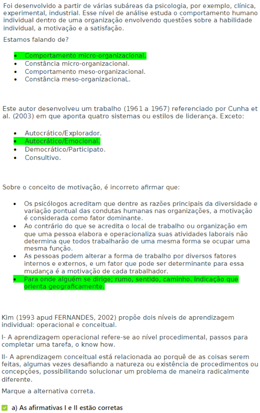 Foi desenvolvido a partir de várias subáreas da psicologia, por exemplo, clínica, experimental, industrial. Esse nível de análise estuda comportamento humano individual dentro de uma organização envolvendo questões sobre a habilidade individual, a motivação e a satisfação. Estamos falando de? Comportamento micro-organizacional Constância micro-organizacional. Comportamento meso-organizacional. Constância Este autor desenvolveu um trabalho (1961 a 1967) referenciado por Cunha et al. (2003) em que aponta quatro sistemas ou estilos de liderança. Exceto: Autocrático/Explorador. Autocrático/Emocional Democrático/Participato. Consultivo. Sobre conceito de motivação, é incorreto afirmar que: Os psicólogos acreditam que dentre as razões principais da diversidade e variação pontual das condutas humanas nas organizações, a motivação é considerada como fator dominante. Ao contrário do que se acredita o local de trabalho ou organização em que uma pessoa elabora e operacionaliza suas atividades laborais não determina que todos trabalharão de uma mesma forma se ocupar uma mesma função. As pessoas podem alterar a forma de trabalho por diversos fatores internos e externos, e um fator que pode ser determinante para essa mudança é a motivação de cada trabalhador. Para onde alguém se dirige; rumo, sentido, caminho. Indicação que orienta geograficamente. Kim (1993 apud FERNANDES, 2002) propõe dois níveis de aprendizagem individual: operacional e conceitual. A aprendizagem operacional refere-se ao nível procedimental, passos para completar uma tarefa, o know how. II- A aprendizagem conceitual está relacionada ao porquê de as coisas serem feitas, algumas vezes desafiando a natureza ou existência de procedimentos ou concepções, possibilitando solucionar um problema de maneira radicalmente diferente. Marque a alternativa correta. a) As afirmativas e II estão corretasDe forma ampla, o comportamento organizacional pode ser compreendido como um campo de estudo que objetiva prever, explicar e compreender o comportamento humano nas organizações. Nesses termos, a abordagem: ( ) Focaliza os comportamentos observáveis em membros de uma organização e também as ações interiores que eles realizam como pensar, e decidir. ( ) Estuda o comportamento das pessoas como indivíduos e como membros de grupos e organizações. ( ) Estuda o comportamento das pessoas como grupos. ( ) Analisa o comportamento das unidades sociais mais, como grupos e organizações, pois estes não se comportam da mesma maneira que os indivíduos. ( ) Analisa o comportamento das unidades sociais mais, como grupos e organizações, pois estes se comportam da mesma maneira que os indivíduos. Qual item representa a sequência dos que são verdadeiros e falsos: V-V-V-V-V. V-V-F-F-V. V-F-V-V-F. Por meio do comportamento meso-organizacional os estudiosos procuraram compreender o comportamento das pessoas que trabalham em equipes e grupos. Esse nível de análise aborda, portanto, temas como a: Liderança, a sociologia e a dinâmica. Liderança, a socialização e a dinâmica individual. Solidariedade, sociologia e dinâmica individual. Liderança, a socialização e a dinâmica de grupo. As atitudes são as causas da forma como nos comportamos e a base para que indivíduo adote certas posturas, embora nem sempre o sujeito possa vir a ter um comportamento baseado em suas contrariando suas atitudes e comportando-se mais em função das expetativas das pessoas que com ele convivem. Crenças e preços. Mitos e valores. Crenças e valores Mitos e preços.No estudo da motivação, ou nas teorias sobre o construto, são mencionadas quatro ênfases que auxiliam na sua definição (ZANELLI, 2004). São elas, EXCETO: Primeira ênfase: ativação. Segunda ênfase: controle Terceira ênfase: intensidade. Quarta ênfase: persistência da ação. Muitas pessoas sentem-se ainda incapazes de transmitir verbalmente seus sentimentos, sendo importante verificar sinais não verbais, expressões faciais, gestos, movimentos corporais e distância física, que demonstram o que a pessoa está sentindo, o que pode denotar existência ou ausência de: Integridade, relações, reintegração. Intimidade, relacionamento ou agressividade. Integridade, relacionamento, agressividade. Intimidade, agressividade, ou retraimento. Vivemos atualmente a era das competências, que em traços gerais significa que para muitas organizações mais importante que descrever, analisar e qualificar funções e responsabilidades é saber que tipo de competências as organizações necessitam. Desta forma surgiu igualmente a necessidade de definir as competências que podem contribuir para a eficácia dos líderes, EXCETO: Técnicas: competências voltadas para saber-fazer que têm a ver com conhecimentos práticos acerca do modo de realizar as tarefas, de resolver problemas, de transformar informação em conhecimento através da aplicação daquela na busca de novas soluções para os problemas que vão surgindo. Comportamentais: competências voltadas para saber-ser ou saber- estar e que se reportam ao conhecimento sobre o ser humano e o seu complexo modo de funcionamento a nível individual, grupal e organizacional. Cognitivas: competências relativas ao saber-saber e que se relacionam com a vertente conceptual do funcionamento humano.. Estratégco: focar na distribuição das atividades de seu time, bem como no estabelecimento de metas e KPIs para acompanhamento. Ele detém poder para negociar e delegar tarefas de forma segura, controlando e acompanhando de perto a execução de cada ação.