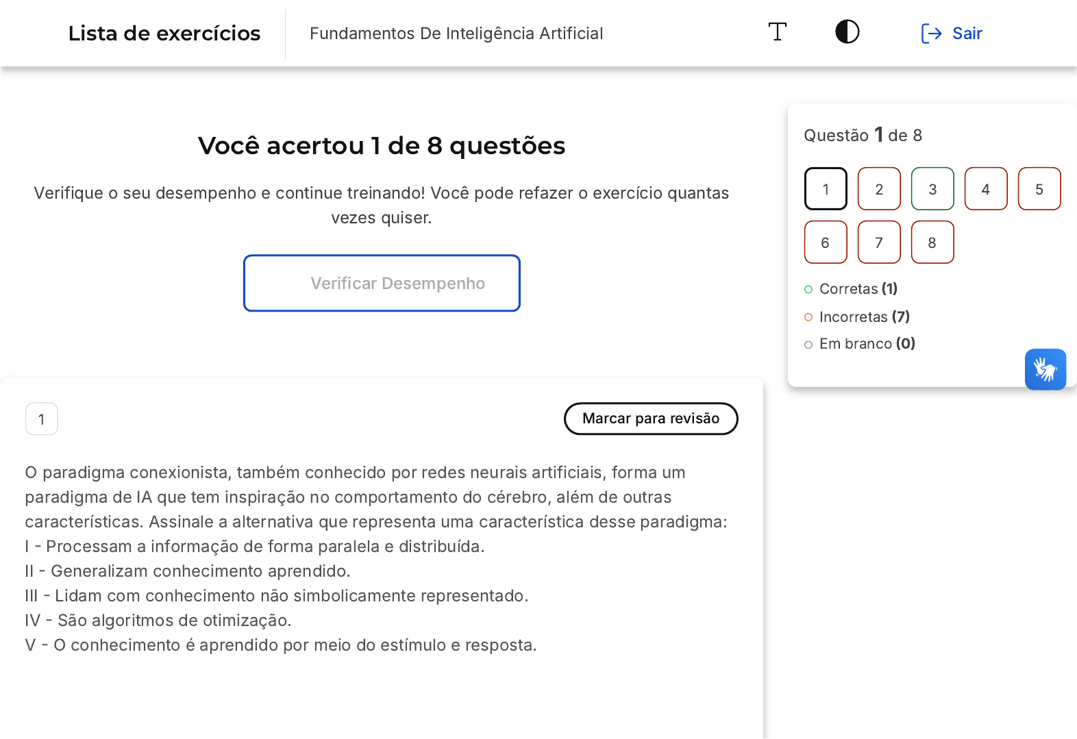 Você acertou 1 de 8 questões Verifique o seu desempenho e continue treinando! Você pode refazer o exercício quantas vezes quiser. Verificar Desempenho 1 Marcar para revisão O paradigma conexionista, também conhecido por redes neurais artificiais, forma um paradigma de IA que tem inspiração no comportamento do cérebro, além de outras características. Assinale a alternativa que representa uma característica desse paradigma: I - Processam a informação de forma paralela e distribuída. II - Generalizam conhecimento aprendido. III - Lidam com conhecimento não simbolicamente representado. IV - São algoritmos de otimização. V - O conhecimento é aprendido por meio do estímulo e resposta. Questão 1 de 8 Corretas (1) Incorretas (7) Em branco (0) 1 2 3 4 5 6 7 8 Lista de exercícios Fundamentos De Inteligência Artificial Sair A B C D E Apenas as afirmativas I, II e III estão corretas. Apenas as afirmativas I e V estão corretas. Apenas as afirmativas II e III estão corretas. Apenas as afirmativas I, II, III e V estão corretas. Apenas as afirmativas I, II e V estão corretas. Resposta incorreta Opa! A alternativa correta é a letra D. Confira o gabarito comentado! Gabarito Comentado O paradigma conexionista é baseado em modelos matemáticos simples de neurônios, formando uma rede neural capaz de simular a memória associativa humana. Diferentemente dos computadores clássicos, que acessam endereços, as redes neurais acessam conteúdos. Portanto, os algoritmos de redes neurais são parte integrante do paradigma conexionista. No entanto, os algoritmos de otimização não são uma característica desse paradigma, pois pertencem ao paradigma evolutivo, que A B C engloba um conjunto de técnicas de busca e otimização inspiradas na evolução natural das espécies. 2 Marcar para revisão Em relação à aplicação adequada das técnicas de Inteligência Artificial, avalie as afirmações a seguir. I - Indução em árvore de decisão é utilizada para identificação de fraudes em cartões de crédito. II - Redes neurais artificiais são utilizadas no desenvolvimento de sistemas de análise de risco em aplicações financeiras. III - Sistemas especialistas, baseados em regras, são utilizados na substituição do profissional especialista em diagnóstico de falhas em hardware. É correto o que se afirma em Apenas o item I está correto. Apenas o item III está correto. Os itens I e II estão corretos. D E Os itens II e III estão corretos. Os itens I, II e III estão corretos. Resposta incorreta Opa! A alternativa correta é a letra C. Confira o gabarito comentado! Gabarito Comentado As afirmações I e II estão corretas. A indução em árvore de decisão é uma técnica de Inteligência Artificial que pode ser utilizada para identificar fraudes em cartões de crédito, pois permite classificar e prever com base em padrões de dados. As redes neurais artificiais, por sua vez, são utilizadas no desenvolvimento de sistemas de análise de risco em aplicações financeiras, pois são capazes de aprender e melhorar suas previsões com base em dados históricos. No entanto, a afirmação III não está correta. Embora os sistemas especialistas sejam utilizados para simular o comportamento de um especialista, eles não substituem completamente o profissional, pois ainda é necessária a intervenção humana para a tomada de decisões complexas e para o diagnóstico de falhas em hardware. 3 Marcar para revisão Em relação aos assistentes pessoais virtuais, pode-se afirmar que: A B C D E I - A criação de assistentes pessoais virtuais é uma das aplicações de IA mais utilizadas. II - Os assistentes pessoais virtuais auxiliam nas tarefas básicas como definir alarmes, lembrar compromissos, ligar para outros números, informar a previsão do tempo, entre outras funcionalidades. III - Em 1962, a IBM apresentou Shoebox, o aparelho era do tamanho de uma caixa de sapatos, e além de reconhecer algumas palavras, também conseguia executar funções matemáticas. IV - Os assistentes pessoais estão cada vez mais em desuso, devido à evolução da tecnologia de robôs domésticos. Assinale a opção correta: Apenas o item IV está correto. Apenas o item II está correto Apenas os itens I e II estão corretos. Apenas os itens I, II e III estão corretos. Apenas os itens I, II e IV estão corretos. Resposta correta Parabéns, você selecionou a alternativa correta. Confira o gabarito comentado! Gabarito Comentado O assistente pessoal inteligente é um agente de software, que pode realizar tarefas ou serviços para um indivíduo. Essas tarefas ou serviços são baseados na entrada do usuário, geolocalização, e a capacidade de acessar informações de uma variedade de fontes on-line, tais como condições meteorológicas e de trânsito, notícias, os preços das ações, horários de usuários, entre outros. Ultimamente, tem se popularizado e hoje é uma das aplicações de IA mais utilizadas. O primeiro assistente surgiu em 1962, criado pela IBM. A alternativa IV está incorreta, pois os assistentes pessoais virtuais não estão em desuso, mas sim cada vez mais populares. 4 Marcar para revisão Em relação às definições sobre Inteligência Artificial, pode-se afirmar que: I - O campo de estudos que procura emular comportamento inteligente por meio de sistemas computacionais. II - A automação de atividades que associamos ao pensamento humano, atividades como tomadas de decisão, resolução de problemas, aprendizado etc. III - O estudo das computações que tornam possível perceber, raciocinar e agir. IV - A automação de atividades repetitivas realizadas por nós, seres humanos nas fábricas e indústrias, apenas. A B C D E Escolha a alternativa correta. Apenas os itens I e III estão corretos. Apenas os itens I, II e IV estão corretos. Apenas os itens II e III estão corretos. Apenas o item IV está correto. Os itens I, II e III estão corretos. Resposta incorreta Opa! A al