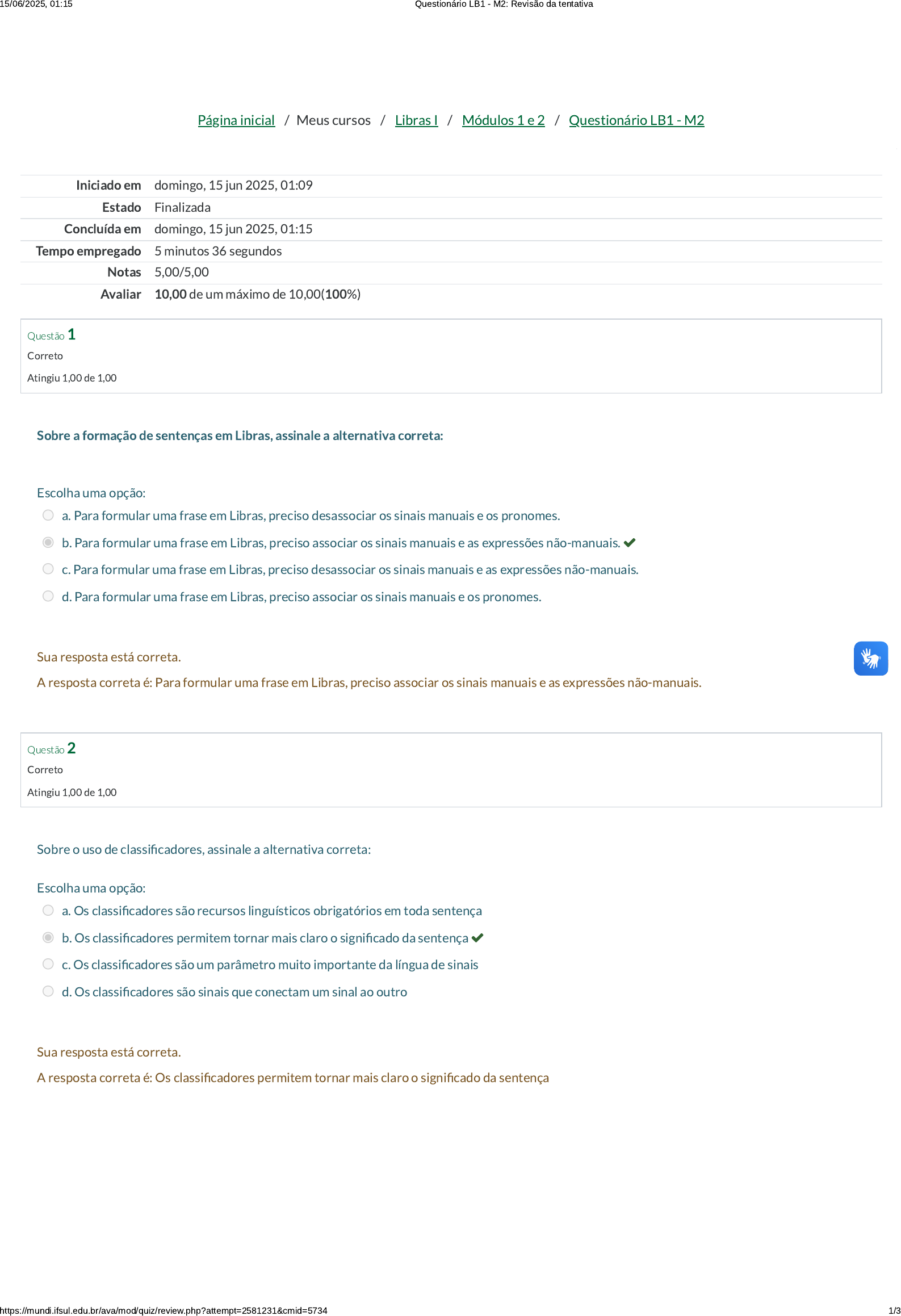 Página inicial / Meus cursos / Libras I / Módulos 1 e 2 / Questionário LB1 - M2 Iniciado em domingo, 15 jun 2025, 01:09 Estado Finalizada Concluída em domingo, 15 jun 2025, 01:15 Tempo empregado 5 minutos 36 segundos Notas 5,00/5,00 Avaliar 10,00 de um máximo de 10,00(100%) Questão 1 Correto Atingiu 1,00 de 1,00 Questão 2 Correto Atingiu 1,00 de 1,00 Sobre a formação de sentenças em Libras, assinale a alternativa correta: Escolha uma opção: a. Para formular uma frase em Libras, preciso desassociar os sinais manuais e os pronomes. b. Para formular uma frase em Libras, preciso associar os sinais manuais e as expressões não-manuais. c. Para formular uma frase em Libras, preciso desassociar os sinais manuais e as expressões não-manuais. d. Para formular uma frase em Libras, preciso associar os sinais manuais e os pronomes. Sua resposta está correta. A resposta correta é: Para formular uma frase em Libras, preciso associar os sinais manuais e as expressões não-manuais. Sobre o uso de classificadores, assinale a alternativa correta: Escolha uma opção: a. Os classificadores são recursos linguísticos obrigatórios em toda sentença b. Os classificadores permitem tornar mais claro o significado da sentença c. Os classificadores são um parâmetro muito importante da língua de sinais d. Os classificadores são sinais que conectam um sinal ao outro Sua resposta está correta. A resposta correta é: Os classificadores permitem tornar mais claro o significado da sentença 15/06/2025, 01:15 Questionário LB1 - M2: Revisão da tentativa https://mundi.ifsul.edu.br/ava/mod/quiz/review.php?attempt=2581231&cmid=5734 1/3 https://mundi.ifsul.edu.br/ava/ https://mundi.ifsul.edu.br/ava/course/view.php?id=316 https://mundi.ifsul.edu.br/ava/course/view.php?id=316§ion=1 https://mundi.ifsul.edu.br/ava/mod/quiz/view.php?id=5734 Questão 3 Correto Atingiu 1,00 de 1,00 Questão 4 Correto Atingiu 1,00 de 1,00 Questão 5 Correto Atingiu 1,00 de 1,00 Assinale a alternativa correta sobre o português sinalizado: Escolha uma opção: a. É quando seguimos sinal a sinal da Libras pensando na estrutura do português b. É quando seguimos sinal a sinal da Libras sem conectores c. É quando seguimos sinal a sinal da Libras sem classificadores d. É quando seguimos sinal a sinal da Libras pensando na estrutura da Libras Sua resposta está correta. A resposta correta é: É quando seguimos sinal a sinal da Libras pensando na estrutura do português Assinale a alternativa correta que contém somente pronomes interrogativos: Escolha uma opção: a. Eu, ela b. Porque, nós-dois c. O que, quando d. Onde, lá Sua resposta está correta. A resposta correta é: O que, quando Assinale a alternativa correta sobre tipos de classificadores: Escolha uma opção: a. Instrumental, de objeto b. Que especifica, visual c. Intuitivo, do corpo d. Descritivo, partes do corpo Sua resposta está correta. A resposta correta é: Descritivo, partes do corpo ◄ Questionário LB1 - M1 Seguir para... 15/06/2025, 01:15 Questionário LB1 - M2: Revisão da tentativa https://mundi.ifsul.edu.br/ava/mod/quiz/review.php?attempt=2581231&cmid=5734 2/3 https://mundi.ifsul.edu.br/ava/mod/quiz/view.php?id=5732&forceview=1 Questionáro LB1 - M3 ► 15/06/2025, 01:15 Questionário LB1 - M2: Revisão da tentativa https://mundi.ifsul.edu.br/ava/mod/quiz/review.php?attempt=2581231&cmid=5734 3/3 https://mundi.ifsul.edu.br/ava/mod/quiz/view.php?id=5736&forceview=1