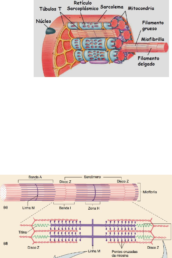 Fisiologia 08- Fisiologia Muscular Existem três tipos de células musculares: célula do músculo cardíaco, do músculo esquelético e do músculo liso, sendo as duas primeiras estriadas. Diferente dos outros tipos de células, as do músculo esquelético só respondem frente a um estímulo de um motoneurônio. O músculo é formado por pequenos conjuntos de fibras musculares (cada fibra corresponde a uma célula, com vários núcleos), formando feixes, revestidos de tecido conjuntivo, chamado de fascículo muscular. A membrana celular no músculo é chamada de sarcolema e o citoplasma é chamado de sarcoplasma. A sua membrana possui várias invaginações, formando uma rede de túneis, chamados de Túbulos T, que estão em contato direto com o que está fora de célula, ou seja, o líquido que está fora da célula também está dentro desses túbulos. Outro componente importante é o Retículo Sarcoplasmático, que serve com um reservatório de Ca+. O retículo possui 2 porções: os túbulos longitudinais e a cisterna terminal, que está em contato com o túbulo T. Passando por entre os túbulos, existem as miofibrilas, proteínas que se arranjam longitudinalmente, envolvidas na contração das fibras. Existe uma associação física entre o reticulo sarcoplasmático e o túbulo T, que em alguns momentos ficam bem próximos, chamado de tríade. Para que a célula contraia, é necessário que os níveis de cálcio dentro da célula aumentem, e como o retículo é um grande reservatório de cálcio, esse Ca+ sai do retículo para a célula (através de um sinal elétrico) e gere a contração. Para que esse sinal de cálcio aconteça por toda a profundidade da célula, ele passa pelos túbulos T, se não ele ficaria restrito a apenas a superfície da célula. As miofibrilas é formada por unidades funcionais chamadas de sarcomêro, composta por dois discos Z (ancoragem dos filamentos finos- actina) e os filamentos entre eles. No meio do sarcomêro está a linha M (ancoragem dos filamentos grossos- miosina). A porção mais escura da miofibrila é chamada de banda A, formada pela sobreposição dos filamentos, e a porção mais clara é formada pelos filamamentos de actina, chamada de banda I, a zona entre elas é chamada de zona H. O filamento grosso é formado por moléculas de miosina (corpo + porção flexível + 2 cabeças). A porção flexível e as cabeças podem interagir com os filamentos finos, formando as chamadas pontes cruzadas. Suas cabeças possuem atividade ATPase, capazes de hidrolisar ATP, que irá ser fonte de energia no processo de contração. Já o filamento fino, é composto por um conjunto moléculas de actina G, que se plimeriza formando actina F, que quando enrolados 2 a 2 formam o filamento fino. Enrolado em volta de tudo isso, está a molécula de tropmiosina (bloqueia o sitio de ligação na actina G) e presa a ela está a troponina. Cada actina G possui um sítio de ligação, que é onde a cabeça de miosina interage. Existe uma molécula chamada titina que está ancorando o filamento de miosina ao disco Z, importante para manter toda essa estrutura na posição e prover ao tecido alguma capacidade elástica. A contração muscular se dá pelo deslizamento dos filamentos de actina por entre os filamentos de miosina, causando um encurtamento dos sarcomêros. Um ATP se liga a cabeça de miosina e é hidrolisado, mas seus produtos permanecem nas cabeças (ADP), mas as cabeças não se ligam às moléculas de actina G devido a tropomiosina (situação de repouso). Essa situação muda quando um sinal de cálcio entra na célula, fazendo com que o cálcio de se ligue a uma subunidade da troponina, fazendo com que a tropomiosina mude de conformação, expondo o sítio ativo da actina. Quando a miosina se liga à actina ela se movimenta em direção a linha M, de modo a puxar o filamento de actina, esse movimento feito pelas pontes cruzadas é chamado de movimento de força. A energia necessária para movimentar as pontes cruzadas vem da hidrolise do ATP feita nas cabeças da miosina. O ciclo de contração e relaxamento se inicia de um estado chamado de estado de rigidez, no qual a cabeça de miosina está ligada a actina e já está dobrada (músculo contraído). Quando o ATP se liga a cabeça de miosina, ela se solta da actina. Como a miosina tem a capacidade de hidrolisar o ATP, ela usa essa energia para engatilhar a cabeça na posição original (músculo relaxado). Com o sinal de cálcio, os sítios ativos ficam expostos e as cabeças de miosina se ligam a actina e dobram. A miosina libera o ADP, voltando ao estado de rigidez. Para sair da situação de contração o ATP precisa se ligar a cabeça de miosina, o que se não ocorrer a actina e a miosina não se soltam; o que não acontecer depois que um organismo vivo morre: Rigor Mortis.