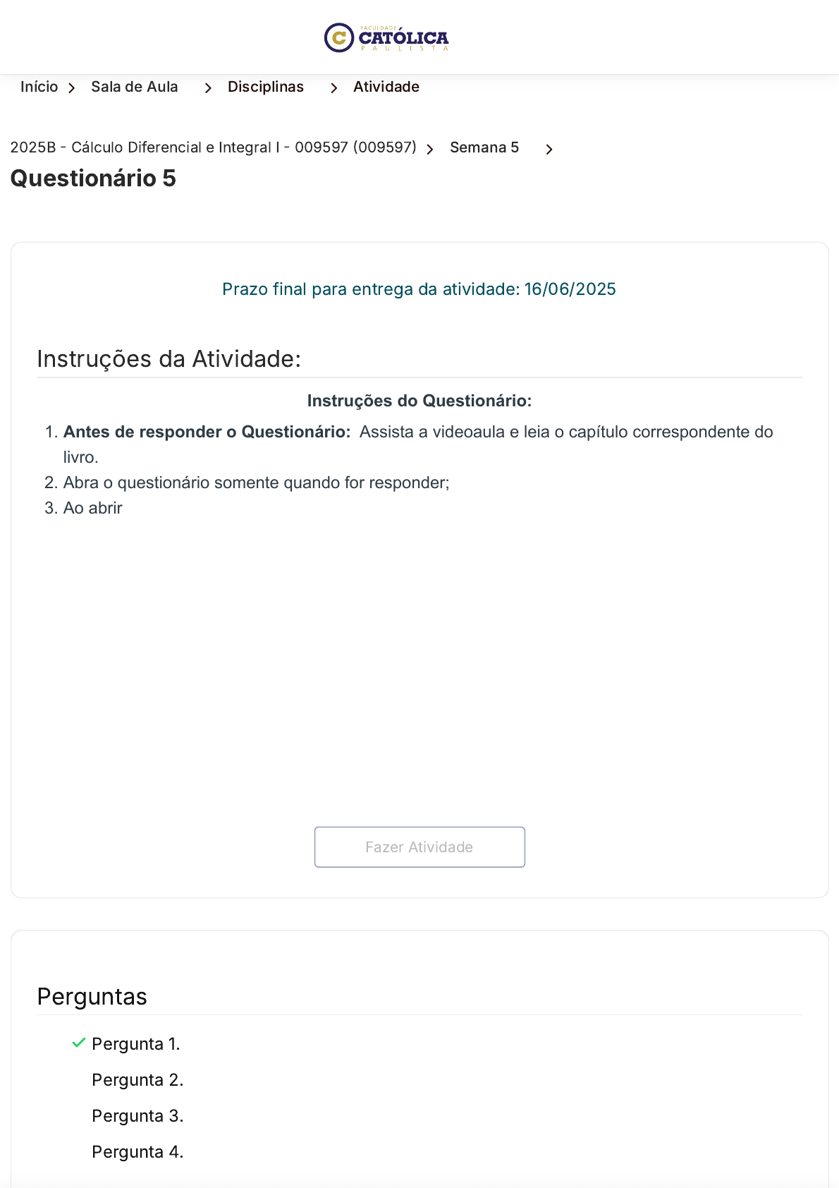 Início 〉 Sala de Aula 〉 Disciplinas 〉 Atividade 2025B - Cálculo Diferencial e Integral I - 009597 (009597) 〉 Semana 5 〉 Questionário 5 Instruções da Atividade: Prazo final para entrega da atividade: 16/06/2025 Instruções do Questionário: 1. Antes de responder o Questionário: Assista a videoaula e leia o capítulo correspondente do livro. 2. Abra o questionário somente quando for responder; 3. Ao abrir o questionário você terá 4 questões para responder; 4. Leia com calma todas as questões e entenda o que pede a questão: se pede a incorreta, a correta e qual o tema da questão; 5. Lembre-se de Clicar no botão "Enviar"; 6. Você tem duas tentativas para fazer o teste, a segunda tentativa é opcional; 7. Lembre-se que as respostas mudam de lugar em cada tentativa; 8. As respostas corretas só aparecem após o envio da segunda tentativa; 9. O sistema considera a maior nota entre as duas tentativas; 10. Lembre-se que na segunda tentativa zera TODAS as questões, inclusive as que você acertou na primeira tentativa. Bons estudos! Perguntas Pergunta 1. Pergunta 2. Pergunta 3. Pergunta 4. Fazer Atividade https://ava.uca.edu.br/aluno/sala-de-aula/disciplina/modulo/atividade/401358 https://ava.uca.edu.br/aluno/sala-de-aula/disciplina/modulo/atividade/401358 https://ava.uca.edu.br/aluno/sala-de-aula/disciplina https://ava.uca.edu.br/aluno/sala-de-aula/disciplina/modulo/atividade/:id/:nome javascript:void(0); pontos: 0,100Pergunta 1. Para a função 𝑓(𝑥) = 18𝑥 + 3𝑥² - 4𝑥³ e seus extremos, leia as asserções que seguem: I. A função tem três pontos críticos II. Os pontos críticos da função são: -1 e 3 2 III. A função tem um valor máximo local em 3 2 IV. A função tem valor mínimo local em -1 Múltipla Escolha: A. Apenas I, III e IV. B. Apenas III e IV. C. Apenas II. D. I, II, III e IV. E. Apenas II, III e IV. pontos: 0,100Pergunta 2. O polinômio de Taylor de grau 1 de 𝑓(𝑥) ao redor de 𝑐 é dado por P₁ (𝑥) = 𝑓(𝑐) + 𝑓'(𝑐)(𝑥 - 𝑐). Sabendo disso, assinale a alternativa que contenha o polinômio de Taylor de grau 1 da função 𝑓(𝑥) = (1 - x)⁻² ao redor do ponto zero: Múltipla Escolha: javascript:void(0); A. P₁ (𝑥) = 2 + 𝑥 B. P₁ (𝑥) = 2 + 𝑥² C. P₁ (𝑥) = 1 D. P₁ (𝑥) = 1 + 2𝑥 E. P₁ (𝑥) = 1 + 𝑥 pontos: 0,100Pergunta 3. Encontre o polinômio de Taylor de ordem 4 da função 𝑓(𝑥) = 𝑒ˣ no ponto c=0 e assinale a alternativa correta: Múltipla Escolha: A. B. C. D. E. javascript:void(0); pontos: 0,100Pergunta 4. Utilizando a regra de L’Hôpital, determine e assinale a alternativa correta: Múltipla Escolha: A. 6 B. 2 C. 5 D. ∞ E. 0 Fechar Atividade Salvo: 15/06/2025 09:44:06 Entregar Atividade 〈 Voltar aos Módulos javascript:void(0); 〈 Anterior Próxima 〉 Faculdade Católica Paulista Contato Endereço Avenida Cristo Rei, 305 – Banzato Marília, São Paulo – CEP: 17515-200 Horário De Funcionamento Segunda a quinta, das 8:00 às 20:00 horas As sextas, das 8:00 às 18:00 horas. WhatsApp : (14) 9.8826-3000 Telefone Sede: (14) 3422-1815 Central de Atendimento: 0800 664 5583 E-mail : secretaria@uca.edu.br https://www.instagram.com/faculdadecatolicaead/ https://facebook.com/ucaead https://www.youtube.com/@UcaEduBr https://www.linkedin.com/school/faculdade-catolica-paulista/?originalSubdomain=br https://maps.app.goo.gl/wWsD9QX5fVPa3h6PA https://api.whatsapp.com/send?phone=5514988263000&text=Suporte tel:14-3422-1815 tel:14-3422-1815 tel:0800-664-5583 tel:0800-664-5583 mailto:secretaria@uca.edu.br javascript:void(0);
