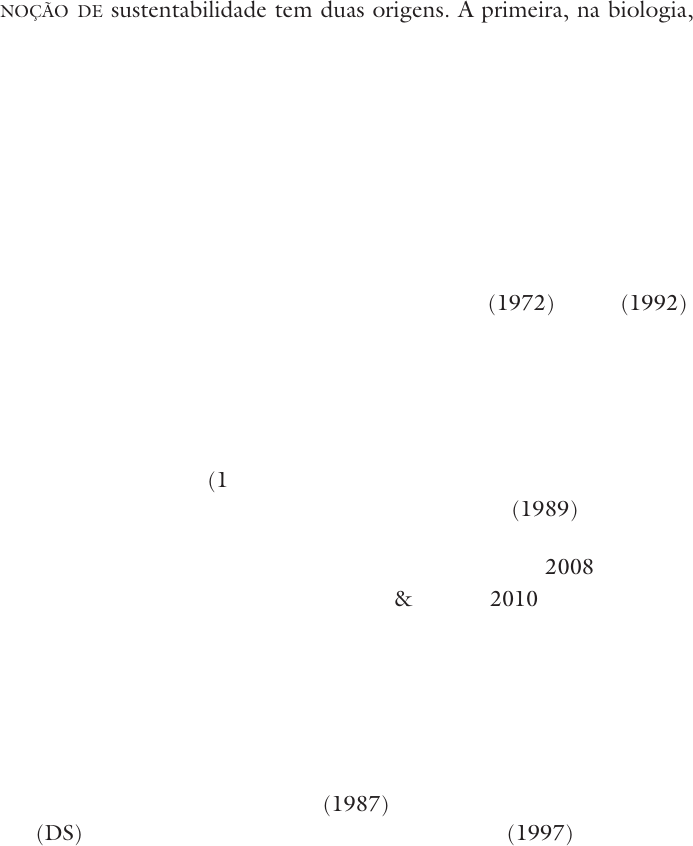 estudos avançados 26 (74), 2012 51 Introdução noção de sustentabilidade tem duas origens. A primeira, na biologia, por meio da ecologia. Refere-se à capacidade de recuperação e reprodu- ção dos ecossistemas (resiliência) em face de agressões antrópicas (uso abusivo dos recursos naturais, desflorestamento, fogo etc.) ou naturais (terre- moto, tsunami, fogo etc.). A segunda, na economia, como adjetivo do desen- volvimento, em face da percepção crescente ao longo do século XX de que o padrão de produção e consumo em expansão no mundo, sobretudo no último quarto desse século, não tem possibilidade de perdurar. Ergue-se, assim, a noção de sustentabilidade sobre a percepção da finitude dos recursos naturais e sua gradativa e perigosa depleção. Nos embates ocorridos nas reuniões de Estocolmo (1972) e Rio (1992), nasce a noção de que o desenvolvimento tem, além de um cerceamento ambien- tal, uma dimensão social. Nessa, está contida a ideia de que a pobreza é provo- cadora de agressões ambientais e, por isso, a sustentabilidade deve contemplar a equidade social e a qualidade de vida dessa geração e das próximas. A solidarie- dade com as próximas gerações introduz, de forma transversal, a dimensão ética. O relatório Brundtland (1987) abriu um imenso debate na academia sobre o significado de desenvolvimento sustentável. Pearce et al. (1989) mostravam uma quantidade razoável de definições. Hoje, há um verdadeiro mar de literatu- ra que aborda o tema das maneiras mais diversas (Wackermann, 2008). Defendemos em outro texto (Nascimento & Costa, 2010), presente tam- bém em Nobre & Amazonas (2002), que o Desenvolvimento Sustentável (DS) se tornou um campo de disputa, no sentido utilizado por Bourdieu, com múltiplos discursos que ora se opõem, ora se complementam. O domínio da polissemia é a expressão maior desse campo de forças, que passa a condicionar posições e medidas de governos, empresários, políticos, movimentos sociais e organismos multilaterais. Na academia, o debate e as interpretações não poderiam deixar de se fa- zer presentes. Como exemplo, Redclift (1987) considera o Desenvolvimento Sustentável (DS) uma ideia poderosa, enquanto Richardson (1997) chama-o de fraude, pois tenta esconder a contradição entre a finitude dos recursos natu- Trajetória da sustentabilidade: do ambiental ao social, do social ao econômico Elimar PinhEiro do nascimEnto A Highlight Highlight estudos avançados 26 (74), 201252 rais e o caráter desenvolvimentista da sociedade industrial. Já O’Riordan (1993), apoiado por Dryzeh (1997), é de opinião que o DS traz em si a ambiguidade de conceitos, como os de justiça e democracia, e que não por isso eles deixam de ser relevantes. Por sua vez, Baudin (2009) vai concebê-lo como uma nova ideologia. No Brasil, Machado (2005) defende que o DS é um discurso, conforme a proposição de Foucault; enquanto Nobre & Amazonas (2002) afirmam que é um conceito político-normativo, noção que já estava presente no Relatório Brundtland. Veiga (2010), no entanto, fará uma defesa interessante – de que se trata antes de tudo de um novo valor. Na sua assimilação pela sociedade, encon- tra-se a possibilidade da adoção de medidas que venham efetivamente a mudar o rumo do desenvolvimento, levando-o da jaula do crescimento econômico ma- terial para a liberdade do desenvolvimento humano, enquanto ampliação das oportunidades (Sen, 2000). As questões que orientaram a construção deste texto foram as seguintes: em que consiste a sustentabilidade, entendida como um adjetivo do desenvol- vimento? Qual a sua trajetória, natureza e implicações para a sociedade atual? Onde se encontra o centro de sua concepção? Assim, o texto está dividido em quatro partes. Na primeira, desenham-se, de forma sucinta, as origens e o contexto do surgimento da noção da susten- tabilidade, transformada em Desenvolvimento Sustentável (DS) por meio dos embates na arena internacional. Na segunda, examina-se a questão das dimen- sões do desenvolvimento sustentável mostrando os limites de uma compreensão restrita a três – ambiental, econômica e social. Na terceira, são apresentadas pistas sobre a relevância, hoje, da sustentabilidade. Na quarta, analisam-se três respostas, atualmente em construção, à crise ambiental. Conclui-se indagando sobre as mudanças na trajetória da noção de desenvolvimento sustentável. Origens e contexto A ideia de sustentabilidade ganha corpo e expressão política na adjetivação do termo desenvolvimento, fruto da percepção de uma crise ambiental global. Essa percepção percorreu um longo caminho até a estruturação atual, cujas ori- gens mais recentes estão plantadas na década de 1950, quando pela primeira vez a humanidade percebe a existência de um risco ambiental global: a poluição nu- clear. Os seus indícios alertaram os seres humanos de que estamos em uma nave comum, e que problemas ambientais não estão restritos a territórios limitados. “A ocorrência de chuvas radiativas a milhares de quilômetros dos locais de reali- zação dos testes acendeu um caloroso debate no seio da comunidade científica” (Machado, 2005). Entre 1945 e 1962, os países detentores do poder atômico realizaram 423 detonações atômicas. Outro momento dessa trajetória da percepção da crise ambiental se deu em torno do uso de pesticidas e inseticidas químicos, denunciado pela bióloga Rachel Carson. Seu livro silent spring vendeu mais de meio milhão de cópias, e em 1963 já estava traduzido em 15 países (McCormick, 1992).1 estudos avançados 26 (74), 2012 53 Esses eventos tocaram a mídia e os governos, mas foi o movimento am- bientalista o maior beneficiário. Segundo McCormick (1992), naquela época, as cinco maiores organizações conservacionistas nos Estados Unidos tiveram crescimento de seus membros da ordem de 17% por ano. As chuvas ácidas sobre os países nórdicos levaram a
