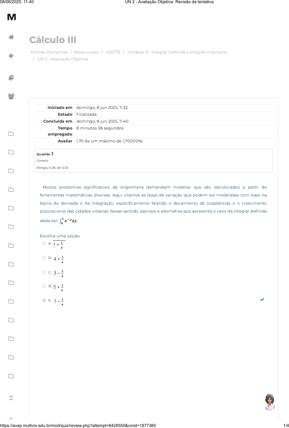Minhas Disciplinas / Meus cursos / 420775 / Unidade 2 - Integral Definida e Integral Imprópria / UN 2 - Avaliação Objetiva Cálculo III Iniciado em domingo, 8 jun 2025, 11:32 Estado Finalizada Concluída em domingo, 8 jun 2025, 11:40 Tempo empregado 8 minutos 38 segundos Avaliar 1,70 de um máximo de 1,70(100%) Questão 1 Correto Atingiu 0,34 de 0,34 Muitos problemas significativos da engenharia demandam modelos que são estruturados a partir de ferramentas matemáticas diversas. Aqui, citamos as taxas de variação que podem ser modeladas com base na teoria da derivada e da integração, especificamente falando o decaimento de substâncias e o crescimento populacional das cidades urbanas. Nesse sentido, assinale a alternativa que apresenta o valor da integral definida dada por Escolha uma opção: a. b. c. d. e. 08/06/2025, 11:40 UN 2 - Avaliação Objetiva: Revisão da tentativa https://avap.multivix.edu.br/mod/quiz/review.php?attempt=8428550&cmid=1877385 1/4 https://avap.multivix.edu.br/my/ https://avap.multivix.edu.br/course/view.php?id=33084 https://avap.multivix.edu.br/course/view.php?id=33084§ion=3 https://avap.multivix.edu.br/mod/quiz/view.php?id=1877385 https://avap.multivix.edu.br/my/ https://avap.multivix.edu.br/course/view.php?id=33084 https://avap.multivix.edu.br/user/index.php?id=33084 https://avap.multivix.edu.br/course/view.php?id=33084§ion=1 https://avap.multivix.edu.br/course/view.php?id=33084§ion=2 https://avap.multivix.edu.br/course/view.php?id=33084§ion=3 https://avap.multivix.edu.br/course/view.php?id=33084§ion=4 https://avap.multivix.edu.br/course/view.php?id=33084§ion=5 https://avap.multivix.edu.br/course/view.php?id=33084§ion=6 https://avap.multivix.edu.br/course/view.php?id=33084§ion=7 https://avap.multivix.edu.br/course/view.php?id=33084§ion=8 https://avap.multivix.edu.br/course/view.php?id=33084§ion=9 https://avap.multivix.edu.br/course/view.php?id=33084§ion=10 https://avap.multivix.edu.br/course/view.php?id=33084§ion=11 https://avap.multivix.edu.br/course/view.php?id=33084§ion=12 https://avap.multivix.edu.br/course/view.php?id=33084§ion=13 https://avap.multivix.edu.br/course/view.php?id=33084§ion=14 https://avap.multivix.edu.br/hooks/portal/ https://avap.multivix.edu.br/mod/page/view.php?id=1252%2F%22%20target%3D%22_blank https://avap.multivix.edu.br/ https://avap.multivix.edu.br/ https://avap.multivix.edu.br/ https://avap.multivix.edu.br/ https://avap.multivix.edu.br/ Questão 2 Correto Atingiu 0,34 de 0,34 Questão 3 Correto Atingiu 0,34 de 0,34 A resolução de problemas no âmbito da Física e da Engenharia, em diversas situações, depende da interpretação de áreas de regiões e volumes de sólidos de revolução. Assim sendo, na solução de problemas com essa tipologia, necessitamos das integrais definidas. Nesse sentido, assinale a alternativa que representa o valor da área da figura do plano euclidiano delimitada pelos gráficos das funções elementares y = x e y = x²: Escolha uma opção: a. 10 m². b. 8 m². c. 2 m². d. 1 m². e. m². 1 6 A mecânica é a parte da Física que tem por intuito o estudo dos movimentos dos corpos e das forças de interação entre eles, sendo dividida em três partes: cinemática, dinâmica e estática. Essas três partes são amplamente utilizadas em modelagens diversas no contexto da Engenharia. Nesse sentido, suponha que um objeto se mova no eixo das abscissas com base em um movimento retilíneo e uniforme, com velocidade dada em função do tempo por v(t) = 7 – t. Logo, o valor do deslocamento de tal objeto no intervalo de tempo [1, 2] seria: Escolha uma opção: a. 4,5 u.c. b. 5,5 u.c. c. 8,5 u.c. d. 2,5 u.c. e. 7,5 u.c. 08/06/2025, 11:40 UN 2 - Avaliação Objetiva: Revisão da tentativa https://avap.multivix.edu.br/mod/quiz/review.php?attempt=8428550&cmid=1877385 2/4 https://avap.multivix.edu.br/my/ https://avap.multivix.edu.br/course/view.php?id=33084 https://avap.multivix.edu.br/user/index.php?id=33084 https://avap.multivix.edu.br/course/view.php?id=33084§ion=1 https://avap.multivix.edu.br/course/view.php?id=33084§ion=2 https://avap.multivix.edu.br/course/view.php?id=33084§ion=3 https://avap.multivix.edu.br/course/view.php?id=33084§ion=4 https://avap.multivix.edu.br/course/view.php?id=33084§ion=5 https://avap.multivix.edu.br/course/view.php?id=33084§ion=6 https://avap.multivix.edu.br/course/view.php?id=33084§ion=7 https://avap.multivix.edu.br/course/view.php?id=33084§ion=8 https://avap.multivix.edu.br/course/view.php?id=33084§ion=9 https://avap.multivix.edu.br/course/view.php?id=33084§ion=10 https://avap.multivix.edu.br/course/view.php?id=33084§ion=11 https://avap.multivix.edu.br/course/view.php?id=33084§ion=12 https://avap.multivix.edu.br/course/view.php?id=33084§ion=13 https://avap.multivix.edu.br/course/view.php?id=33084§ion=14 https://avap.multivix.edu.br/hooks/portal/ https://avap.multivix.edu.br/mod/page/view.php?id=1252%2F%22%20target%3D%22_blank https://avap.multivix.edu.br/ https://avap.multivix.edu.br/ https://avap.multivix.edu.br/ https://avap.multivix.edu.br/ https://avap.multivix.edu.br/ Questão 4 Correto Atingiu 0,34 de 0,34 Questão 5 Correto Atingiu 0,34 de 0,34 Na confecção de projetos arquitetônicos, temos a presença em termos substanciais de áreas e volumes, relacionados diretamente a planos e superfícies, das mais variadas formas. Dessa maneira, ferramentas matemáticas são importantes para a descrição de modelos que representem tal abordagem. Todavia, existem outras situações extremas que as variações não são finitas e, por conseguinte, a tratativa demanda de teorias mais complexas, como podemos evidenciar em escoamentos ou vazão sem limites ou fim, assim, surge a necessidade das integrais impróprias. Nesse sentido, considerando a funçãodada por , com t ≥ 1, assinale a alternativa correta sobre a integral imprópria Escolha uma opção: a. É divergente. b. Diverge para t negativo. c. Diverge para t positivo. d. É convergente.