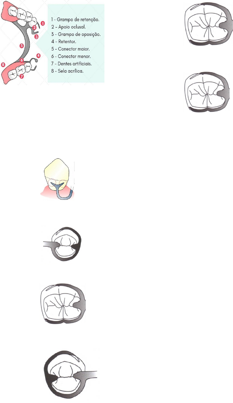 SISTEMA DE RETENÇÃO E ESTABILIDADE ( GRAMPOS) COMPONENTES DA PPR EQUADOR PRÓTETICO PRINCIPIOS FUNDAMENTAIS DOS GRAMPOS · RETENÇÃO-ponta ativa do braço de retenção · SUPORTE OU FIXAÇÃO-apoio · RECIPROCIDADE-braço de oposição · ESTABILIDADE-apoios e o corpo da prótese · ABRAÇAMENTO-circunscrição de 180 do braço retentor e o braço opositor. · PASSIVIDADE-braço retentor quando for preciso. TIPOS DE GRAMPOS GRAMPOS DE AÇÃO DE PONTA OU ROACH · Apenas a ponta ativa do braço de retenção faz contato com o dente. · Direcionamento da cervical para oclusal · O braço retentivo sai da sela em direção ao dente,tangenciando a mucosa. GRAMPOS CIRCUNFERENCIAIS · Braço de retenção em toda extensão do dente. · Direcionamento-oclusal a cervical SELEÇÃO DOS RETENTORES 1. Extremidade livre 2. Dentes anteriores 3. Dentes posteriores 4. Molares mesializado EXTREMIDADELIVRE · T-espaço intercalar extenso,2 áreas retentivas,ângulo de 90 graus,incisivos,caninos e prés em extremo livre · U-2 áreas retentivas,braço retentor em forma de u,coroas curtas e 3 molar. · L-retenção longe do espaço protético(mesial)braço retentor em forma de L · I-área retentiva no terço médio ou disto- vestibular · C-área retentiva adjacente á área desdentada,distal · 7-modificação do grampo T,1 área retentiva,pré molares,menor torque sobre o dente pilar. · RPI-não tem braço opositor,tem stop,modificação do grampo I,estético,menor torque no dente pilar · AÇÃO POSTERIOR-um único braço sendo retentor e opositor,pré molar com recessão gengival. DENTES ANTERIORES -barra de kennedy · Apoio e conectores menores · Anteriores com mobilidade · Grampo passivo para a estabilidade · Retenção indireta -mdl modificado · Caninos e incisivos · Contra indicado para quando não há espaços interoclusal adequado - quereilhac · Caninos superiores · Reanatomização necessária Premolarizar o canino. DENTES POSTERIORES · QUEREILHAC-pré molares superiores · SIMPLES-área retentiva longe do espaço protético,espaço protético dentossuportado · GILLET-molares mesializados,área de retenção vizinha ao espaço protético,contra indicado:dente com suporte reduzido · REVERSO-molares mesializados,área de retenção vizinha ao espaço protético,limitação-localizaão do conector menor · GÊMEO-molar e pré molar,retenção indireta,limitação-desgate da caneleta e áreas ,retentivas(duas) · ANEL-dente suporte isolado,limitação estética,retentor extremamente rígido · OTTOLENGUI-molares e pré molares isolados,espaço dentosuportado,área de retenção oposta ao espaço protético · HALF-HALF-pré molares e molares isolados entre dois espaços intercalares image4.png image5.png image6.png image7.jpg image8.jpg image9.jpg image10.png image1.jpeg image2.jpeg image3.jpg