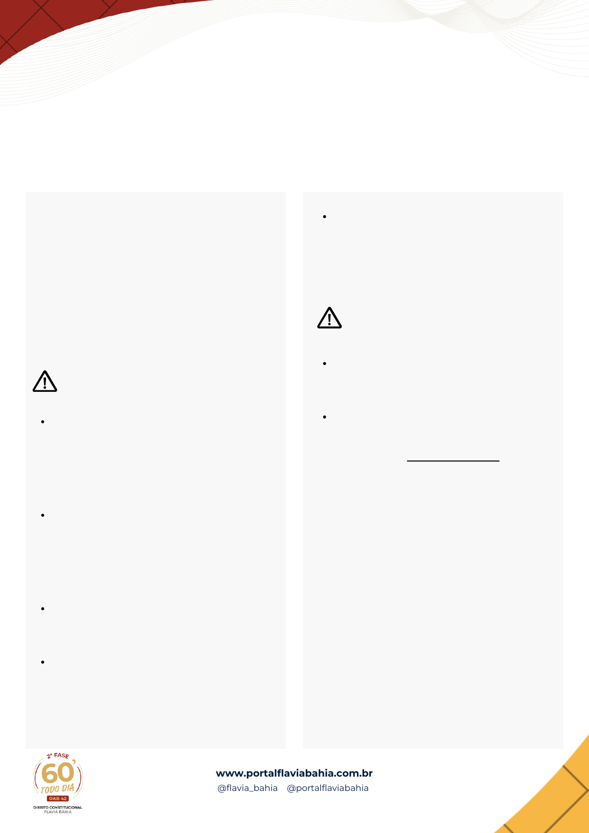 SEMANA DE REVISÃO SIMULADO EXTRA www.portalflaviabahia.com.br @flavia_bahia @portalflaviabahia OAB EXAME 42 2ª FASE Na próxima página, você terá acesso ao nosso SIMULADO EXTRA - SEMANA DE REVISÃO - 42o Exame de Ordem, e, pensando em auxiliá-lo da melhor maneira na elaboração do simulado, abaixo listamos todas as instruções necessárias para a sua realização. Instruções a serem observadas quando da realização do simulado: O simulado deverá ser realizado de forma manuscrita, em letra legível, com caneta esferográfica de tinta azul ou preta e, preferencialmente, nas folhas de respostas fornecidas pelo curso. Instruções a serem observadas após a elaboração do simulado: O espelho de correção do Simulado será disponibilizado no presente grupo de WhatsApp hoje (14/02), às 12h. O simulado será corrigido pela profa. Flavia Bahia, em aula ao vivo, hoje (14/02) às 14h. A aula ficará disponível no canal do youtube do Portal Flavia Bahia. O simulado valerá 10,00 (dez) pontos e será composto de duas partes: redação de peça profissional, valendo 5,00 (cinco) pontos e respostas a 4 (quatro) questões discursivas, valendo 1,25 (um e vinte e cinco) pontos cada; No momento de realização do treinamento, desligue-se ao máximo do ambiente exterior, não executando nenhuma atividade além do simulado, para que o dia da prova seja semelhante e confortável para você; Escolha um ambiente tranquilo e livre de distrações. Desligue os celulares e não faça uso da internet; Acesse apenas a legislação durante a realização do simulado; Olá, querida aluna, querido aluno, Jogue duro! Vai ser lindo! https://www.youtube.com/@PortalFlaviaBahia PEÇA PRÁTICO-PROFISSIONAL Amanda Lobo, depois de muita dedicação aos estudos, foi aprovada em décimo quinto lugar no concurso público para ocupar o cargo de médica cardiologista no hospital municipal de Zeta, localizado no estado Alfa, tendo preenchido todos os requisitos estabelecidos em lei e no edital do referido concurso. Como o edital previa catorze vagas para o cargo e todos os aprovados entre o primeiro e o décimo quarto lugar foram empossados, Amanda ficou na expectativa de ser chamada dentro do prazo previsto no edital de convocação. Ocorre que apenas três meses depois que os catorze convocados tomaram posse, o prefeito de Zeta anunciou a abertura de novo concurso público para o mesmo cargo, ignorando que ainda estava em curso o prazo previsto no edital de convocação do concurso no qual Amanda havia participado e obtido a aprovação. Em posse de todos os documentos que comprovavam a sua aprovação e abertura de novo certame, assim como o preenchimento dos requisitos legais e editalícios, Amanda solicitou ao prefeito a sua imediata convocação para posse, invocando a prioridade sobre eventuais outros concursados para assumir o referido cargo, mas teve a negativa, por escrito, do seu direito à nomeação, o que a levou a impetrar um Mandado de Segurança perante o juiz de direito competente. Após trinta dias de tramitação dos autos, surge sentença que julga improcedente o pedido, confirmando a legalidade da recusa, por ausência de direito à nomeação. A decisão restou clara, sem qualquer vício de omissão, contradição ou obscuridade. Foram opostos embargos de declaração, os quais foram rejeitados. Por isso, Amanda Lobo procurou você, como advogado (a), para apresentar o recurso pertinente. Redija a peça recursal cabível ao tema. (Valor: 5,00) Obs: a peça deve abranger todos os fundamentos de Direito que possam ser utilizados para dar respaldo à pretensão. A simples menção ou transcrição do dispositivo legal não confere pontuação. ATENÇÃO Na elaboração dos textos da peça profissional e das respostas às questões discursivas, o examinando deverá incluir todos os dados que se façam necessários, sem, contudo, produzir qualquer identificação ou informações além daquelas fornecidas e permitidas nos enunciados contidos no caderno de prova. A omissão de dados que forem legalmente exigidos ou necessários para a correta solução do problema proposto acarretará em descontos na pontuação atribuída ao examinando nesta fase. O examinando deve estar atento para não gerar nenhum dado diferente que dê origem a uma marca identificadora. A detecção de qualquer marca identificadora no espaço destinado à transcrição dos textos definitivos acarretará a anulação da prova prático-profissional e a eliminação do examinando. Assim, por exemplo, no fechamento da peça, o examinando deve optar por utilizar apenas “reticências” ou “XXX”, ou seja: Advogado “...” ou Advogado “XXX”, Data “...” ou Data “XXX”, Local “...” ou Local “XXX”, destacando-se que, no corpo das respostas, o examinando não deverá criar nenhum dado gerador de marca de identificação. 2ª FASE 42º EXAME OAB Direito Constitucional Prova Prática - Página 3 OAB EXAME 42 2ª FASE 1 2 3 4 5 6 7 8 9 10 11 12 13 14 15 16 17 18 19 20 21 22 23 24 25 26 27 28 29 30 OAB EXAME 42 2ª FASE 2ª FASE 42º EXAME OAB Direito Constitucional Prova Prática - Página 4 31 32 33 34 35 36 37 38 39 40 41 42 43 44 45 46 47 48 49 50 51 52 53 54 55 56 57 58 59 60 OAB EXAME 42 2ª FASE 2ª FASE 42º EXAME OAB Direito Constitucional Prova Prática - Página 5 61 62 63 64 65 66 67 68 69 70 71 72 73 74 75 76 77 78 79 80 81 82 83 84 85 86 87 88 89 90 OAB EXAME 42 2ª FASE 2ª FASE 42º EXAME OAB Direito Constitucional Prova Prática - Página 6 91 92 93 94 95 96 97 98 99 100 101 102 103 104 105 106 107 108 109 110 111 112 113 114 115 116 117 118 119 120 OAB EXAME 42 2ª FASE 2ª FASE 42º EXAME OAB Direito Constitucional Prova Prática - Página 7 121 122 123 124 125 126 127 128 129 130 131 132 133 134 135 136 137 138 139 140 141 142 143 144 145 146 147 148 149 150 OAB EXAME 42 2ª FASE 2ª FASE 42º EXAME OAB Direito Constitucional Prova Prática - Página 8 Questão 1 Diversas leis ordinárias estadua