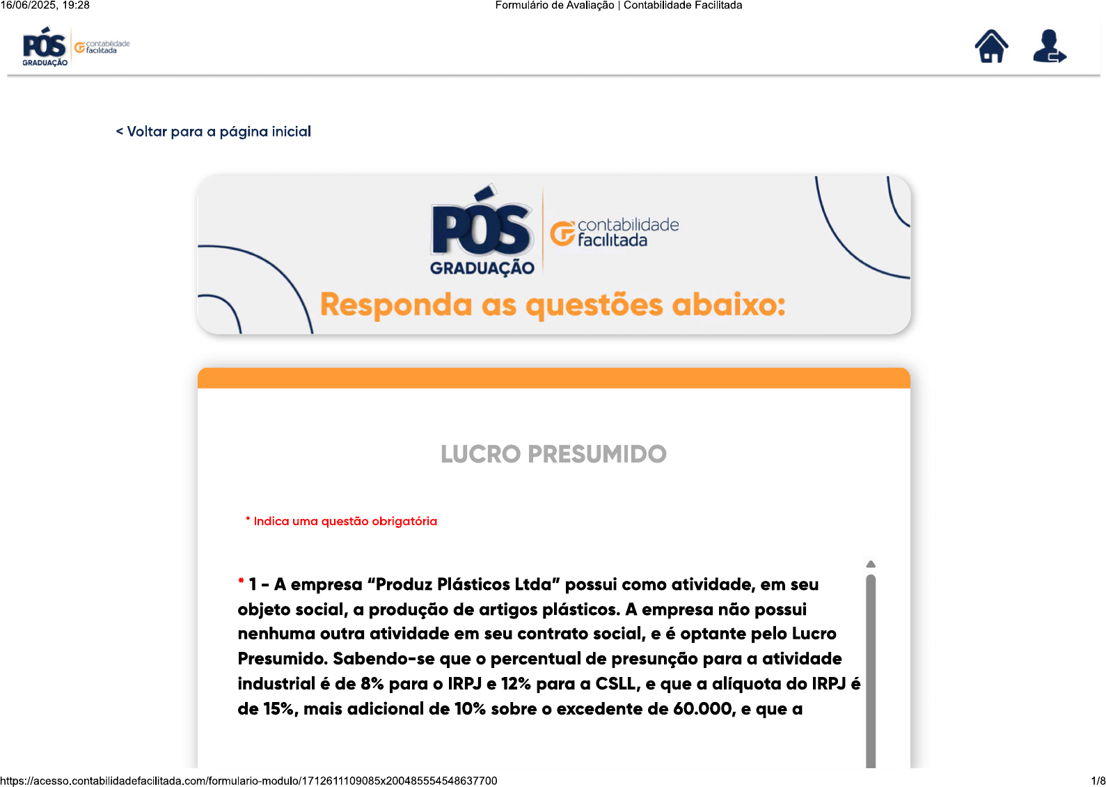 16/06/2025, 19:28 Formulario de POS contabilidade facilitada GRADUAÇÃO6/06/2025, 19:28 Formulário de Avaliação Contabilidade Facilitada POS contabilidade facilitada GRADUAÇÃO 1° Trimestre/2024 Valor total da Nota Fiscal de Venda de Produtos 450.000,00 Industrializados IPI destacado na Nota Fiscal de Venda 45.000,00 ICMS ST destacado na Nota Fiscal de Venda 60.000,00 Descontos Incondicionais 20.000,00 Ganhos de Capital 50.000,00 A) R$ 4.500,00 de IRPJ e R$ 4.050,00 de CSLL B) R$ 3.900,00 de IRPJ e R$ 3.510,00 de CSLL C) R$ 11.940,00 de IRPJ e R$ 8.496,00 de CSLL D) R$ 13.000,00 de IRPJ e R$ 8.010,00 de CSLL * 2 - A empresa de consultoria "Sabe Tudo Ltda" foi constituída em 10/02/2024, e optou pela tributação na forma do lucro presumido. A empresa apresentou as seguintes informações ao final do 1° trimestre (31/03/2024): 500.000,0 Receita Bruta Consultoria 0 Descontos Incondicionais 25.000,00 Receita total de Aplicação Financeira (Resgatada) 3.000,00 IRRF s/ Aplicação Financeira - 20% (Resgatada) 600,00 A alíquota do Imposto de Renda é de 15%, e haverá incidência de adiciona de 10% de IR sobre valor que exceder o limite de R$ 60.000,00 n trimestre (20.000.00 por mês). 2/816/06/2025, 19:28 Formulário de Avaliação Contabilidade Facilitada POS contabilidade facilitada GRADUAÇÃO adicional de IR, se reterente ao trimestre de 2024, e assinale ( opção correta: A) R$ 34.150,00 B) R$ C) R$ 32.150,00 D) R$ 34.750,00 Com base nas informações do exercício anterior, e sabendo que ( presunção da CSLL é 32%, e a alíquota do imposto é de 9%, assinale ( proposição que representa a Contribuição Social Sobre Lucro (CSLL) devida referente ao 1° trimestre de 2024. A) R$ 14.670,00 B) R$ 13.950,00 C) R$ 13.680,00 D) R$ 14.400,00 * 4 Analise as afirmativas abaixo relativas ao Lucro Presumido e assinale ( opção correta: I - lucro presumido consiste em uma forma de cálculo do IRPJ e CSLL se baseia no lucro efetivamente apurado na DRE - Demonstração d16/06/2025, 19:28 Formulário de Avaliação Contabilidade Facilitada POS contabilidade facilitada GRADUAÇÃO II - A parcela do lucro presumido que exceder valor de R$ (sessenta mil reais) no trimestre, sujeita-se à incidência de adicional d imposto de renda à alíquota de 10% (dez por cento). III - valor de ICMS ST destacado na Nota Fiscal de venda poderá se deduzido da base de cálculo do Lucro Presumido. IV - Os percentuais de presunção aplicáveis ao IRPJ nem sempre iguais aos percentuais aplicáveis para a CSLL. A) Todas as alternativas estão corretas. B) Apenas a alternativa III está correta. C) Apenas a alternativa está incorreta. D) Apenas a alternativa está correta. 4/816/06/2025, 19:28 Formulário de Avaliação Contabilidade Facilitada POS contabilidade facilitada GRADUAÇÃO venda de mercadorias (loja de conveniência) e de lavação. A optou pelo lucro presumido em 2024 e apresentou os seguintes dados no 1 trimestre de 2024: 2.500.000,0 Total das NFs de Revenda de Gasolina 0 Descontos Incondicionais Concedidos (Gasolina) 100.000,00 Vendas de Mercadorias 200.000,00 Receita de Serviços de Lavação 100.000,00 Ganho de Capital na venda de Imobilizado 10.000,00 Informe o Imposto de Renda devido referente ao 1° trimestre de 2024: A) R$ 14.460,00 B) R$ 15.500,00 C) R$ 15.600,00 D) R$ 18.100,00 * 6 - Com base nas informações do exercício anterior, o valor da CSLL devida referente ao 1° trimestre de 2024: A) B) R$ 8.676,00 C) R$ 31.860,00 D) R$ 9.396,00 5/816/06/2025, 19:28 Formulário de Avaliação Contabilidade Facilitada POS contabilidade facilitada GRADUAÇÃO R$ 2.200 de IRPJ. Como está com dificuldades financeiras, e não pagar o IRPJ e a CSLL em quota única até 30/04/2024, optou por fazer pagamento em quotas (parcelas mensais). A legislação permite pagamento em no máximo 3 quotas, de no mínimo R$ 1.000,00 cada uma sendo que o acréscimo para a 2° quota que vence em 31/05/2024 é de 1%, da quota que vence em 30/06/2024 é 1% mais a Selic do mês de maio. Considere que a Selic de maio de 2024 foi de 2%. Informe o valor da 1° quota de IRPJ e CSLL: A) R$ 1.200 de CSLL e de IRPJ B) R$ 1.000 de CSLL e R$ 1.000 de IRPJ C) de CSLL e R$ 733,33 de IRPJ D) de CSLL e de IRPJ A empresa apurou no 1° trimestre de 2024 um valor de R$ 3.600 de CSLL 2.200 de IRPJ. Como está com dificuldades financeiras, e não conseguiro pagar IRPJ e a CSLL em quota única até 30/04/2024, optou por fazer pagamento em quotas (parcelas mensais). A legislação permite ( pagamento em no máximo 3 quotas, de no mínimo R$ 1.000,00 cada uma sendo que acréscimo para a quota que vence em 31/05/2024 é de 1%, da quota que vence em 30/06/2024 é 1% mais a Selic do mês de maio. Considere que a Selic de maio de 2024 foi de 2%. Informe o valor da 2° quota de IRPJ e CSLL: 6/816/06/2025, 19:28 Formulário de Avaliação I Contabilidade Facilitada POS contabilidade facilitada GRADUAÇÃO C) R$ 1.200 de CSLL e R$ 733,33 de IRPJ D) R$ 1.212 de CSLL e de IRPJ 9 A empresa apurou no 1° trimestre de 2024 um valor de R$ 3.600 de CSLL R$ 2.200 de IRPJ. Como está com dificuldades financeiras, e não conseguiro pagar o IRPJ e a CSLL em quota única até 30/04/2024, optou por fazer ( pagamento em quotas (parcelas mensais). A legislação permite pagamento em no máximo 3 quotas, de no mínimo R$ 1.000,00 cada uma sendo que o acréscimo para a 2° quota que vence em 31/05/2024 é de 1%, da 3° quota que vence em 30/06/2024 é 1% mais a Selic do mês de maio. Considere que a Selic de maio de 2024 foi de 2%. Informe o valor da 3° quota de IRPJ e CSLL: A) de CSLL e de IRPJ B) R$ 1.236 de CSLL e R$ 0,00 de IRPJ C) R$ 1.000 de CSLL e R$ 1.000 de IRPJ D) R$ 1.212 de CSLL e de IRPJ - A empresa apurou no 1° trimestre de 2024 um valor de R$ 3.600 de CSLL R$ 2.200 de IRPJ. Como está com dificuldades financeiras, e não pagar IRPJ e a CSLL em quota única até 30/04/2024, optou por fazer pagamento em quotas (parcelas mensais). A legislação per