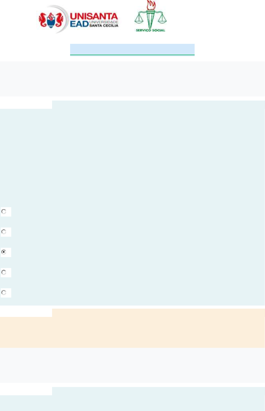 LAUDOS E PARECER SOCIAL Questão 1 Correto Atingiu 1,00 de 1,00 Marcar questão Texto da questão Assim, o serviço social como profissão tem o compromisso com um projeto de sociedade que reflita os interesses dos trabalhadores, das classes subalternas, pois a atuação profissional deve refletir a afirmação e garantia dos direitos sociais. Desta forma, sobre a profissão de assistente social pode-se considerar que: I.A prática política ou politizada dos profissionais é valorizada. II.Percorre-se a construção de um projeto profissional associado a um projeto de sociedade. III.A especificidade técnica se associa a uma formação técnica, metodológica e ético-política. É correto o que se afirma em: Questão 1Resposta I e II. II e III. I, II e III. apenas I. apenas II. Feedback Sua resposta está correta. A resposta correta é: I, II e III. Questão 2 Incorreto Atingiu 0,00 de 1,00 Marcar questão Texto da questão O exercício da profissão se realiza pela relação e conexão entre as três dimensões do serviço social, ele se insere e questiona as contradições contidas na sociedade capitalista, por esse motivo a https://avaead.unisanta.br/course/user.php?mode=grade&id=35337&user=49672 dimensão ético-política respalda a reflexão e o posicionamento do profissional que deve trabalhar para a validação dos: Questão 2Resposta direitos sociais. territórios espaços públicos. conflitos Feedback Sua resposta está incorreta. A resposta correta é: direitos sociais. Questão 3 Correto Atingiu 1,00 de 1,00 Marcar questão Texto da questão Iamamoto (2008) ressalta que o serviço social considera que a questão social está na sua fundação sócio-histórica, associado a isso a prática profissional deve ser apreendida como trabalho e exercício profissional, constituindo em: Questão 3Resposta projeto ético-político normas de conduta. código de ética. profissão regulamentada. processo de trabalho. Feedback Sua resposta está correta. A resposta correta é: processo de trabalho. Questão 4 Incorreto Atingiu 0,00 de 1,00 Marcar questão Texto da questão O estudo social em serviço social corresponde a uma das atribuições do serviço social. Leia as afirmativas abaixo que destaca sobre a importância do estudo social: I.A realização do estudo social permite a elaboração de relatório ou laudo social. II.A investigação da realidade social deve ser realizada com utilização de técnica e ética. III.A realidade social deve ser apreendida, pelo profissional, de maneira crítica. É correto o que se afirma em: Questão 4Resposta II e III. I e II. apenas I. I, II e III. apenas III. Feedback Sua resposta está incorreta. A resposta correta é: I, II e III. Questão 5 Correto Atingiu 1,00 de 1,00 Marcar questão Texto da questão A dimensão técnico-operativa do serviço social não corresponde apenas à utilização de recursos técnicos e instrumentais para respaldar a ação profissional, pois se realiza por meio de capacidade reflexiva e apreensão da realidade social pelas e pelos assistentes sociais. Assim, a dimensão técnico-operativa corresponde: Questão 5Resposta a reflexão procedimental. a ação profissional. ao conjunto de ações e procedimentos. e.ao desenvolvimento social. ao projeto ético-político. Feedback Sua resposta está correta. A resposta correta é: ao conjunto de ações e procedimentos. Questão 6 Correto Atingiu 1,00 de 1,00 Marcar questão Texto da questão Ao recorrer ao assistente social, o usuário espera que o profissional seja capaz de construir uma resposta profissional que dê conta de sua necessidade, mesmo aquelas de caráter imediato como a ausência de alimentação, a dificuldade de acessar os serviços mais complexos na área de saúde pública, a busca por informação e orientação sobre a vida familiar. Tal situação ocorre por meio de: Questão 6Resposta relatório social. atendimento social. entrevista laudo social parecer social Feedback Sua resposta está correta. A resposta correta é: atendimento social. Questão 7 Correto Atingiu 1,00 de 1,00 Marcar questão Texto da questão A inserção profissional de assistentes sociais em instituições também se configura de forma contraditória, uma vez que historicamente, a relação entre assistente social e usuário expressa à ligação do exercício da profissão com as classes subalternas. Assim, o serviço social tem seu exercício profissional legitimado e socialmente reconhecido: Questão 7Resposta pelo projeto ético-político. pela contradição da sociedade. pelos setores dirigentes da sociedade. pelo exercício da cidadania. pelo enfrentamento à questão social. Feedback Sua resposta está correta. A resposta correta é: pelos setores dirigentes da sociedade. Questão 8 Correto Atingiu 1,00 de 1,00 Marcar questão Texto da questão O estudo social pressupõe conhecimento da realidade social das e dos assistentes sociais, se caracteriza, por exemplo, a situações que levam crianças, adolescentes, mulheres e homens a viverem diferentes situações que se configuram como violação de direitos, seja por vivenciarem uma situação de violência ou por vivenciarem um processo de precarização, especialmente presente no mundo do trabalho. A realidade a ser relatada no estudo social corresponde às: Questão 8Resposta instrumentalidades utilizadas no exercício da profissão. técnicas aplicadas. expressões da questão social. práticas éticas. dimensões do serviço social. Feedback Sua resposta está correta. A resposta correta é: expressões da questão social. Questão 9 Correto Atingiu 1,00 de 1,00 Marcar questão Texto da questão O estudo social para o Serviço Social é atividade privativa da profissão, sua realização perpassa as dimensões teórico-metodológica, ético-política e técnico-operativa. A realização do estudo social pressupõe: Questão 9Resposta originalidade e especificidade. processo metodológico de trabalho. domínio da 
