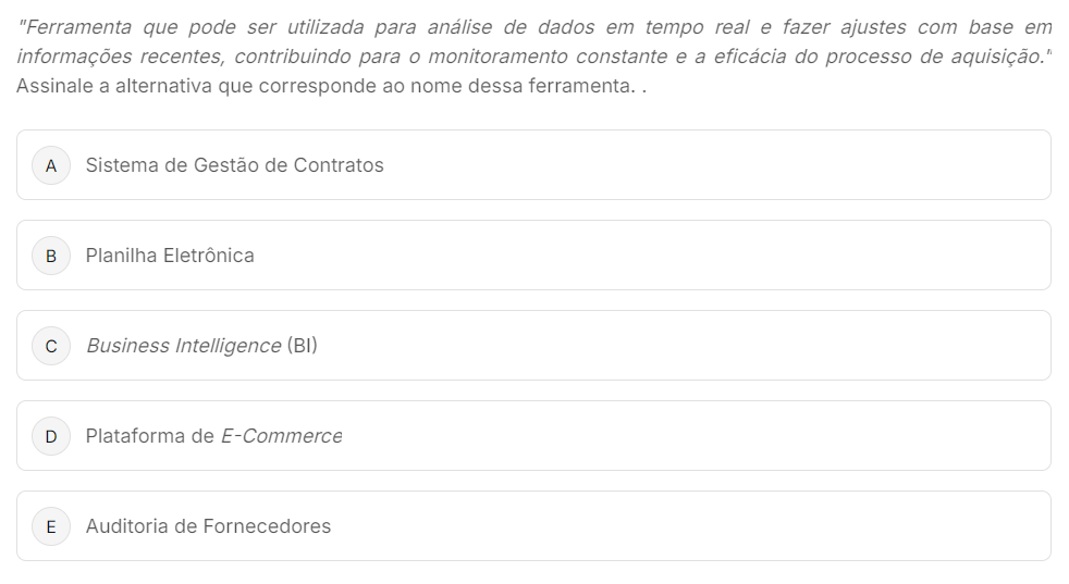 que pode ser utilizada para análise de dados em tempo real e fazer ajustes com base em informações recentes, contribuindo para monitoramento constante e a eficácia do processo de aquisição." Assinale a alternativa que corresponde ao nome dessa ferramenta. A Sistema de Gestão de Contratos B Planilha Eletrônica C Business Intelligence (BI) D Plataforma de E-Commerce E Auditoria de Fornecedores