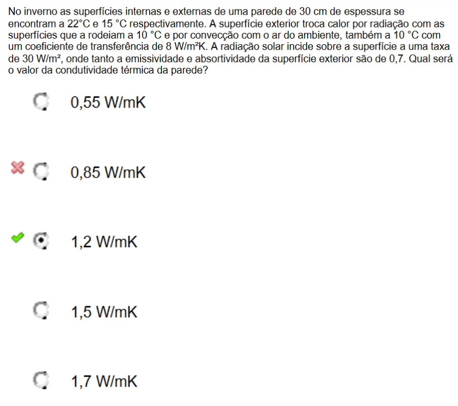 No inverno as superfícies internas e externas de uma parede de 30 cm de espessura se encontram a 22°C e 15 °C respectivamente. A superfície exterior troca calor por radiação com as superfícies que a rodeiam a 10 °C e por convecção com o an do ambiente, também a 10 °C com um coeficiente de transferência de 8 A radiação solar incide sobre a superfície a uma taxa de 30 onde tanto a emissividade e absortividade da superfície exterior são de Qual será o valor da condutividade térmica da parede? 0,55 W/mK x 0,85 W/mK 1,2 W/mK 1,5 W/mK 1,7 W/mK2. Um duto retangular de an forçado para aquecimento é suspenso a partir do teto de um porão cujas paredes e estão na temperatura de duto tem um comprimento de 15 m e sua seção reta é de 400 mm X 250 mm. A emissividade e o coeficiente convectivo na superfície são de aproximadamente 0,65 a 4 Para um duto não isolado cuja temperatura superficial média é de 45°C qual é a taxa de perda de calor do duto? 588 W 2255 W 125 W 958 W 3242 W 3. Uma parede com 0,2 m de espessura e difusividade térmica de encontra-se inicialmente a uma temperatura uniforme igual a 95°C. Subitamente, uma das suas faces tem a sua temperatura reduzida a 25°C enquanto a outra é perfeitamente isolada. Utilizando um incremento espacia de 25 mm. Qual deve ser o intervalo de tempo adequado para utilizar o método explícito? At 60 S At 152 S At 110 S At 223 S At 322 S 4. Consideremos a transferência de calor bidimensional numa barra solida de molibdênio emformato de L que está inicialmente a uma temperatura uniforme de 200°C e cuja seção transversal está na figura abaixo. As propriedades da barra são k=138 a lado direito da barra está isolado e a superfície inferior se mantem a uma temperatura uniforme de 200°C em todo momento. No instante t=0 a superfície superior completa e a lateral esquerda se sujeita a uma convecção com fluido refrigerante a uma temperatura de e um coeficiente de transferência de calor de 100 °C. A rede de pontos é igualmente espaçados com Ax=Ay=2 cm. 1 2 200°C Elaborado pelo autor. Os pontos 1 e 2 são os mais expostos à convecção e por tanto em algum deles deve ser analisado o critério de uso do método explicito. Qual é o intervalo de tempo adequado para utilizar o método explícito? Faça a análise a partir do ponto 2. 1,2 S 1s 1,8 S5. Um fluido de hidrocarbonetos se resfria a uma taxa de 0,2 kg/s desde 50°C até 40°C ao passar pelo tubo interior de um trocador de casco e tubo em fluxos paralelos. Agua entra ao trocador a 0°C com uma vazão mássica de kg/s. diâmetro externo é de 0,025m e seu comprimento de 6m. Qual é o valor do coeficiente global de transferência de calor do trocador? 1203 752 6. Um fluido de hidrocarbonetos J/kg.K) se resfria a uma taxa de 0,2 kg/s desde 50°C até 40°C ao passar pelo tubo interior de um trocador de casco e tubo em fluxos paralelos. Água entra ao trocador a 0°C com uma vazão mássica de 0.15 kg/s. diâmetro externo é de 0,025m e seu comprimento de 6m. Qual é a temperatura da água na saída? 62,3 °C 142,2 °C 87,2 °C 75,3 °C 55,3 °C 7. Uma peça de aço 1045 quente com uma concentração uniforme inicial de carbono de 0,45% em base mássica é exposta a uma atmosfera carburante durante 2 horas. Durante todo o processo, a concentração de carbono na superfície foi de A difusividade mássica do carbono no aço durante esse processo é uniforme e de 1x 10-11 Qual é percentagem de concentração mássica a 0,1 mm?0,65% 0,87% 0,51% 0,70% 0,20% 8. Gás hidrogênio (H2) é armazenado a 298 K e 2 bar de pressão num tanque de raio interno e externo de 2 m e 2,02 m, respectivamente. material do de niquel (Ni). Assumindo as seguintes propriedades: { 2 bar) Qual é o valor da taxa de transferência de massa por difusão pela parede molar? 4,76 X kmol/s kmol/s 1,76 kmol/s kmol/s kmol/s9. Sabendo que F23=0,10 e Qual é o fator de forma F12 entre as superfícies retangulares da figura abaixo? Dica: Utilize a regra de superposição e posteriormente a regra de reciprocidade para encontrar a resposta. m 1 m 3 m m 4 4 m 0,2 0,5 0,3 0,1 010. Duas placas paralelas grandes se mantem a temperaturas uniformes de 500K e Determine a taxa neta de transferência de calor por radiação entre as duas superfícies sabendo que a dimensão das placas são e L2= 1 me o 4 A2 D A1 707 W 2589 W 1540 W 1778 W 923 W Dois retângulos paralelos alinhados estão separados por uma distância de 3 m inicialmente, por tanto, a porcentagem de mudança na taxa de transferência de calor da radiação quando os retângulos são movidos para 5 m é calculada mediante uma relação das taxas de transferência entre essas duas situações. Se os fatores de forma de 1 para 2 na distância de 3 e 5 m são 0,41 e 0,22 respectivamente. Qual é a porcentagem de mudança na taxa de transferencia de calor por radiação?0,34 0,92 0,55 0,46 0,71 A função de emissividade espectral de uma superfície opaca a certa temperatura pode ser expressa aproximadamente como: E1 0,2, um = 2 um Qual é a emissividade média da superfície, se os valores das frações de emissão são 0,403607 para comprimentos de onda de 2 um e 0,63373 para comprimentos de onda de 8 um ? 0,55 0,30 0,42 0,25 0,13Um tubo num trocador de calor tem um diâmetro interno de 0,20 m e 0,25 m de externo. A condutividade térmica do material do tubo é de 20 W/m.K enquanto que o coeficiente de transferência de calor na superfície interna é 800 e da superfície externa de 500 Qual é a relação entre o coeficiente de transferência de calor do trocador baseado na superfície interna e externa? 0,5 x 1 2 1,25 0,6 Se utiliza um trocador de calor de tubo duplo, parede fina com diâmetros interno e externo de 0,20 m e 0,25 m respectivamente. Utilizado para condensar refrigerante 34a com água a 15°C. Os coeficiente de transferência de calor por convecção na superfície interna e externa são 5000 e 2500 respectivamente. Qual é o valor do 