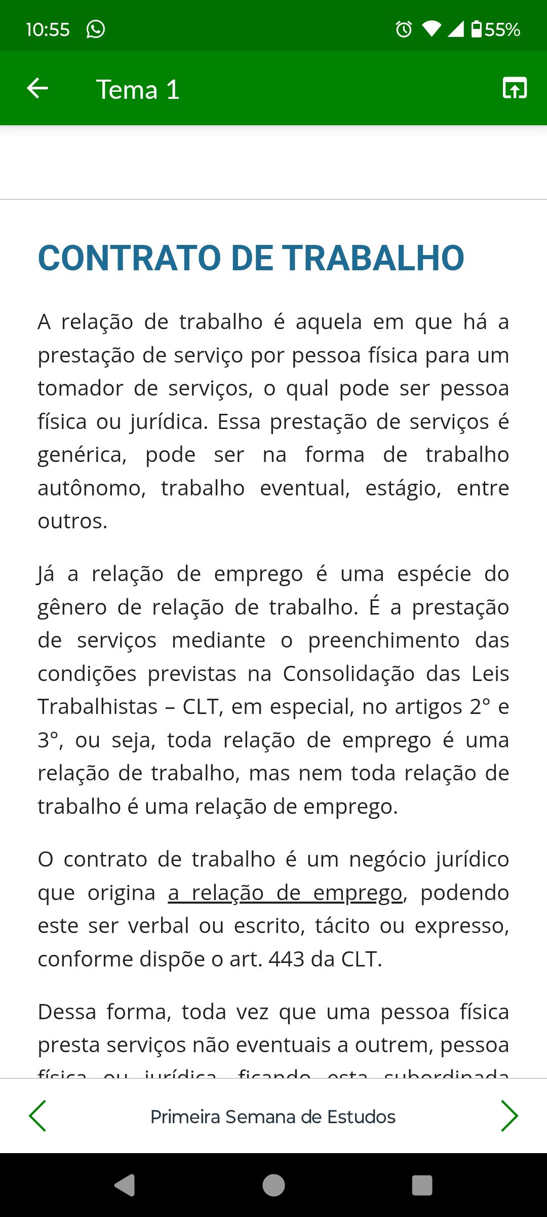 10:55 55% Tema 1 CONTRATO DE TRABALHO A relação de trabalho é aquela em que há a prestação de serviço por pessoa física para um tomador de serviços, o qual pode ser pessoa física ou jurídica. Essa prestação de serviços é genérica, pode ser na forma de trabalho autônomo, trabalho eventual, estágio, entre outros. Já a relação de emprego é uma espécie do gênero de relação de trabalho. É a prestação de serviços mediante o preenchimento das condições previstas na Consolidação das Leis Trabalhistas - CLT, em especial, no artigos 2° e 3°, ou seja, toda relação de emprego é uma relação de trabalho, mas nem toda relação de trabalho é uma relação de emprego. O contrato de trabalho é um negócio jurídico que origina a relação de emprego, podendo este ser verbal ou escrito, tácito ou expresso, conforme dispõe o art. 443 da CLT. Dessa forma, toda vez que uma pessoa física presta serviços não eventuais a outrem, pessoa Primeira Semana de Estudos