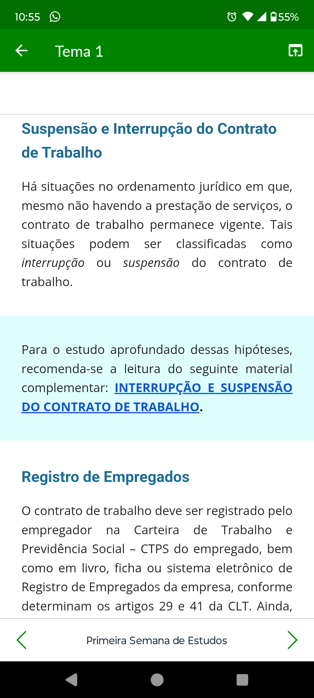 10:55 55% Tema 1 Suspensão e Interrupção do Contrato de Trabalho Há situações no ordenamento jurídico em que, mesmo não havendo a prestação de serviços, o contrato de trabalho permanece vigente. Tais situações podem ser classificadas como interrupção ou suspensão do contrato de trabalho. Para o estudo aprofundado dessas hipóteses, recomenda-se a leitura do seguinte material complementar: INTERRUPÇÃO E SUSPENSÃO DO CONTRATO DE TRABALHO. Registro de Empregados O contrato de trabalho deve ser registrado pelo empregador na Carteira de Trabalho e Previdência Social - CTPS do empregado, bem como em livro, ficha ou sistema eletrônico de Registro de Empregados da empresa, conforme determinam os artigos 29 e 41 da CLT. Ainda, Primeira Semana de Estudos >