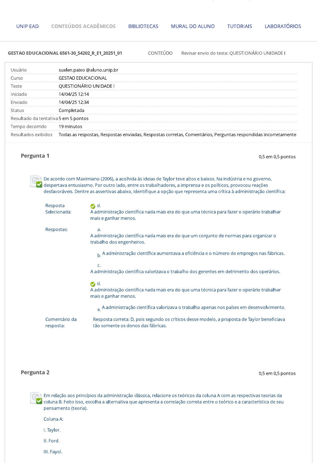 UNIP EAD CONTEÚDOS ACADÊMICOS BIBLIOTECAS MURAL DO ALUNO TUTORIAIS LABORATÓRIOS GESTAO EDUCACIONAL CONTEÚDO Revisar envio do teste: QUESTIONÁRIO UNIDADE Usuário Curso GESTAO EDUCACIONAL Teste QUESTIONÁRIO UNIDADE Iniciado 14/04/25 12:14 Enviado 14/04/25 12:34 Status Completada Resultado da tentativa 5 em 5 pontos Tempo decorrido 19 minutos Resultados exibidos Todas as respostas, Respostas enviadas, Respostas corretas, Comentários, Perguntas respondidas incorretamente Pergunta 1 0,5 em 0,5 pontos De acordo com Maximiano (2006), a acolhida às ideias de Taylor teve altos e baixos. Na indústria e no governo, despertava entusiasmo. Por outro lado, entre os trabalhadores, a imprensa e os políticos, provocou reações desfavoráveis. Dentre as assertivas abaixo, identifique a opção que representa uma crítica à administração científica: Resposta d. Selecionada: A administração científica nada mais era do que uma técnica para fazer o operário trabalhar mais e ganhar menos. Respostas: a. A administração científica nada mais era do que um conjunto de normas para organizar o trabalho dos engenheiros. b. A administração científica aumentava a eficiência e o número de empregos nas fábricas. C. A administração científica valorizava o trabalho dos gerentes em detrimento dos operários. d. A administração científica nada mais era do que uma técnica para fazer o operário trabalhar mais e ganhar menos. A administração científica valorizava o trabalho apenas nos países em desenvolvimento. e. Comentário da Resposta correta: D, pois segundo os críticos desse modelo, a proposta de Taylor beneficiava resposta: tão somente os donos das fábricas. Pergunta 2 0,5 em 0,5 pontos Em relação aos princípios da administração clássica, relacione os teóricos da coluna A com as respectivas teorias da coluna B. Feito isso, escolha a alternativa que apresenta a correlação correta entre o teórico e a característica de seu pensamento (teoria). Coluna A: I. Taylor. II. Ford. III. Fayol.Coluna B: 1. sistema de administração de tarefas baseado no estudo sistemático e científico do tempo destacou-se com a padronização de ferramentas e equipamentos. A principal mudança foi a criação do departamento de planejamento, trabalho intelectual para estudar e propor o aprimoramento do chão de fábrica. Uma das ideias fundamentais da administração científica é de que a produtividade mais elevada resulta da minimização do esforço muscular. 2. Os princípios da produção em massa ou série estão relacionados à grande quantidade de peças padronizadas e com trabalhador especializado. A linha de montagem, das etapas de fabricação, era disposta em uma esteira rolante e cada empregado acoplava um componente, o que reduzia o tempo e aumentava a produção. 3. A administração é uma atividade comum a todos os empreendimentos humanos. As empresas foram divididas em funções distintas como: técnica, comercial, financeira, segurança, contabilidade e administração. A administração era a mais importante de todas e definiu seus componentes em planejamento, organização, comando, coordenação e controle, com o objetivo de fornecer valor, na forma de bens e serviços a seus consumidores. trabalho do dirigente consiste em tomar decisões, estabelecer metas, definir diretrizes e atribuir responsabilidades aos integrantes da organização. Depois de feitas as respectivas relações, pode-se afirmar que está correta: Resposta Selecionada: C. Respostas: a. b. II-2; III-3. C. d. e. Comentário da resposta: Resposta correta: C, pois as demais estão invertidas, invalidando-as. Pergunta 3 0,5 em 0,5 pontos processo administrativo deve ser estudado também no contexto do desempenho das organizações. Diante disso, pode-se afirmar que: I. Certos objetivos só podem ser alcançados por meio da ação coordenada de grupos de pessoas. II. Produtos e serviços essenciais à sobrevivência somente se tornam disponíveis quando há organizações empenhadas em realizá-los. III. As organizações não afetam a qualidade de vida dos cidadãos. IV. Organizações bem administradas são importantes por causa do impacto sobre a qualidade de vida da sociedade. V. Administradores incompetentes são recursos sociais importantes. A(s) afirmativa(s) incorreta(s) é/são: Resposta Selecionada: d. III e V. Respostas: a. e III. b. III e IV. V. d. III e V. e. V.Comentário da Resposta correta: D, pois essas duas assertivas não condizem o enunciando. Lembrando-se que resposta: a proposta da questão é identificar concepção errada - e não a certa - acerca do processo administrativo. Pergunta 4 0,5 em 0,5 pontos Os princípios básicos para o bom atendimento ao público incluem: cortesia, atendimento de imediato, mostrar boa vontade, agir com rapidez, falar a verdade e evitar atitudes negativas, entre outros. Deve-se, portanto, evitar: Apatia. II Frieza. III Robotismo. IV Desdém. V Jogo de responsabilidades. Verifica-se que estão corretos os itens: Resposta Selecionada: b. I, II, III, IV e V. Respostas: a. II, III e b. I, II, III, IV e V. II, IV e V. C. d. II e III. II e IV. e. Comentário da Resposta correta: B, pois todos os itens apontados são fundamentais para um bom resposta: atendimento ao público, seja numa escola ou não. Pergunta 5 0,5 em 0,5 pontos Pode-se afirmar que o novo perfil do gestor escolar engloba I. A capacidade de trabalhar apenas individualmente. II. A capacidade de gerenciar um ambiente cada vez mais complexo. III. A criação de novas significações em um ambiente instável. IV. A capacidade de abstração. V. manejo de tecnologias emergentes. A(s) afirmativa(s) incorreta(s) é/são: Resposta Selecionada: b. I. Respostas: a. II e III. b. I. C. IV. d. III e V.II. e. Comentário da Resposta correta: B. Jamais se espera do novo gestor a atuação isolada. Ele precisa saber resposta: trabalhar sozinho em alguns momentos, mas não exclusivamente. Pergunta 6 0,5 em 0,5