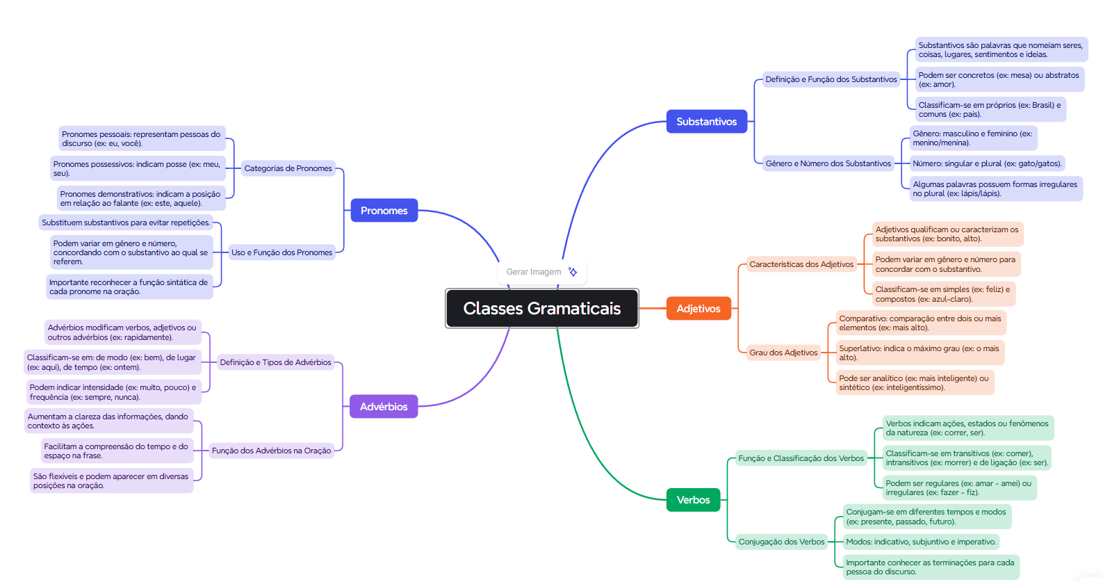 Substantivos são palavras que nomeiam seres, coisas, lugares, sentimentos e Definição e Função dos Substantivos Podem ser concretos (ex: mesa) ou abstratos (ex: amor). Classificam-se em próprios (ex: Brasil) e comuns (ex: país). Substantivos Pronomes pessoais: representam pessoas do masculino e feminino (ex: discurso (ex: eu, menino/menina). Pronomes possessivos: indicam posse (ex: meu, e Número dos Substantivos singular e plural (ex: gato/gatos) Categorias de Pronomes seu). Algumas palavras possuem formas irregulares Pronomes indicam a posição no plural (ex: lápis/lápis). em relação ao falante (ex: este, aquele). Pronomes Substituem substantivos para evitar Adjetivos qualificam ou caracterizam os substantivos (ex: bonito, alto). Podem em e concordando com substantivo ao qual se Uso e Função dos Pronomes referem Podem em e número para Caracteristicas dos Adjetivos Gerar Imagem concordar com Importante reconhecer a função sintática de cada pronome na oração. Classificam-se em simples (ex: feliz) e compostos (ex: azul-claro). Classes Gramaticais Adjetivos Comparativo: comparação entre dois ou mais modificam verbos, adjetivos ou elementos (ex: mais alto). outros (ex: rapidamente). Grau dos Adjetivos Superlativo: indica máximo grau (ex: o mais Classificam-se em: de modo (ex: bem), de lugar alto). Definição e Tipos de (ex: aqui), de tempo (ex: ontem). Pode ser analítico (ex: mais inteligente) ou Podem indicar intensidade (ex: muito, pouco) e sintético (ex: inteligentissimo). frequência (ex: sempre, nunca). Aumentam a clareza das dando Verbos indicam ações, estados ou contexto às da natureza (ex: correr, ser). Facilitam a compreensão do tempo e do Função dos na Oração Classificam-se em transitivos (ex: espaço na frase. Função e Classificação dos Verbos intransitivos (ex: morrer) e de ligação (ex: ser). São flexiveis e podem aparecer em diversas posições na oração. Podem ser regulares (ex: amar amei) ou irregulares (ex: fazer fiz). Verbos Conjugam-se em diferentes tempos e modos (ex: presente, passado, futuro). Conjugação dos Verbos Modos: indicativo, subjuntivo e imperativo. Importante conhecer as terminações para cada pessoa do