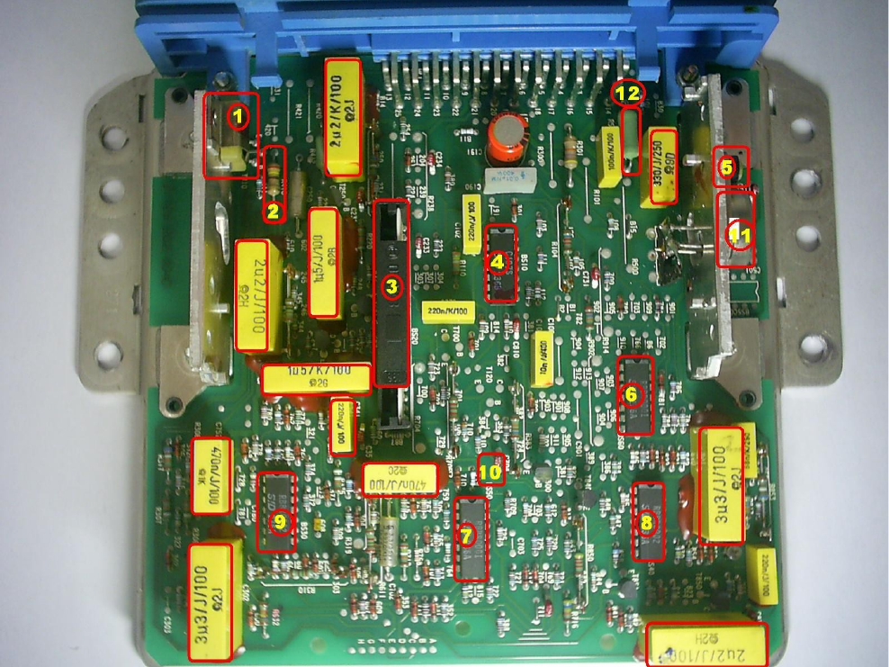 Le Jetronic – Sistema de Injeção Eletrônica Analógico Aplicações: Santana IE Uno 1.6R IE Monza Classic IE Monza 2.0 MPFI Gol GTI IE Kadet GSI 95/96 (Bocal Azul) Escort XR3 93/94 Componentes da UCE: 1 – TIP122 (Transistor NPN) Componente gerencia diretamente o Pulso dos Bicos Injetores, trabalhando com acionamento de 12V. 2 – Resistor do Sinal de Ignição - 240 Ohms, com anilhas coloridas: Vm/Am/Mr/Ouro, (em frente ao Transistor de Bico). Componente ligado ao Sinal de Ignição, Interligado ao Módulo Externo de Ignição, ‘ Módulo EZ-K ’. 3 - Módulo Visional - específico, chamado também de ‘Placa Branca de Parâmetros’. Componente responsável por Processar os Dados (uma espécie de Microprocessador). 4 – CJ07S, Marca: SiD. C.I. Circuito Integrado responsável pelo Conjunto Principal diretamente interligado ao Módulo Visional. 5 – BC547 (Transistor de Ignição, pequeno preto Sinal Pré-Amplificado). Componente ligado a Ignição, um Pré-Drive acionador da Ignição o qual sofrerá ainda Amplificação de seu Sinal através do Transistor FET, sendo o último, o Principal Responsável pelo Acionamento Principal da Ignição nesse Sistema. 6 – RBBR0001 ou CI Correspondente: LM2902N, Marca: Motorola (Relacionado a Bicos Injetores) (RETIRAR ESSE e INVERTER com o Nº 9).# Componente relacionado a Bico Injetor ‘Travado’ aberto. 7 – RBBR001 ou CI Correspondente: LM2902N, marca: Motorola, ou ainda SiD209A (Relacionado a Bicos Injetores). Componente relacionado a Bico ‘Travado’ Aberto. 8 – RBB0002 ou CI Correspondente: LM2902N, marca: Motorola, (Relacionado a Bicos Injetores) Componente relacionado a Bico ‘Travado’ Aberto. 9 – SiD (Relacionado a Bico aberto) . Componente relacionado a bico ‘Travado’ Aberto. 10 – Capacitor de TÂNTALO Possui a função de um Filtro na UCE, mais a título de Curiosidade o material do qual é feito, composto. 11 – Transistor FET, marca: SiD, Numeração: BIP109, 125B, (Nº de Mercado: 2N3055 NPN ), Drive de Ignição (Amplifica o Sinal de Ignição proveniente do Transistor BC547) Componente relacionado a Amplificação do Sinal de Ignição e interligado ao Módulo de Ignição Externo, Módulo EZ-K). 12 – Resistor (Verde) de Potência 360 Ohms, 2W, 5% de Tolerância. Ligado ao Drive de Ignição, por ser um Resistor de Corrente. Defeitos Catálogados: Fluxo de Ar. UCE apresentará no Veículo a princípio Excesso de Combustível, veículo ‘pega e morre’, assim sendo, em Muitos casos quando desplugado o Sensor MAF (Medidor de Fluxo de Ar), o Veículo consegue funcionar, porém com Muito ‘Excesso’. Solução: Ressoldar todos os Capacitores de Poliéster Amarelos (TODOS os Componentes, Elementos ‘em Amarelo’, Pequenos e Grandes, que estão marcados na foto acima). Ignição. Na UCE podemos encontrar a Solda do Drive de Ignição Solta, devido muitas vezes a Superaquecimento do Drive, que por sua vez esquenta, devido a Bobina estar ‘em Curto’ no Veículo. Em muitos casos, favor Ressoldar o Drive de Ignição (‘Defeito em Solda’ no Elemento Nº05 na foto acima), pois a Solda poderá estar ‘Solta’, Desprendida. E o Sintoma apresentado no Veículo é que a Bobina estará em ‘Curto-Circuito’. Drive de Ignição Queimado (FET). Decorrente de Superaquecimento, muitas vezes por instalação de Kit Gaz incorreta, ou mesmo ‘Curto’ no Sistema de Ignição, ou ainda Fiação Elétrica do Sistema ‘em curto’. Solução: Realizar a Medição do Componente, e/ou Trocar o Drive de Ignição (Elemento Nº05 em foto acima) por um Original Equivalente (Transistor FET); para verificar se o Componente está Avariado. Obs: Componente poderá ser encontrado numa Casa de Eletrônica Conceituada. Bicos Injetores ‘Travados Aberto’ (Eletro-Válvulas Injetoras Travadas, sem pulsar). Verificar também a Medição do Drive de Bico Injetor (Elemento Nº01 na foto acima), (o qual utilizando um Multímetro na escala de ‘Semi-Condutor’, o mesmo deverá apresentar a Tensão ‘V gama’, que é de aproximadamente 0,400 V a 0,800 V, caso a Tensão seja Inferior a citada, ou ainda Superior, então Com Certeza, o Transistor estará avariado). Na grande maioria das vezes, é o Drive de Bico (Transistor Darlington), entretanto, outras vezes não. Se ainda a troca do Drive não resultar na Solução do Problema, então Remova do Circuito o 1º C.I.: o LM2902A (Elemento Nº06 na foto acima), daí Teste a UCE.. . (Procedimento SOMENTE para Teste em Bancada, Utilizando o ECU Test. NÃO REALIZAR tal Procedimento no Veículo. Remova-os no Sentido de deixar os C.I.s ‘Fora da Placa’ da UCE). Remova também o 2º C.I.: LM2901A (Elemento Nº07 na foto acima), Teste novamente.. . Remova Finalmente o 3º C.I., o C.I.: LM2902B (Elemento Nº08 na foto acima), e Teste- o.. . Finalizando assim a Série dos 03 C.I.s, Interligados ao Gerenciamento dos 04 Bicos Injetores. Quando 01 destes C.I.s estão queimados geralmente o Bico ‘Trava Aberto’. Lâmpada de Anomalias ‘Pisca’ ou Acende, causando Corte no Motor. Acende a Lâmpada de Anomalias no Veículo, ou só dá uma ‘piscadela’, piscada e pára; dá um corte no Motor, ou Motor Falha; devido a Defeito de Interferência Eletromagnética (podendo ser ‘Fulga de Corrente’ em Bobina de Ignição, ou Cabos de Velas, ou ainda Velas que não são as Resistivas (Segundo a Tabela de Aplicação). Ou ainda numa possibilidade Muito Remota, mas não impossível: Defeito em Módulo EZ-K (Módulo de Ignição Externo, ou Módulo á parte da Unidade L.E. Jetronic, a Unidade de Comando). UCE Não Funciona, acendendo apenas o Aterramento, ou ‘Massa Sensores’ no ECU TEST. Defeito em C.I. CJ07 (Elemento Nº04 na foto acima), a Unidade apaga, fica “morta” em Bancada, não Pulsando Bicos, nem a Ignição. A Solução é Substituir C.I. CJ07, o qual não possui Numeração Característica de Mercado. Retirar de uma UCE de Sucata em Bom Estado. Dicas da UCE LE Jetronic