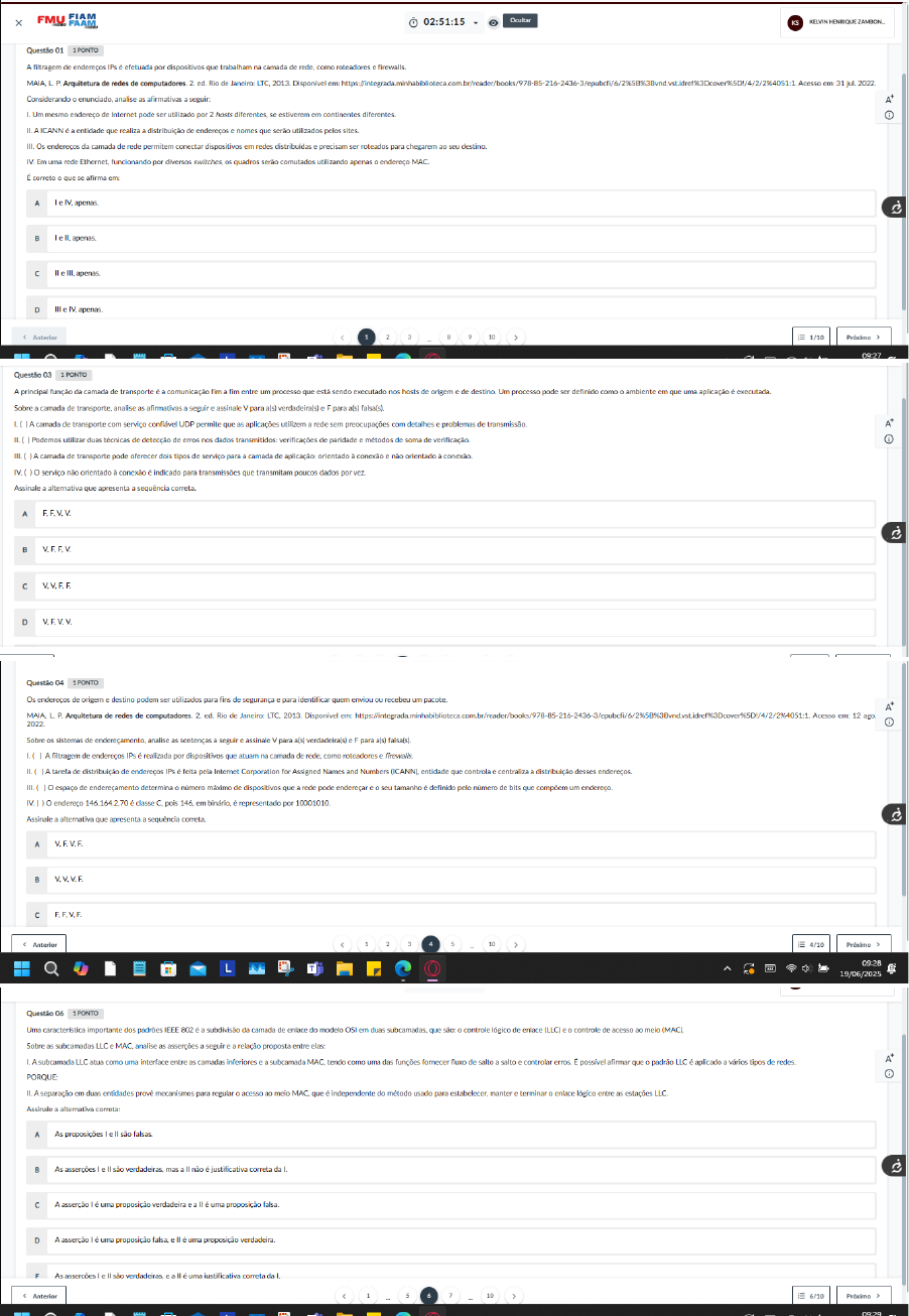 FMU FIAM 02:51:15 Ocultar KELVIN HENRIQUE Questão 01 PONTO A filtragem de endereços IPs efetuada por dispositivos que trabalham na camada de rede como roteadores e P. Arquitetura de redes de computadores 2 ed. Rio de Janeiro: 2013. em: 31 jul. 2022. Considerando analise as afirmativas seguir: A+ Um mesmo endereço de Internet pode ser utilizado por hosts diferentes se estiverem em continentes II. AICANN é a entidade que realiza distribuição de endereços nomes que serão utilizados pelos III. Os endereços da camada de rede permitem conectar dispositivos em redes distribuídas precisam ser roteados para chegarem ao seu destino. IV. Em uma rede funcionando por diversos os quadros serão comutados utilizando apenas endereço É correto que se afirma em: A apenas B I apenas apenas. D apenas. 1/10 Próximo > 09:27 Questão 03 PONTO A principal função da camada de transporte comunicação fim fim entre um processo que está sendo executado nos hosts de origem de Um processo pode ser definido como ambiente em que uma aplicação executada. Sobre camada de analise as afirmativas seguir assinale V para a(s) verdadeira(s) para a(s) falsa(s). A camada de transporte com serviço confiável UDP permite que as aplicações utilizem rede sem preocupações com detalhes problemas de transmissão. Podemos utilizar duas técnicas de detecção de erros nos dados transmitidos: verificações de paridade métodos de soma de verificação. III. camada de transporte pode oferecer dois tipos de serviço para camada de aplicação: orientado conexão e não orientado conexão. 10 serviço não orientado conexão é indicado para transmissões que transmitam poucos dados por Assinale alternativa que apresenta sequência correta. A F.F.V.V. B V.F.F.V. C D Questão 04 PONTO Os endereços de origem destino podem ser utilizados para fins de segurança para identificar quem enviou ou recebeu um pacote. MAIA L P Arquitetura de redes de 2 ed. Rio de Janeiro: Disponível em: Acesso em: 12 ago. Sobre os sistemas de endereçamento, analise as sentenças seguir assinale para a(s) verdadeira(s) F para a(s) A filtragem de endereços IPs realizada por dispositivos que atuam na camada de rede. como roteadores e )A tarefa de distribuição de endereços IPs feita pela Internet Corporation for Assigned Names and Numbers entidade que controla centraliza distribuição desses endereços. III espaço de endereçamento determina máximo de dispositivos que rede pode endereçar seu tamanho definido pelo numero de bits que compõem um endereço. IV. endereço 146.164.2.70 classe C. pois 146. em é representado por Assinale alternativa que apresenta sequência A B V.V.V.F. C 09:28 19/06/2025 Questão 06 PONTO Uma característica importante dos padrões IEEE 802 subdivisão da camada de enlace do modelo OSI em duas que são: controle lógico de enlace (LLC) controle de acesso ao meio (MAC). Sobre as subcamadas LLC MAC analise as asserções seguir relação proposta entre elas: I.A subcamada LLC atua como uma interface entre as camadas inferiores e subcamada MAC tendo como uma das funções fornecer fluxo de salto salto controlar É possível afirmar que padrão LLC aplicado varios tipos de PORQUE II. separação em duas entidades mecanismos para regular acesso ao meio que independente do método usado para manter terminar enlace lógico entre as estações Assinale alternativa correta: A As proposições são B As asserções são mas al não justificativa correta da C A asserção uma proposição verdadeira uma proposição falsa. D A asserção uma proposição el uma proposição verdadeira. As asserções lell são justificativa correta da 6/10 > 09:29Questão 07 PONTO compartilhamento de recursos de hardware software um motivo para necessidade das redes de Com uma rede é possível compartilhar recursos como conexões outras espaço em disco até gerando economia de recursos redução de Com base no excerto nos seus analise as afirmativas a seguir: I Um exemplo de dispositivo compartilhado em uma rede de computadores é uma que pode ser acessada por de um escritório II. o compartilhamento de acesso Internet por uma instituição de entre os seus professores e é um exemplo de uma rede de III. compartilhamento da central de processamento de um supercomputador entre instituições um exemplo de uma rede de computadores compartilhada Um medidor de cujo valor medido lido anotado em um tablet por um é um exemplo de uma rede de computadores É correto que se afirma em: A IV. apenas B IV. C D Anterior 09:29 L ^ 19/06/2025 Questão 09 PONTO A camada de também chamada camada tem como principal função comunicação fim fim entre os hosts de origem de destino Sobre camada de transporte seus protocolos analise as afirmativas seguir: camada de transporte possui somente 2 protocolos: Transmission Control Protocol os protocolos (TCP) User Datagram Protocol (UDP). A+ A camada de transporte oferece uma interface de programação chamada sockets que simplifica processo de desenvolvimento de novas aplicações III protocolo UDP oferece um serviço que garante entrega de dados transmitidos IV. No protocolo TCP responsabilidade pela entrega sequência de dados transmitidos é da camada de aplicação. É correto que se afirma em: A apenas B apenas le apenas D Anterior