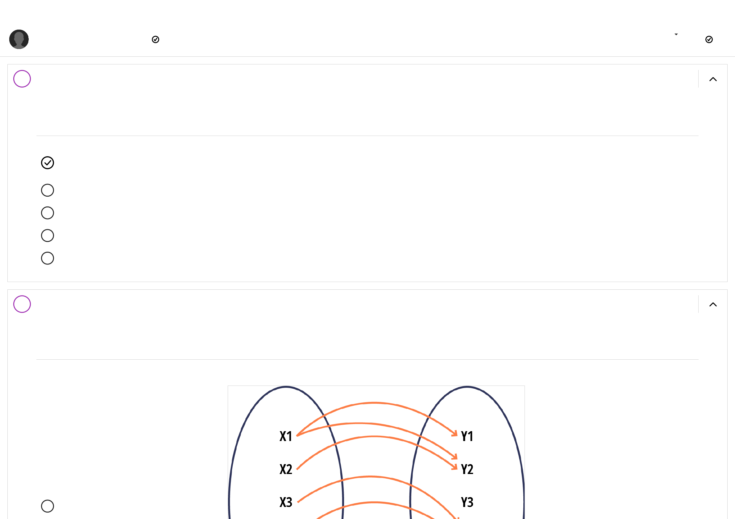 Atividade de Autoaprendizagem 1 1 MÚLTIPLA ESCOLHA CORRETO 0 / 0 2 MÚLTIPLA ESCOLHA INCORRETO 0 / 0 Uma função é considerada uma função par quando o seu gráfico é simétrico em relação ao eixo y. Além disso, simbolicamente, dizemos que a função é par quando f(x) = f (-x) . Uma função ímpar tem seu gráfico simétrico em relação à origem do plano cartesiano e simbolicamente é representada por f(-x) = - f(x). Considerando essas informações e o conteúdo estudado sobre funções pares e ímpares, pode-se afirmar sobre as funções f(x) = 4x, g(x) = x²-8 e h(x) = 5x 4+ 2 que: Resposta correta Correta: as funções g(x) = x²-8 e h(x) = 5x 4+ 2 são funções pares. B a função g(x) = x²-8 é uma função ímpar. C a função f(x) = 4x é uma função par. D as funções f(x) = 4x e h(x) = 5x 4+ 2 são funções pares. E a função h(x) = 5x 4+ 2 é uma função ímpar. Sejam A e B subconjuntos de R. Uma função f: A→B é uma lei ou regra em que cada elemento de A faz correspondência com um único elemento de B. O conjunto A é denominado domínio de f e é representado por D(f), ao passo que B é chamado de contradomínio ou campo de valores de f. Considerando essas informações e o conteúdo estudado sobre funções, pode-se afirmar que o diagrama de flechas que representa corretamente um exemplo de função é: A RECIBO: BF52D87C552D4D23AF88B5E57427AE7D TENTATIVA 3/5 (ENVIADA EM 19/06/25 16:22)Nota final Tentativa com a nota mais alta B C Resposta correta D 3 MÚLTIPLA ESCOLHA INCORRETO 0 / 0 E Podemos considerar que uma curva no plano coordenado xy é o gráfico de uma função de x se, e somente se, não for possível traçar uma reta vertical que intercepte a curva mais de uma vez. Essa regra é conhecida como teste da linha vertical. Considerando essas informações e o conteúdo estudado sobre a representação de uma função e o teste da linha vertical, pode-se afirmar que o gráfico que representa uma função é: A B 4 MÚLTIPLA ESCOLHA INCORRETO 0 / 0 C Resposta correta D E O domínio de uma função é o conjunto de valores que a variável independente pode assumir para que a função faça sentido. Por outro lado, imagem é o conjunto de valores que a função assume para os valores da variável independente pertencentes ao domínio. Considerando essas informações e o conteúdo estudado sobre o domínio e a imagem de uma função, analise as afirmativas a seguir, referentes à função f(x)=1/x. 1. Seu domínio é o conjunto dos números reais:D ( f ) = ℝ 2. Sua imagem é o conjunto dos números inteiroslm ( f ) = ℤ 3. O número 1 pertence ao domínio da função, pois é possível obter f(1) = 1/1. 4. A imagem da função f(x) é um subconjunto contradomínio. Está correto apenas o que se afirma em: 5 MÚLTIPLA ESCOLHA INCORRETO 0 / 0 6 MÚLTIPLA ESCOLHA INCORRETO 0 / 0 A I, II e III. B I e II. C Resposta corretaIII e IV. D II e IV. E I, III e IV Ao realizar operações de adição, subtração ou multiplicação entre duas funções polinomiais, obtemos como resultado uma outra função polinomial. Porém, geralmente, a operação de divisão entre duas funções polinomiais não resulta em uma outra função polinomial, tornando necessária a criação de uma outra categoria para classificar a função: as funções algébricas. Considerando essas informações e o conteúdo estudado sobre funções algébricas, analise as afirmativas a seguir. Está correto apenas o que se afirma em: A Resposta corretaI e II B I e III. C I, II e IV. D III e IV. E II, III e IV. Nas operações de adição, subtração e multiplicação entre funções, o domínio das funções resultantes dessas operações é dado pela intersecção dos domínios das funções envolvidas na operação. Temos por exemplo as 7 MÚLTIPLA ESCOLHA INCORRETO 0 / 0 Nas operações de adição, subtração e multiplicação entre funções, o domínio das funções resultantes dessas operações é dado pela intersecção dos domínios das funções envolvidas na operação. Temos por exemplo as funções f e g e seus respectivos dominios D(f)=(-∞,8] e D(g)=[2,+ ∞), com as quais pode-se realizar a operação f+g: . Considerando essas informações e o conteúdo estudado sobre operações com funções, pode-se afirmar que: A o domínio do resultado de f+g é D(f+g)=[8,2]. B o domínio do resultado de f+g é D(f+g)=]2,8]. C o domínio do resultado de f+g é D(f+g)=]2,8[. D Resposta corretao domínio do resultado de f+g é D(f+g)=[2,8]. E o domínio do resultado de f+g é D(f+g)=[2,8[. As funções podem ser utilizadas para auxiliar na compreensão de situações advindas do cotidiano. Através da representação gráfica de uma função, é possível avaliar de maneira visual o comportamento de uma determinada variável em função da variação de outra, verificando, por exemplo, se esta cresce, decresce ou se mantém constante. Imagine que um estudante descobriu uma pizzaria com uma promoção especial para os alunos da faculdade: pagando o valor fixo de R$24,00, os alunos poderiam comer quantos pedaços quisessem. Considerando essas informações e o conteúdo estudado sobre a representação de uma função, pode-se afirmar que o gráfico que representa corretamente a função que evidencia o valor a ser pago, de acordo com o número de pedaços de pizza que o estudante comer, é: A Resposta correta B 8 MÚLTIPLA ESCOLHA INCORRETO 0 / 0 C D E A representação de uma situação cotidiana através de um gráfico ou de uma expressão matemática pode auxiliar em sua análise e facilitar o processo de tomada de decisão, uma vez que uma função pode resumir uma situação complexa em alguns poucos caracteres. Visto isso, considere a seguinte circunstância: uma companhia telefônica está oferecendo um plano de pacote de dados em que o valor mensal varia de acordo com a utilização do usuário. Neste plano, as regras são as seguintes: - Se o usuário utilizar até 2 GB 