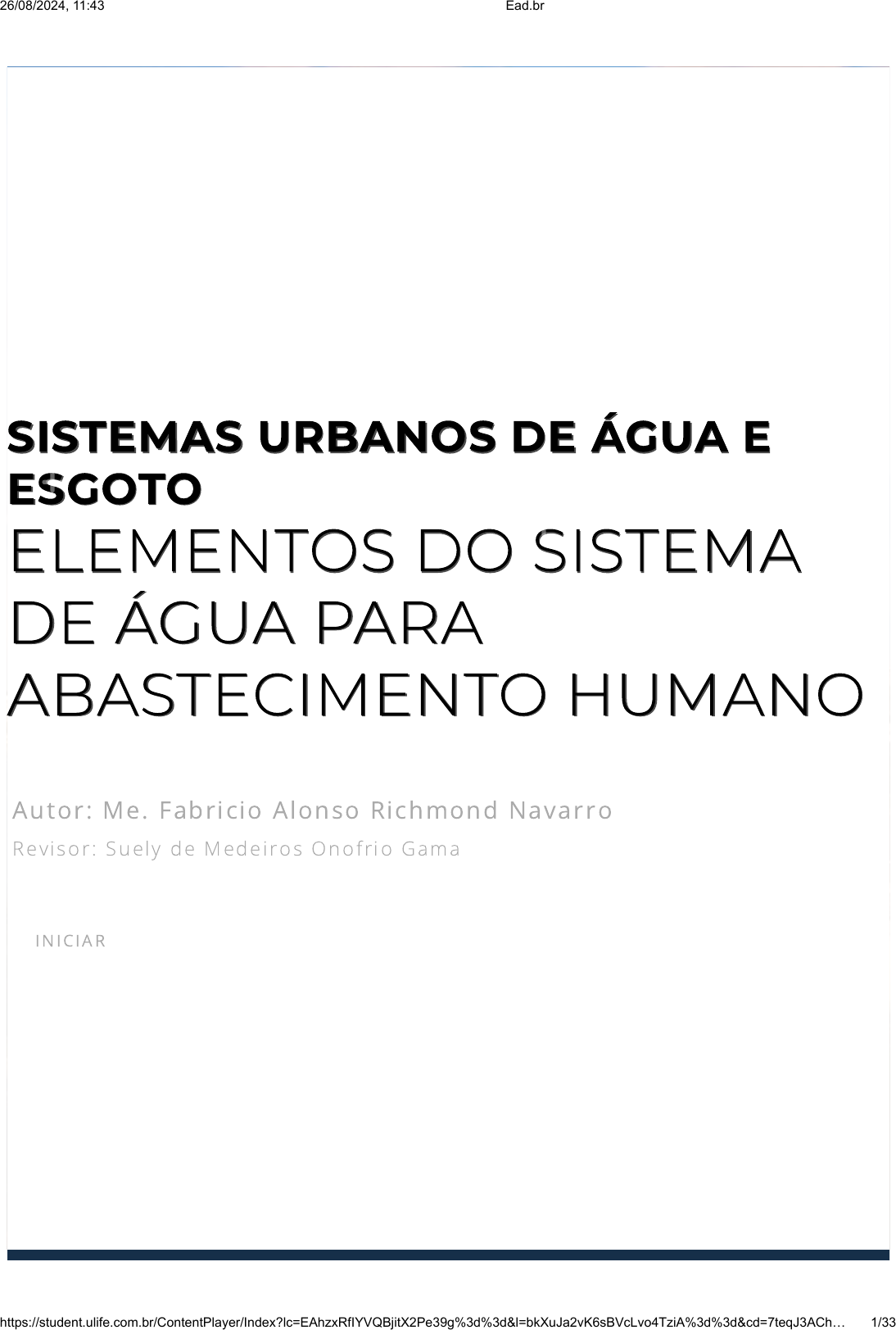 SISTEMAS URBANOS DE ÁGUA ESISTEMAS URBANOS DE ÁGUA E ESGOTOESGOTO ELEMENTOS DO SISTEMAELEMENTOS DO SISTEMA DE ÁGUA PARADE ÁGUA PARA ABASTECIMENTO HUMANOABASTECIMENTO HUMANO Autor: Me. Fabricio Alonso Richmond Navarro Revisor : Suely de Medeiros Onofr io Gama IN IC IAR 26/08/2024, 11:43 Ead.br https://student.ulife.com.br/ContentPlayer/Index?lc=EAhzxRfIYVQBjitX2Pe39g%3d%3d&l=bkXuJa2vK6sBVcLvo4TziA%3d%3d&cd=7teqJ3ACh… 1/33 introdução Introdução O percurso da água desde que é retirada do manancial pela captação até chegar a residências, comércios, indústrias e prédios públicos demanda um extenso e complexo processo. Em seu caminho, essa água deve ser primeiramente tratada, para obter certos padrões de potabilidade, e daí ser armazenada e distribuída, para suprir as necessidades dos consumidores, mantendo a qualidade estabelecida. Para isso, estimado estudante, é necessário um estruturado processo de concepção, projeto, construção e manutenção das partes constituintes do sistema de abastecimento de água. Assim, na presente unidade vamos estudar: Tratamento de água para abastecimento humano. Adutoras e estações elevatórias. Reservatórios e redes de distribuição. Controle e redução de perdas. 26/08/2024, 11:43 Ead.br https://student.ulife.com.br/ContentPlayer/Index?lc=EAhzxRfIYVQBjitX2Pe39g%3d%3d&l=bkXuJa2vK6sBVcLvo4TziA%3d%3d&cd=7teqJ3ACh… 2/33 Nas redes de abastecimento, o acondicionamento da água é realizado na Estação de Tratamento de Água, conhecida comumente como ETA. A água tomada do manancial, chamada de “água bruta”, passa por vários processos e unidades que evitam qualquer tipo de risco sanitário para os usuários e adequa a água aos padrões de potabilidade requeridos pelas autoridades ambientais, tornando-se água tratada, sendo esta a que chega a ser distribuída. A presente seção explica as principais operações unitárias e o processo de tratamento segundo a ABNT-NBR 12.216/1992 — “Projeto de estação de tratamento de água para abastecimento público”, a qual deve ser seguida na conceptualização e no projeto desse tipo de unidade. Operações Unitárias No presente texto, vamos chamar de “operações unitárias” aqueles processos simples ou individuais de tratamento, e chamaremos de “processos de tratamento” aqueles que englobam várias operações unitárias, estruturadas para a adequação completa da água. O Quadro 2.1 mostra as principais operações unitárias de tratamento de água. Tratamento de ÁguaTratamento de Água para Abastecimentopara Abastecimento HumanoHumano 26/08/2024, 11:43 Ead.br https://student.ulife.com.br/ContentPlayer/Index?lc=EAhzxRfIYVQBjitX2Pe39g%3d%3d&l=bkXuJa2vK6sBVcLvo4TziA%3d%3d&cd=7teqJ3ACh… 3/33 Operação unitária Descrição Gradeamento Reter os materiais grosseiros existentes nas águas super�ciais. Usualmente sua localização é na captação, mas em casos especiais pode ser localizado na ETA. Micropeneiramento Reter sólidos �nos não coloidais em suspensão. Utiliza-se para retirar algas ou outros microrganismos, ou quando sua utilização traz algum benefício econômico ao sistema. Aeração/Oxidação Introdução de ar na água para remoção de gases indesejáveis e compostos voláteis e oxidação de certos elementos. Adsorção Contato da água com alguma substância absorvente para a remoção de impurezas que podem causar sabor, cor ou cheiro, usualmente aplicando o carvão ativado. Mistura rápida/ Coagulação Dispersão de produtos químicos na água bruta, tipicamente usada na adição de coagulante, desestabilizando impurezas para facilitar seu aumento de tamanho na �oculação. Floculação Promove o contato entre impurezas pela agitação, visando aumentar seu tamanho para a remoção. Decantação Remoção de impurezas na água pela ação da gravidade; usualmente depois da �oculação é realizada a decantação das partículas formadas nessa fase. Flotação Contrária à decantação: as impurezas são levadas para a superfície com ajuda da injeção de ar (microbolhas). 26/08/2024, 11:43 Ead.br https://student.ulife.com.br/ContentPlayer/Index?lc=EAhzxRfIYVQBjitX2Pe39g%3d%3d&l=bkXuJa2vK6sBVcLvo4TziA%3d%3d&cd=7teqJ3ACh… 4/33 Quadro 2.1 - Principais operações unitárias de tratamento de água Fonte: Adaptado de ABNT (1992) e Heller e Pádua (2010). O Quadro 2.1 apresentou de maneira sintética os típicos processos para remoção de contaminantes e impurezas; ainda é necessária a realização de estudos de tratabilidade da água bruta para calibração e escolha dos processos mais indicados em cada caso. Processos de Tratamento O mais recomendado quando se planeja um sistema de abastecimento de água é que o manancial esteja o mais livre possível de qualquer tipo de contaminação ou poluição, Filtração em meio granular “Remoção de material particulado presente na água, fazendo-a passar por um leito contendo meio granular (usualmente areia e/ou antracito).” (HELLER; PÁDUA, 2010, p. 534) Filtração em membrana Remoção de contaminantes de menor tamanho com a utilização de membranas. Desinfecção Processo para inativar microrganismos patogênicos; tem caráter preventivo e corretivo. Entres os agentes químicos utilizados, tem-se: cloro, bromo, ozônio, entre outros. Ademais, podem ser usados agente físicos, como calor e radiação ultravioleta. Fluoretação Processo utilizado para combater as cáries infantis, com o reforço do esmalte, adicionando íon �uoreto na água. Estabilização química Processo para evitar pHs elevados ou relativamente baixos, evitando problemas de incrustação e corrosão. Abrandamento Redução da dureza da água e dos contaminantes inorgânicos. 26/08/2024, 11:43 Ead.br https://student.ulife.com.br/ContentPlayer/Index?lc=EAhzxRfIYVQBjitX2Pe39g%3d%3d&l=bkXuJa2vK6sBVcLvo4TziA%3d%3d&cd=7teqJ3ACh… 5/33 mesmo que seja necessária a utilização de adutoras e estações de re