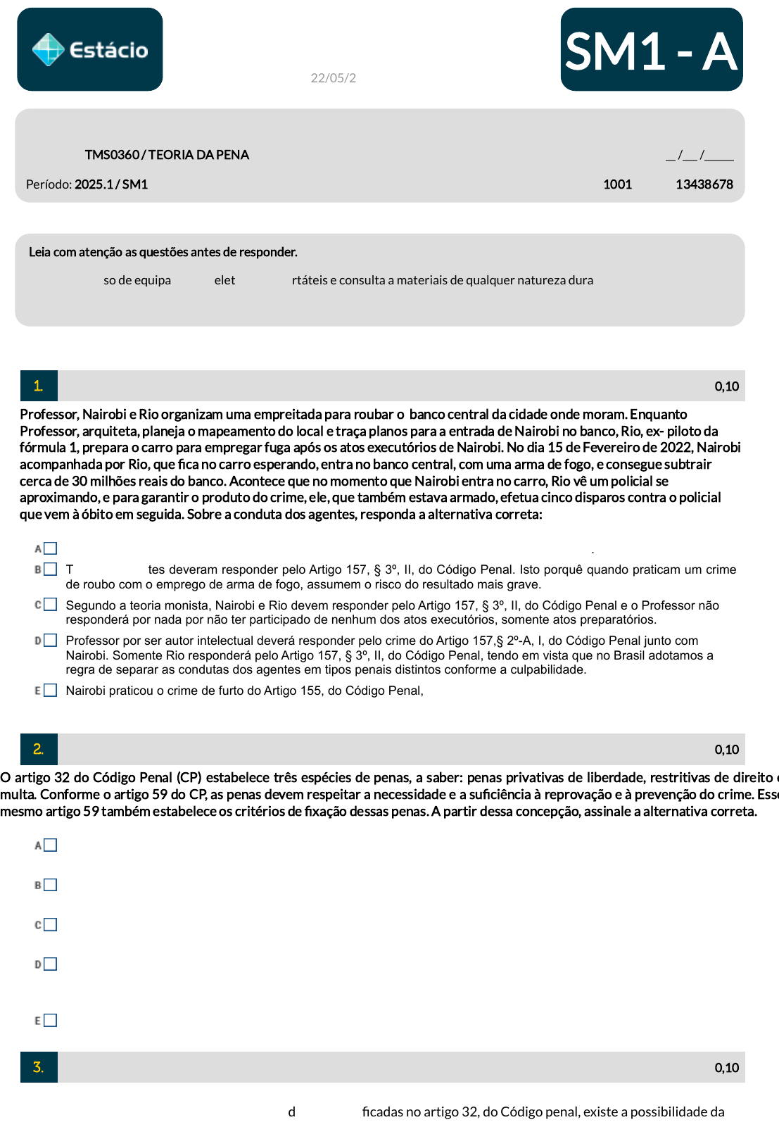 7049195600 SM1 - A 22/05/2025 09:30 Nome: Matrícula: ____________________ Disciplina: TMS0360 / TEORIA DA PENA Data: ___ /___ /______ Período: 2025.1 / SM1 Turma: 1001 NSQ: 13438678 Leia com atenção as questões antes de responder. É proibido o uso de equipamentos eletrônicos portáteis e consulta a materiais de qualquer natureza durante a realização da prova. Boa prova. 1. _______ de 0,10 Professor, Nairobi e Rio organizam uma empreitada para roubar o banco central da cidade onde moram. Enquanto Professor, arquiteta, planeja o mapeamento do local e traça planos para a entrada de Nairobi no banco, Rio, ex- piloto da fórmula 1, prepara o carro para empregar fuga após os atos executórios de Nairobi. No dia 15 de Fevereiro de 2022, Nairobi acompanhada por Rio, que fica no carro esperando, entra no banco central, com uma arma de fogo, e consegue subtrair cerca de 30 milhões reais do banco. Acontece que no momento que Nairobi entra no carro, Rio vê um policial se aproximando, e para garantir o produto do crime, ele, que também estava armado, efetua cinco disparos contra o policial que vem à óbito em seguida. Sobre a conduta dos agentes, responda a alternativa correta: Segundo a teoria monista,Nairobi não responde por nada porque não praticou o ato executório. Todos os agentes deveram responder pelo Artigo 157, § 3º, II, do Código Penal. Isto porquê quando praticam um crime de roubo com o emprego de arma de fogo, assumem o risco do resultado mais grave. Segundo a teoria monista, Nairobi e Rio devem responder pelo Artigo 157, § 3º, II, do Código Penal e o Professor não responderá por nada por não ter participado de nenhum dos atos executórios, somente atos preparatórios. Professor por ser autor intelectual deverá responder pelo crime do Artigo 157,§ 2º-A, I, do Código Penal junto com Nairobi. Somente Rio responderá pelo Artigo 157, § 3º, II, do Código Penal, tendo em vista que no Brasil adotamos a regra de separar as condutas dos agentes em tipos penais distintos conforme a culpabilidade. Nairobi praticou o crime de furto do Artigo 155, do Código Penal, pois, não empregou violência e nem ameaça. Enquanto Professor e Rio respondem pelo Artigo 157, § 3º, II, do Código Penal. 2. _______ de 0,10 O artigo 32 do Código Penal (CP) estabelece três espécies de penas, a saber: penas privativas de liberdade, restritivas de direito e multa. Conforme o artigo 59 do CP, as penas devem respeitar a necessidade e a suficiência à reprovação e à prevenção do crime. Esse mesmo artigo 59 também estabelece os critérios de fixação dessas penas. A partir dessa concepção, assinale a alternativa correta. A pena privativa de liberdade - detenção - deverá ser iniciada em regime prisional mais severo (fechado), mesmo que inferior a 08 anos. A pena de multa é sempre aplicada e dosada ao livre arbítrio do julgador, não havendo um sistema para a sua aferição A pena privativa de liberdade aplicada a crime hediondo praticado com violência ou grave ameaça é suscetível de substituição por restritiva de direito, se fixada em menos de 04 anos de reclusão. As penas restritivas de direito são consideradas penas de caráter substitutivo, podendo ser aplicadas para crimes culposos independente da quantidade de pena privativa de liberdade fixada, se presentes os demais requisitos legais favoráveis. Nenhuma das alternativas 3. _______ de 0,10 Em relação as espécies de sanções penais em nosso ordenamneto jurídico penal, temos a possibilidade de aplicação de pena ou de medida de segurança. Entre as espécies de penas tipificadas no artigo 32, do Código penal, existe a possibilidade da substituição da pena privativa de liberdade por penas restritivas de direito. Quais das espécies abaixo sâo de penas restritivas de direitos o regime aberto e remição. a multa e prestação de serviço à comunidade. o livramento condicional e comutação. a prisão administrativa e limitação de fim de semana. a prestação pecuniária e interdição temporária de direitos. 4. _______ de 0,10 Com base no texto a seguir, marque a opção que corresponda a espécie de concurso de crimes narrado: "Quando o agente, mediante mais de uma ação ou omissão, pratica dois ou mais crimes, idênticos ou não, aplicam-se cumulativamente as penas privativas de liberdade em que haja incorrido. No caso de aplicação cumulativa de penas de reclusão e de detenção, executa-se primeiro aquela." (art. 69 do Código Penal) Resultado diverso do pretendido Crime continuado Erro na execução Concurso formal Concurso material 5. _______ de 0,10 Quanto à aplicação da pena, é correto afirmar que A incidência da circunstância atenuante pode conduzir à redução da pena abaixo do mínimo legal. A reincidência penal pode ser considerada como circunstância agravante e, simultaneamente, como circunstância judicial. Na hipótese de concorrerem causas de aumento ou diminuição de pena previstas na Parte Especial do Código Penal, o juiz pode fazer um só aumento ou uma única redução sendo inaplicável esta regra à Parte Geral. No concurso de agravantes e atenuantes, entende-se por circunstâncias preponderantes as que resultam dos motivos determinantes do crime, da personalidade do agente e consequências do crime. Na hipótese de concorrerem causas de aumento ou diminuição de pena previstas na Parte Especial do Código Penal, o juiz pode fazer um só aumento ou uma única redução, o que se aplica à Parte Geral, igualmente. 6. _______ de 0,10 Paulo condenado pelo crime de furto simples (CP, art. 155, caput), que tem pena de reclusão de 1 a 4 anos. Saído a sentença, esta transitou em julgado para a acusação. Na primeira fase de dosimetria, a pena base foi fixada no mínimo legal. Foram reconhecidas circunstâncias agravantes, a pena foi majorada em 1/2 (metade). Por fim, em razão da continuidade delitiva, a pena foi novamente aumentada em 1/2 (metade). A prescriç