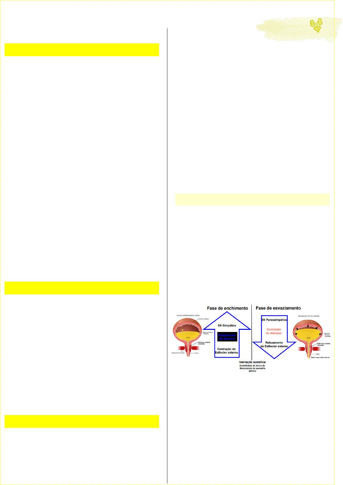 MED UNIFTC 2022.2 – 7º semestre | Anna Beatriz Fonseca DEFINIÇÃO Urgência, com ou sem incontinência (desejo súbito podendo ou não ter perda de urina), geralmente com aumento da frequência diurna de micções e noctúria na ausência de infecção comprovada ou outra patologia evidente. A bexiga hiperativa tem clínica muito semelhante à HPB, que é a patologia mais comum da urologia, confundindo o urologista; Pode não haver aumento da frequência urinária em casos que o paciente já se adaptou à bexiga hiperativa (quadros de urgência com frequência urinária baixa): Paciente passa a beber menos água para compensar a bexiga hiperativa e, por isso, continua urgente, mas reduz a produção de urina, reduzindo a frequência urinária. Mulheres que têm costume de prender urina podem prejudicar o desempenho do detrusor ao longo da vida, tornando-se incontinentes quando idosas - incontinência é incapacidade de segurar a urina aos esforços físicos; A urgência pode começar sendo leve à noite (noctúria mais intensa que frequência diurna) e isso se explica pelo relaxamento do corpo ao dormir (“preguiça” do corpo acordar e urinar) - isso aponta para uma hiperatividade da bexiga precoce, ou seja, hiperatividade do detrusor que ainda não é BH: No idoso, associa-se à fratura de fêmur. EPIDEMIOLOGIA Em um estudo nacional, 20 milhões de brasileiros sofrem com bexiga hiperativa, ou seja, quase 10% da população. Em Europa e EUA, 17% da população adulta tem sintomas de bexiga hiperativa; A prevalência aumenta com a idade e é similar entre homens e mulheres; Os sintomas mais prevalentes são noctúria, frequência urinária aumentada e gotejamento terminal (lembra HPB); Interferência na qualidade de vida (está entre as maiores causas de internação): Depressão (18%), coitofobia (15%) e problemas profissionais (42%). NEUROFIS IOLOGIA DA M ICÇÃO A função vesical se associa basicamente ao momento de armazenamento e esvaziamento, que se dão com a coordenação das musculaturas lisas estriadas. Bexiga X Tríade (colo vesical, uretra e esfíncter externo – todos têm músculo liso estriado): A bexiga possui o músculo detrusor, já a tríade representa outras estruturas que podem estar alteradas e influenciar na função vesical (além da próstata no homem): 1. Fase de enchimento (SNAS): Relaxa o músculo detrusor para esticar e contrai o esfíncter externo para não haver escape; 2. Fase de esvaziamento (SNAP): Contrai o musculo detrusor e relaxa o esfíncter externo para ocorrer a micção; 3. Inervação somática (SNS): Estabilidade do tônus da musculatura do assoalho pélvico (se fraco, há desarranjo estrutural que sobrecarrega detrusor – ex cistocele). Cérebro, medula e gânglios periféricos: Controlam, através do SNA, a bexiga e a tríade (controla todo músculo do corpo). FIS IOPATOLOGIA DA BEXIGA HIPERATIVA O músculo detrusor começa a trabalhar contra a obstrução prostática e se hipertrofia, mas chega um momento que as fibras musculares dele chegam ao limite, tornando-se estático, o que leva à hipocontratilidade de bexiga: Até chegar à hipocontratilidade, há um desequilíbrio elétrico devido ao desarranjo de fibras musculares na tentativa de manutenção do esvaziamento; Nesse meio tempo, ocorre arritmia vesical por falha de reentrada elétrica - reentrada elétrica para que a atividade elétrica continue a se dissipar. 3 teorias básicas para hiperatividade da bexiga: Baixa oxigenação por placas ateroscleróticas de bexiga (fluxo vesical reduzido) - controversa por acometer jovens e não só pacientes idosos; Desarranjo celular por processo inflamatório vesical desconhecido (gera alterações elétricas na bexiga que não se sabe explicar ao certo); Falha de transmissão elétrica para os receptores colinérgicos da bexiga: O mecanismo de esvaziamento e de enchimento da bexiga se dá pelo SNAP e SNAS, através de receptores colinérgicos na maioria dos músculos - mais aceita. Bexiga hiperativa bexiga hiperativa UROLOGIA MED UNIFTC 2022.2 – 7º semestre | Anna Beatriz Fonseca ETIOLOGIA A bexiga hiperativa e a hiperatividade detrusora podem estar associadas tanto com desordens neurológicas, quanto mudanças na inervação periférica e componentes da musculatura lisa e esquelética. Idade: Aumento ou redução de acetil-colina; Fatores obstrutivos (HPB): Denervação colinérgica do detrusor Isquemia: HPB, estenose de uretra, dissinergia, DVP, DM; Inflamação: Aumento de NGF, causando mudanças na transmissão aferente ou sináptica; Fatores psicológicos: Alterações nos níveis de serotonina; Gênero: Concentração de 5-hidroxitriptamina hormonalmente induzida. INERVAÇÃO O urotélio é basicamente composto por células intersticiais e, quando há ruptura da integridade epitelial, os nervos sensitivos são afetados. O estudo urodinâmico da bexiga é feito com a passagem de uma sonda dentro da bexiga e na ponta dela tem um sensor de pressão, que capta aumento de pressão durante o enchimento da bexiga e o transforma em um traçado como o ECG: Ou seja, o estímulo chega na musculatura detrusora através de nervos sensitivos; Acredita-se que a alteração elétrica é causada pela ruptura da integridade epitelial dentro da bexiga (e não no músculo): Cistite inflamatória faz alterações devido à inflamação dentro da bexiga que as vezes cursam com distúrbios elétricos semelhantes à hiperatividade da bexiga (diferente por micção bifásica, discrepância desejo- volume); Qualquer coisa que perturbe a atividade elétrica da bexiga causa hiperatividade (ex. inflamação e câncer de bexiga). QUADRO CLÍNICO Urgência (vários episódios/dia) ou urge-incontinência (ocasional); Aumento da frequência miccional (11x/24h); Noctúria 2 a 3x (sem poliúria); Volume miccional usual 130-210ml (300-500); Volume miccional de 24h 1,3 a 1,4L (2 a 3,5L); Raros episódios de incontinência urinária aos esforços; Bom jato com se