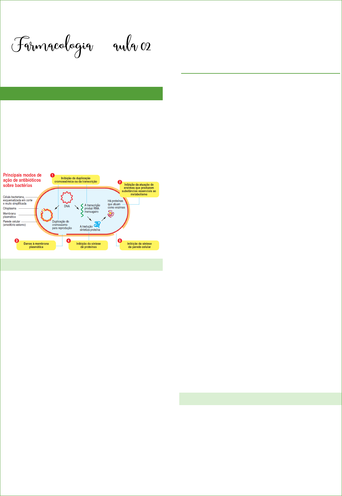 Larissa Costa – 4° semestre – FTC 1 – BETALACTÂMICOS CLASSIFICAÇÃO GERAL DOS ANTIMICROBIANOS → Inibidores da síntese proteica → Inibidores da síntese da parede celular (antimicrobianos betalactâmicos) o Agindo na parede interna o Agindo na parede externa → Inibidores do metabolismo → Inibidores dos ácidos nucléicos RESISTÊNCIA BACTERIANA → Os antimicrobianos devem ser capazes de: o Alcançar os alvos moleculares, que são primariamente intracelulares. Para isso, o antimicrobiano, em quantidades suficientes, precisa ultrapassar a membrana celular bacteriana. o Interagir com uma molécula-alvo de modo a desencadear a morte da bactéria. o Evitar a ação das bombas de efluxo que jogam antimicrobianos para fora da célula bacteriana. o Evitar a inativação por enzimas capazes de modficar o fármaco no ambiente extracelular ou no interior da célula bacteriana. → Com frequência bactérias utilizam mais de uma estratégia para evitar a ação dos antimicrobianos, assim, a ação conjunta de múltiplos mecanismos pode produzir um acentuado aumento da resistência aos antimicrobianos. → A resistência a determinado antimicrobiano pode constituir uma propriedade intrínseca de uma espécie bacteriana ou uma capacidade adquirida. → Para adquirir resistência, a bactéria deve alterar seu DNA, material genético, que ocorre de duas formas: o Indução de mutação no DNA nativo o Introdução de um DNA estranho – genes de resistência – que podem ser transferidos entre gêneros ou espécies diferentes de bactérias. MECANISMOS DE RESISTÊNCIA BACTERIANA → ALTERAÇÃO DA PERMEABILIDADE: A permeabilidade limitada constitui uma propriedade da membrana celular externa de lipopolissacarídeo das bactérias Gram- negativas. o A permeabilidade dessa membrana reside na presença de proteínas especiais, as porinas, que estabelecem canais específicos pelos quais as substâncias podem passar para o espaço periplasmático e, em seguida, para o interior da célula. o Algumas bactérias utilizam as porinas para expulsar o antibiótico assim que ele entra dentro dela, não exercendo sua ação. → ALTERAÇÃO DO SÍTIO DE AÇÃO DO ANTIMICROBIANO: A alteração do local-alvo onde atua determinado antimicrobiano, de modo a impedir a ocorrência de qualquer efeito inibitório ou bactericida, constitui um dos mais importantes mecanismos de resistência. → BOMBA DE EFLUXO: O bombeamento ativo de antimicrobianos do meio intracelular para o extracelular, isto é, o seu efluxo ativo, produz resistência bacteriana a determinados antimicrobianos. → MECANISMO ENZIMÁTICO: As β-lactamases hidrolisam a ligação amida do anel beta-lactâmico, destruindo, assim, o local onde os antimicrobianos β-lactâmicos ligam-se às proteínas de ligação da penicilina (PBPs) bacterianas e através do qual exercem seu efeito antibacteriano. o Essas enzimas são codificadas em cromossomos ou sítios extracromossômicos através de plasmídeos ou transposons, podendo ser produzidas de modo constitutivo ou ser induzido o O mecanismo de resistência bacteriano mais importante e frequente é a degradação do antimicrobiano por enzimas. BACTERIAM GRAM +/- → As bactérias gram + possuem uma extensa parede de peptideoglicano, sendo mais sensível aos antibióticos e se corando de roxo. → Já as bactérias gram -, possuem uma parede de peptídeoglicano muito mais fina, porém possui duas Larissa Costa – 4° semestre – FTC 2 membranas, sendo uma intracelular e outra extracelular, o que confere mais resistência ao antibiótico. INIBIDORES DA SÍNTESE DA PAREDE CELULAR Β-LACTÂMICOS → Representantes: o Penicilinas o Cefalosporinas o Monobactâmicos o Carbapenêmicos PENICILINAS → Tipos: o Penicilinas naturais o Resistentes às penicilinases o Amplo espectro o Antipseudomonas o Associação de penicilinas + aminoglicosídeos. → Exibem maior atividade contra: Microrganismos Gram- positivos, cocos Gram-negativos e anaeróbios não produtores de β-lactamase. → Apresentam pouca atividade contra: bastonetes Gram- negativos e são sensíveis à hidrólise pelas b-lactamases. → MECANISMO DE AÇÃO: As penicilinas, à semelhança de todos os antibióticos β-lactâmicos, inibem o crescimento das bactérias ao interferir na reação de transpeptidação da síntese da parede celular bacteriana. o A parede celular é uma camada externa rígida que circunda totalmente a membrana citoplasmática mantém o formato e a integridade da célula e impede a sua lise em consequência de pressão osmótica elevada. o A parede celular é constituída de um polímero complexo de polissacarídeos e polipeptídeos de ligação cruzada, o peptidoglicano (também conhecido como mureina ou mucopeptídeo). o O polissacarídeo contém aminoaçúcares alternados, N-acetilglicosamina e ácido N- acetilmurâmico. o Existe um peptídeo ligado ao açúcar do ácido N- acetilmurâmico, sendo que esse peptídeo termina em d-alanil-d-alanina. o A proteína de ligação da penicilina (PBP, uma enzima) remove a alanina terminal no processo de formação de uma ligação cruzada com um peptídeo adjacente, fazendo com que a síntese da parede celular da bactéria seja interrompida. o E assim, causando a morte bacteriana por citólise, induzida pela pressão osmótica. o O antibiótico provoca efeito bactericida na bactéria, induzindo sua lise. → ESPECTRO DE AÇÃO o Naturais (são as mais simples) o Resistentes a penicilinases o De espectro estendido o Antipesudomonas USO CLÍNICO → PENICILINAS NATURAIS o atividade contra GRAM + o Pneumonia Pneumocócica o Gonorréia o Sífilis o Penicilina G: Exibem maior atividade contra microrganismos Gram-positivos, cocos Gram- negativos e anaeróbios não produtores de b- lactamase. ▪ Apresentam pouca atividade contra bastonetes Gram-negativos e são sensíveis à hidrólise pelas b-lactamases. ▪ Constitui o fármaco de escolha no tratamento de infecções causadas por e