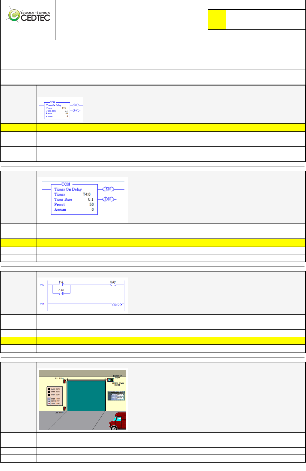 Pincel Atômico - 02/06/2025 19:35:41 1/2 ALMIR GONÇALVES NUNES Exercício Caminho do Conhecimento - Etapa 12 (21123) Atividade finalizada em 01/06/2025 14:37:16 (4084370 / 1) LEGENDA Resposta correta na questão # Resposta correta - Questão Anulada X Resposta selecionada pelo Aluno Disciplina: CONTROLADOR LÓGICO PROGRAMÁVEL [1006009] - Avaliação com 4 questões, com o peso total de 13,33 pontos [capítulos - 113] Turma: Curso Técnico: Eletrotécnica - Grupo: JANEIRO/24 PRES - N.ELET.Jan.24 [110391] Aluno(a): 91542267 - ALMIR GONÇALVES NUNES - Respondeu 3 questões corretas, obtendo um total de 10,00 pontos como nota [350096_127518] Questão 001 Dado o temporizador a seguir, quanto tempo ele demorará para acumular o valor de 1 em Accum assim que sua entrada for desenergizada? X Ele nunca acumulará valor algum em Accum 5 segundos 50 segundos 1 segundos 0 segundos [350097_127512] Questão 002 Dado o temporizador a seguir, quanto tempo ele demorará para energizar DN quando sua entrada for energizada? 50 segundos 1 segundos X 5 segundos Ele nunca energizará DN 0 segundos [350096_127504] Questão 003 Dado o Ladder abaixo, qual opção corresponde mais fielmente ao comportamento do circuito abaixo? Se for acionado o botão que está sob o endereço I:1/0 a saída O:2/0 desenergizará. Se for acionado o botão que está sob o endereço I:1/0 a saída O:2/0 energizará. Independente do botão, quando a entrada vinculada a I:1/0 for energizada a saída O:2/0 será desenergizada. Independente do botão, quando a entrada vinculada a I:1/0 for energizada a saída O:2/0 será energizada. X Quando O:2/0 for energizada, ela se manterá energizada. [350097_127494] Questão 004 Dada a planta a seguir, qual alternativa está INCORRETA? Exemplos de saída da planta: MOTOR DOWN Exemplo de saída da planta: MOTOR UP Exemplo de entrada da planta: STOP Exemplo de entrada da planta: LS1 Pincel Atômico - 02/06/2025 19:35:41 2/2 X Exemplo de entrada da planta: AJAR