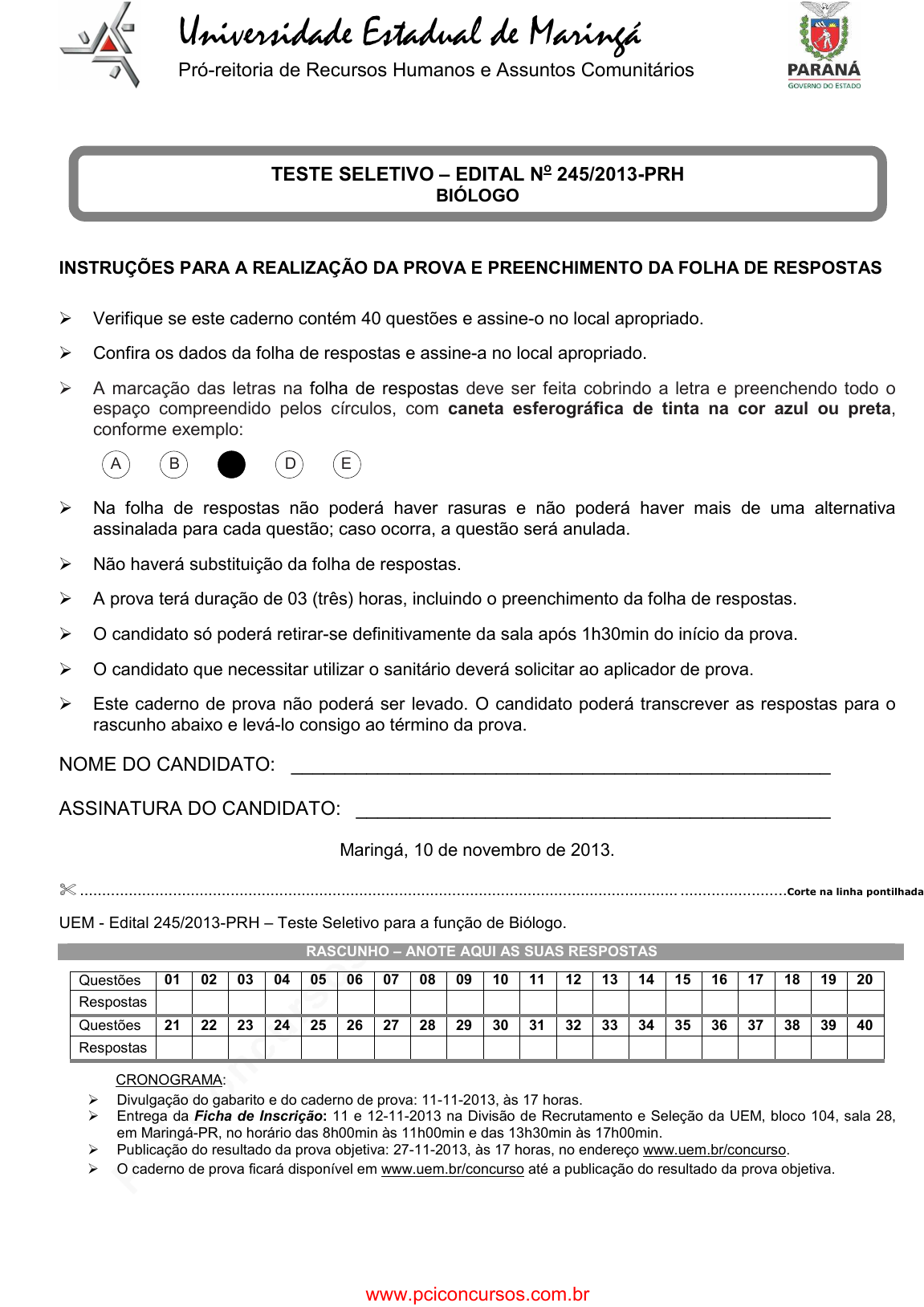 pcimarkpci MjgwNDowMTRjOmRhYTc6ODMzZjphODJhOjA5YTE6YmUwZToyNTZi:RnJpLCAyMCBKdW4gMjAyNSAxMzo0Mzo0NyAtMDMwMA== www.pciconcursos.com.br Universidade Estadual de Maringá Pró-reitoria de Recursos Humanos e Assuntos Comunitários INSTRUÇÕES PARA A REALIZAÇÃO DA PROVA E PREENCHIMEN TO DA FOLHA DE RESPOSTAS � Verifique se este caderno contém 40 questões e assine-o no local apropriado. � Confira os dados da folha de respostas e assine-a no local apropriado. � A marcação das letras na folha de respostas deve ser feita cobrindo a letra e preenchendo todo o espaço compreendido pelos círculos, com caneta esferográfica de tinta na cor azul ou preta , conforme exemplo: A B C D E � Na folha de respostas não poderá haver rasuras e não poderá haver mais de uma alternativa assinalada para cada questão; caso ocorra, a questão será anulada. � Não haverá substituição da folha de respostas. � A prova terá duração de 03 (três) horas, incluindo o preenchimento da folha de respostas. � O candidato só poderá retirar-se definitivamente da sala após 1h30min do início da prova. � O candidato que necessitar utilizar o sanitário deverá solicitar ao aplicador de prova. � Este caderno de prova não poderá ser levado. O candidato poderá transcrever as respostas para o rascunho abaixo e levá-lo consigo ao término da prova. NOME DO CANDIDATO: __________________________________________________ ASSINATURA DO CANDIDATO: ____________________________________________ Maringá, 10 de novembro de 2013. � ....................................................................................................................................... ........................Corte na linha pontilhada UEM - Edital 245/2013-PRH – Teste Seletivo para a função de Biólogo. RASCUNHO – ANOTE AQUI AS SUAS RESPOSTAS Questões 01 02 03 04 05 06 07 08 09 10 11 12 13 14 15 16 17 18 19 20 Respostas Questões 21 22 23 24 25 26 27 28 29 30 31 32 33 34 35 36 37 38 39 40 Respostas CRONOGRAMA: � Divulgação do gabarito e do caderno de prova: 11-11-2013, às 17 horas. � Entrega da Ficha de Inscrição : 11 e 12-11-2013 na Divisão de Recrutamento e Seleção da UEM, bloco 104, sala 28, em Maringá-PR, no horário das 8h00min às 11h00min e das 13h30min às 17h00min. � Publicação do resultado da prova objetiva: 27-11-2013, às 17 horas, no endereço www.uem.br/concurso. � O caderno de prova ficará disponível em www.uem.br/concurso até a publicação do resultado da prova objetiva. TESTE SELETIVO – EDITAL No 245/2013-PRH BIÓLOGO www.pciconcursos.com.br pcimarkpci MjgwNDowMTRjOmRhYTc6ODMzZjphODJhOjA5YTE6YmUwZToyNTZi:RnJpLCAyMCBKdW4gMjAyNSAxMzo0Mzo0NyAtMDMwMA== www.pciconcursos.com.br Universidade Estadual de Maringá - Teste Seletivo - Edital nº 245/2013-PRH BIÓLOGO 2 CONHECIMENTO ESPECÍFICO Questão 01 O herbário serve como referência para subsidiar diversos estudos em botânica e em diferentes outras áreas da ciência. Sobre as coleções depositadas em herbários é correto afirmar que: A) Os espécimes dos herbários formam a base para a maioria da nossa compreensão dos padrões de variação das plantas na natureza. B) As plantas vivas que são depositadas nos herbários garantem a perpetuação da espécie na natureza. C) As duplicatas e unicatas refletem a variação morfológica existente entre os táxons supragenéricos de uma população. D) As exsicatas são ramos de plantas vivas ou mortas que representam a flora de uma determinada região. E) As duplicatas depositadas nos herbários são importantes porque registram a variação morfológica de todos os indivíduos da população. Questão 02 Sobre a importância de um herbário é correto afirmar que: A) Um herbário pode abrigar coleções dos vários grupos de plantas, fungos e algas, preparados e preservados de acordo com as características de cada um. B) O herbário não poderá abrigar espécimes ainda não descritos pela ciência. C) Os tipos nomenclaturais depositados nos herbários estão disponíveis apenas para a comunidade acadêmica e científica. D) Os herbários com maior número de tombos registrados recebem mais atenção pelos taxonomistas, pois podem abrigar uma maior diversidade de duplicatas. E) A importância de um herbário está vinculada ao número de holótipos e de duplicatas que ele preserva. Questão 03 A coleta e herborização de plantas, fungos e algas são práticas rotineiras em um herbário. Em relação a essas atividades marque o que for correto . A) As prensas são utilizadas para desidratar e esterilizar o material coletado. B) A coleta de materiais úmidos requer a troca frequente dos jornais para evitar a proliferação de fungos. C) Todo espécime coletado deve conter duplicatas, exceto as epífitas. D) Ao coletar um espécime vegetal não é necessário mostrar a filotaxia da planta coletada. E) Caso não seja possível prensar as plantas no dia da coleta é aconselhável mantê-las em sacos plásticos em estufas à 25ºC. Questão 04 A coleta de algas pode ser realizada para diversas finalidades, dentre elas para a incorporação do material no acervo de um herbário. Em relação à coleta de algas é correto afirmar que: A) As amostras de algas podem ser fixadas em álcool 40%, mas esse fixador pode dificultar posteriormente a identificação do material. B) No herbário as exsicatas de algas são mantidas em ambientes úmidos e com ventilação. C) As algas microscópicas devem ser desidratadas em carmim acético e secas em estufas. D) Toda exsicata de alga deve conter, obrigatoriamente, seus esporos. E) Para a preservação dos espécimes de algas em um herbário deve-se manter o ambiente bastante úmido e livre de contaminação por fungos e insetos. Questão 05 A utilização de uma metodologia adequada durante a coleta de material botânico é de extrema importância para que um determinado espécime possa ser incorporado a coleção do herbário e para que sirva, p