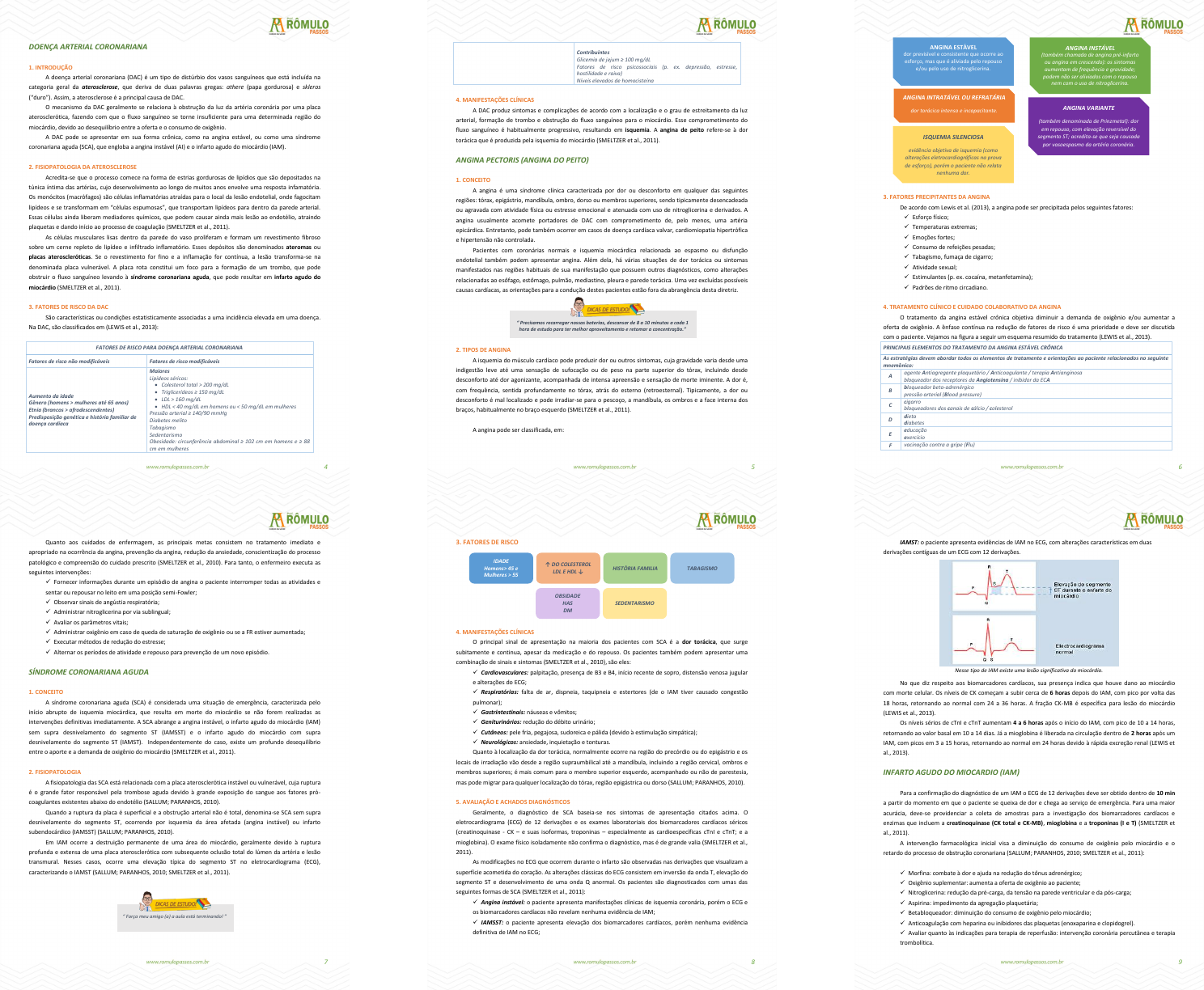 4 DOENÇA ARTERIAL CORONARIANA 1. INTRODUÇÃO A doença arterial coronariana (DAC) é um tipo de distúrbio dos vasos sanguíneos que está incluída na categoria geral da aterosclerose, que deriva de duas palavras gregas: athere (papa gordurosa) e skleros (“duro”). Assim, a aterosclerose é a principal causa de DAC. O mecanismo da DAC geralmente se relaciona à obstrução da luz da artéria coronária por uma placa aterosclerótica, fazendo com que o fluxo sanguíneo se torne insuficiente para uma determinada região do miocárdio, devido ao desequilíbrio entre a oferta e o consumo de oxigênio. A DAC pode se apresentar em sua forma crônica, como na angina estável, ou como uma síndrome coronariana aguda (SCA), que engloba a angina instável (AI) e o infarto agudo do miocárdio (IAM). 2. FISIOPATOLOGIA DA ATEROSCLEROSE Acredita-se que o processo comece na forma de estrias gordurosas de lipídios que são depositados na túnica íntima das artérias, cujo desenvolvimento ao longo de muitos anos envolve uma resposta infamatória. Os monócitos (macrófagos) são células inflamatórias atraídas para o local da lesão endotelial, onde fagocitam lipídeos e se transformam em “células espumosas”, que transportam lipídeos para dentro da parede arterial. Essas células ainda liberam mediadores químicos, que podem causar ainda mais lesão ao endotélio, atraindo plaquetas e dando início ao processo de coagulação (SMELTZER et al., 2011). As células musculares lisas dentro da parede do vaso proliferam e formam um revestimento fibroso sobre um cerne repleto de lipídeo e infiltrado inflamatório. Esses depósitos são denominados ateromas ou placas ateroscleróticas. Se o revestimento for fino e a inflamação for contínua, a lesão transforma-se na denominada placa vulnerável. A placa rota constitui um foco para a formação de um trombo, que pode obstruir o fluxo sanguíneo levando à síndrome coronariana aguda, que pode resultar em infarto agudo do miocárdio (SMELTZER et al., 2011). 3. FATORES DE RISCO DA DAC São características ou condições estatisticamente associadas a uma incidência elevada em uma doença. Na DAC, são classificados em (LEWIS et al., 2013): FATORES DE RISCO PARA DOENÇA ARTERIAL CORONARIANA Fatores de risco não modificáveis Fatores de risco modificáveis Aumento da idade Gênero (homens > mulheres até 65 anos) Etnia (brancos > afrodescendentes) Predisposição genética e história familiar de doença cardíaca Maiores Lipídeos séricos: Colesterol total > 200 mg/dL Triglicerídeos ≥ 150 mg/dL LDL > 160 mg/dL HDLtodas as atividades e sentar ou repousar no leito em uma posição semi-Fowler; Observar sinais de angústia respiratória; Administrar nitroglicerina por via sublingual; Avaliar os parâmetros vitais; Administrar oxigênio em caso de queda de saturação de oxigênio ou se a FR estiver aumentada; Executar métodos de redução do estresse; Alternar os períodos de atividade e repouso para prevenção de um novo episódio. SÍNDROME CORONARIANA AGUDA 1. CONCEITO A síndrome coronariana aguda (SCA) é considerada uma situação de emergência, caracterizada pelo início abrupto de isquemia miocárdica, que resulta em morte do miocárdio se não forem realizadas as intervenções definitivas imediatamente. A SCA abrange a angina instável, o infarto agudo do miocárdio (IAM) sem supra desnivelamento do segmento ST (IAMSST) e o infarto agudo do miocárdio com supra desnivelamento do segmento ST (IAMST). Independentemente do caso, existe um profundo desequilíbrio entre o aporte e a demanda de oxigênio do miocárdio (SMELTZER et al., 2011). 2. FISIOPATOLOGIA A fisiopatologia das SCA está relacionada com a placa aterosclerótica instável ou vulnerável, cuja ruptura é o grande fator responsável pela trombose aguda devido à grande exposição do sangue aos fatores pró- coagulantes existentes abaixo do endotélio (SALLUM; PARANHOS, 2010). Quando a ruptura da placa é superficial e a obstrução arterial não é total, denomina-se SCA sem supra desnivelamento do segmento ST, ocorrendo por isquemia da área afetada (angina instável) ou infarto subendocárdico (IAMSST) (SALLUM; PARANHOS, 2010). Em IAM ocorre a destruição permanente de uma área do miocárdio, geralmente devido à ruptura profunda e extensa de uma placa aterosclerótica com subsequente oclusão total do lúmen da artéria e lesão transmural. Nesses casos, ocorre uma elevação típica do segmento ST no eletrocardiograma (ECG), caracterizando o IAMST (SALLUM; PARANHOS, 2010; SMELTZER et al., 2011). “ Força meu amigo (a) a aula está terminando! ” Gyselma Vanessa Duarte Nunes dos Santos - 041.541.603-54 8 3. FATORES DE RISCO 4. MANIFESTAÇÕES CLÍNICAS O principal sinal de apresentação na maioria dos pacientes com SCA é a dor torácica, que surge subitamente e continua, apesar da medicação e do repouso. Os pacientes também podem apresentar uma combinação de sinais e sintomas (SMELTZER et al., 2010), são eles: Cardiovasculares: palpitação, presença de B3 e B4, início recente de sopro, distensão venosa jugular e alterações do ECG; Respiratórias: falta de ar, dispneia, taquipneia e estertores (de o IAM tiver causado congestão pulmonar); Gastrintestinais: náuseas e vômitos; Geniturinários: redução do débito urinário; Cutâneos: pele fria, pegajosa, sudoreica e pálida (devido à estimulação simpática); Neurológicos: ansiedade, inquietação e tonturas. Quanto à localização da dor torácica, normalmente ocorre na região do precórdio ou do epigástrio e os locais de irradiação vão desde a região supraumbilical até a mandíbula, incluindo a região cervical, ombros e membros superiores; é mais comum para o membro superior esquerdo, acompanhado ou não de parestesia, mas pode migrar para qualquer localização do tórax, região epigástrica ou dorso (SALLUM; PARANHOS, 2010). 5. AVALIAÇÃO E ACHADOS DIAGNÓSTICOS Geralmente, o d