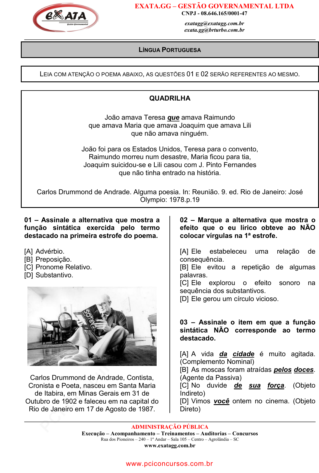pcimarkpci MDAwMDowMDAwOjAwMDA6MDAwMDowMDAwOmZmZmY6OTU0ZTpiOTcw:VGh1LCAxOSBKdW4gMjAyNSAwOToyOTo0NSAtMDMwMA== www.pciconcursos.com.br EXATA.GG – GESTÃO GOVERNAMENTAL LTDA CNPJ - 08.646.165/0001-47 exatagg@exatagg.com.br exata.gg@brturbo.com.br ADMINISTRAÇÃO PÚBLICA Execução – Acompanhamento – Treinamentos – Auditorias – Concursos Rua dos Pioneiros – 240 – 1º Andar – Sala 105 – Centro – Agrolândia – SC www.exatagg.com.br LÍNGUA PORTUGUESA LEIA COM ATENÇÃO O POEMA ABAIXO, AS QUESTÕES 01 E 02 SERÃO REFERENTES AO MESMO. QUADRILHA João amava Teresa que amava Raimundo que amava Maria que amava Joaquim que amava Lili que não amava ninguém. João foi para os Estados Unidos, Teresa para o convento, Raimundo morreu num desastre, Maria ficou para tia, Joaquim suicidou-se e Lili casou com J. Pinto Fernandes que não tinha entrado na história. Carlos Drummond de Andrade. Alguma poesia. In: Reunião. 9. ed. Rio de Janeiro: José Olympio: 1978.p.19 01 – Assinale a alternativa que mostra a função sintática exercida pelo termo destacado na primeira estrofe do poema. [A] Advérbio. [B] Preposição. [C] Pronome Relativo. [D] Substantivo. Carlos Drummond de Andrade, Contista, Cronista e Poeta, nasceu em Santa Maria de Itabira, em Minas Gerais em 31 de Outubro de 1902 e faleceu em na capital do Rio de Janeiro em 17 de Agosto de 1987. 02 – Marque a alternativa que mostra o efeito que o eu lírico obteve ao NÃO colocar vírgulas na 1ª estrofe. [A] Ele estabeleceu uma relação de consequência. [B] Ele evitou a repetição de algumas palavras. [C] Ele explorou o efeito sonoro na sequência dos substantivos. [D] Ele gerou um círculo vicioso. 03 – Assinale o item em que a função sintática NÃO corresponde ao termo destacado. [A] A vida da cidade é muito agitada. (Complemento Nominal) [B] As moscas foram atraídas pelos doces. (Agente da Passiva) [C] No duvide de sua força. (Objeto Indireto) [D] Vimos você ontem no cinema. (Objeto Direto) www.pciconcursos.com.br pcimarkpci MDAwMDowMDAwOjAwMDA6MDAwMDowMDAwOmZmZmY6OTU0ZTpiOTcw:VGh1LCAxOSBKdW4gMjAyNSAwOToyOTo0NSAtMDMwMA== www.pciconcursos.com.br EXATA.GG – GESTÃO GOVERNAMENTAL LTDA CNPJ - 08.646.165/0001-47 exatagg@exatagg.com.br exata.gg@brturbo.com.br ADMINISTRAÇÃO PÚBLICA Execução – Acompanhamento – Treinamentos – Auditorias – Concursos Rua dos Pioneiros – 240 – 1º Andar – Sala 105 – Centro – Agrolândia – SC www.exatagg.com.br 04 – Observe com atenção a propaganda abaixo extraída do folheto publicitário de uma empresa de telefonia. Fale por R$ 0,25 a chamada com seu Infinity Pré. E se o Brasil for campeão, o seu benefício vai até 2014! O objetivo do texto acima é: [A] Esclarecer sobre formas de falar o quanto quiser. [B] Informar sobre possibilidades de economizar no mês. [C] Levar o leitor a aderir o plano. [D] Mostrar modos econômicos de fazer uma ligação. 05 – Em todas as frases, o termo destacado exemplifica corretamente o processo de formação de palavras indicado, EXCETO em: [A] Derivação Imprópria: Os bons têm suas recompensas! [B] Derivação Parassintética: Onde se viu perversidade semelhante? [C] Derivação Prefixal: Não, senhor, não procedi nem percorri. [D] Derivação Regressiva: Preciso falar-lhe amanhã, sem falta. 06 – Assinale a opção em que a mudança na ordem dos termos altera sensivelmente o sentido do enunciado. [A] A leitura no Brasil continua sendo um privilégio de poucas pessoas. No Brasil a leitura continua sendo um privilégio de poucas pessoas. [B] A rede de bibliotecas públicas, por exemplo, é limitadíssima. A rede, por exemplo, de bibliotecas públicas é limitadíssima. [C] O principal obstáculo é sem dúvida a pobreza. Sem dúvida o principal obstáculo é a pobreza. [D] Só nos últimos cinquenta anos se desenvolveu nosso parque manufatureiro. Nos últimos cinquenta anos só se desenvolveu nosso parque manufatureiro. 07 – Assinale a alternativa em que a concordância nominal está INCORRETA. [A] Conseguimos resolver nossos problemas, agora estamos quites. [B] Já era meio-dia e meia quando as crianças voltaram da visita ao museu. [C] Levantaram bastante questões sobre Meio Ambiente no programa de ontem. [D] Seguem anexas as certidões negativas solicitadas. 08 – A frase em que a regência verbal NÃO corresponde à norma padrão é: [A] É necessário obedecer as clausulas do contrato. [B] Não esqueça os regulamentos da empresa. [C] Tais medidas visam combater a inflação. [D] Todos devem assistir à posse do novo diretor. www.pciconcursos.com.br pcimarkpci MDAwMDowMDAwOjAwMDA6MDAwMDowMDAwOmZmZmY6OTU0ZTpiOTcw:VGh1LCAxOSBKdW4gMjAyNSAwOToyOTo0NSAtMDMwMA== www.pciconcursos.com.br EXATA.GG – GESTÃO GOVERNAMENTAL LTDA CNPJ - 08.646.165/0001-47 exatagg@exatagg.com.br exata.gg@brturbo.com.br ADMINISTRAÇÃO PÚBLICA Execução – Acompanhamento – Treinamentos – Auditorias – Concursos Rua dos Pioneiros – 240 – 1º Andar – Sala 105 – Centro – Agrolândia – SC www.exatagg.com.br 09 – Assinale a alternativa em que o acento indicativo da crase foi empregado CORRETAMENTE. [A] Aquele duque pertencia à casa de Orleans. [B] Escreveu uma carta à lápis. [C] Não esforce a vista, compre óculos à prazo. [D] Venho à mando do professor. 10 – Assinale a opção em que o valor do sufixo NÃO está corretamente indicado entre parênteses: [A] (Ato ou efeito de) = Escolarização. [B] (Coleção de) = Analfabetismo. [C] (Qualidade de) = Responsabilidade. [D] (Relativo à) = Funcional. MATEMÁTICA 11 – Um conjunto tem 64 subconjuntos. Ao retirarmos 2 (dois) dos seus elementos, quantos subconjuntos ele terá? [A] 4. [B] 8. [C] 16. [D] 32. � ESPAÇO PARA RASCUNHO � 12 – Se em um determinado ano o Natal fosse comemorado num sábado, em qual dia da semana o Natal seria festejado 4 (quatro) anos depois? [A] Quarta-Feira. [B] Quinta-Feira. [C] Sexta-Feira. [D] Terça-Feira. � ESPAÇO PARA RASC