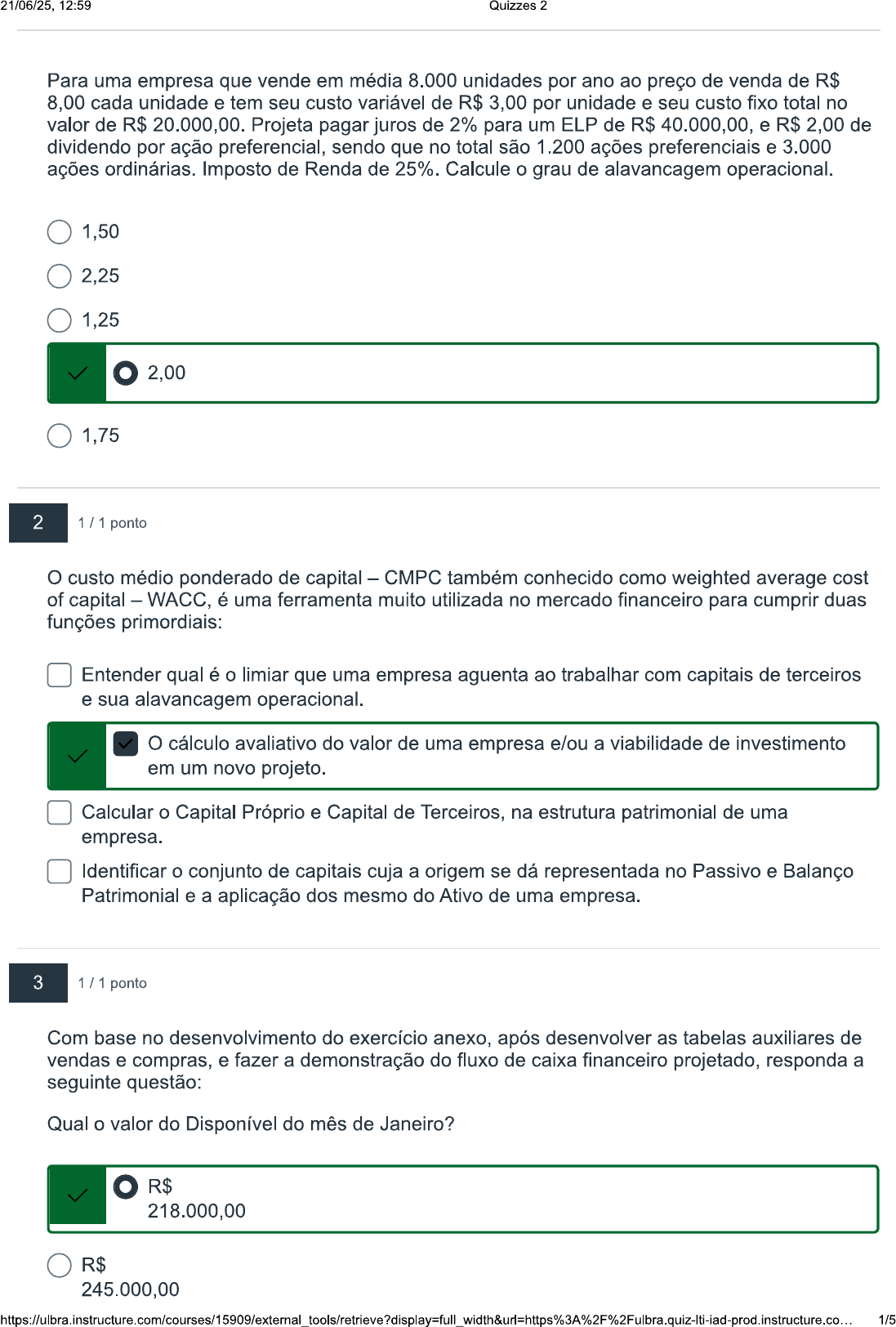21/06/25, 12:59 Quizzes 2 Para uma empresa que vende em média 8.000 unidades por ano ao preço de venda de R$ 8,00 cada unidade e tem seu custo variável de R$ 3,00 por unidade e seu custo fixo total no valor de R$ 20.000,00. Projeta pagar juros de 2% para um ELP de R$ 40.000,00, e R$ 2,00 de dividendo por ação preferencial, sendo que no total são 1.200 ações preferenciais e 3.000 ações ordinárias. Imposto de Renda de 25%. Calcule grau de alavancagem operacional. 1,50 2,25 1,25 2,00 1,75 2 custo médio ponderado de capital CMPC também conhecido como weighted average cost of capital WACC, é uma ferramenta muito utilizada no mercado financeiro para cumprir duas funções primordiais: Entender qual é limiar que uma empresa aguenta ao trabalhar com capitais de terceiros e sua alavancagem operacional. cálculo avaliativo do valor de uma empresa e/ou a viabilidade de investimento em um novo projeto. Calcular Capital Próprio e Capital de Terceiros, na estrutura patrimonial de uma empresa. Identificar conjunto de capitais cuja a origem se dá representada no Passivo e Balanço Patrimonial e a aplicação dos mesmo do Ativo de uma empresa. 3 1/1 ponto Com base no desenvolvimento do exercício anexo, após desenvolver as tabelas auxiliares de vendas e compras, e fazer a demonstração do fluxo de caixa financeiro projetado, responda a seguinte questão: Qual valor do Disponível do mês de Janeiro? R$ 218.000,00 R$ 245.000,00 1/521/06/25, 12:59 Quizzes 2 R$ 208.000,00 R$ 253.000,00 R$ 227.215,00 4 1/1 ponto Com base no desenvolvimento do exercício anexo, após desenvolver as tabelas auxiliares de vendas e compras, responda a seguinte questão: Qual valor das Compras do mês de Fevereiro? R$ 158.900,00 R$ 121.200,00 R$ 88.750,00 R$ 56.000,00 R$ 141.600,00 5 1/1 ponto Com base no desenvolvimento do exercício anexo, após desenvolver as tabelas auxiliares de vendas e compras, responda a seguinte questão: Qual valor do Estoque Final de Março? R$ 96.000,00 R$ 105.600,00 R$ 107.300,00 R$ 100.800,00 2/521/06/25, 12:59 Quizzes 2 R$ 115.000,00 6 1/1 ponto Assinale a alternativa que NÃO corresponde às peculiaridades dos métodos de avaliação de investimento de um projeto. A comparação entre as alternativas de investimento pelo método do custo anual é feita reduzindo-se fluxo de caixa de cada proposta a uma série uniforme equivalente, com uso da taxa mínima de atratividade. A taxa interna de retorno é a taxa que iguala os fluxos anualizados de benefícios aos fluxos igualmente anualizados de custos. No que se refere ao método de valor atual, no caso de se considerar alternativas de investimento com duração idênticas, escolhe-se a de maior valor atual. A análise a respeito da taxa interna de retorno se traduz com a análise do custo marginal do investimento, caso se deseje obter maior lucro possível. No método de valor atual, calcula-se o valor atual do fluxo de caixa com uso da taxa mínima de atratividade; se esse valor for positivo, a proposta de investimento é atrativa. 7 1/1 ponto Com base no desenvolvimento do exercício anexo, após desenvolver as tabelas auxiliares de vendas e compras, e fazer a demonstração do fluxo de caixa financeiro projetado, responda a seguinte questão: Qual valor do Saldo Final de Caixa do mês de Março? R$ 85,00 (R$ 85,00) R$ 8.000,00 R$ 11.215,00 3/521/06/25, 12:59 Quizzes 2 zero 8 1/1 ponto Suponha um projeto cujo investimento inicial seja igual a R$ 200 mil, com prazo de 3 anos. Assuma que os fluxos de receita gerados ao final do primeiro, segundo e terceiro anos, descontados a valor presente à taxa mínima de atratividade de 5%, sejam iguais a R$ 120 mil, R$ 80 mil e R$ 40 mil, respectivamente. Logo, payback descontado é de: 3 anos 1 ano 2,5 anos 2 anos 1,5 anos 9 1/1 ponto Com base no desenvolvimento do exercício anexo, após desenvolver as tabelas auxiliares de vendas e compras, e fazer a demonstração do fluxo de caixa financeiro projetado, responda a seguinte questão: Qual valor dos Desembolsos do mês de Fevereiro? R$ 227.300,00 R$ 30.500,00 R$ 177.500,00 R$ 260.800,00 R$ 237.000,00 4/521/06/25, 12:59 Quizzes 2 10 ponto Com base no desenvolvimento do exercício anexo, após desenvolver as tabelas auxiliares de vendas e compras, e fazer a demonstração do fluxo de caixa financeiro projetado, responda a seguinte questão: Qual valor da Posição de Caixa do mês de Março? R$ X 85,00 Resposta (R$ 85,00) correta: (R$ 19.000,00) (R$ 85,00) (R$ 30.500,00) R$ 30.500,00 5/5