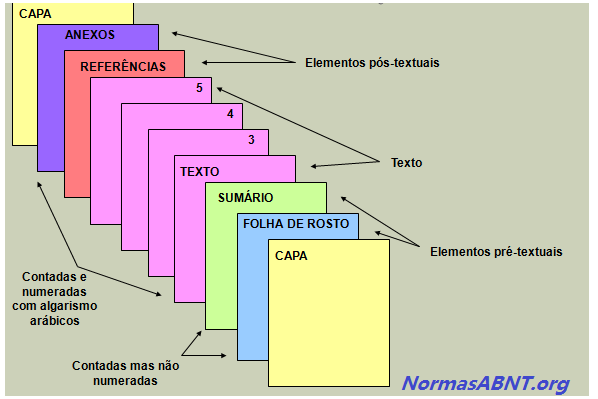 CAPA ANEXOS REFERÊNCIAS Elementos pós-textuais 5 4 3 Texto TEXTO SUMÁRIO FOLHA DE ROSTO CAPA Elementos pré-textuais Contadas e numeradas com algarismo Contadas mas não numeradas NormasABNT.org