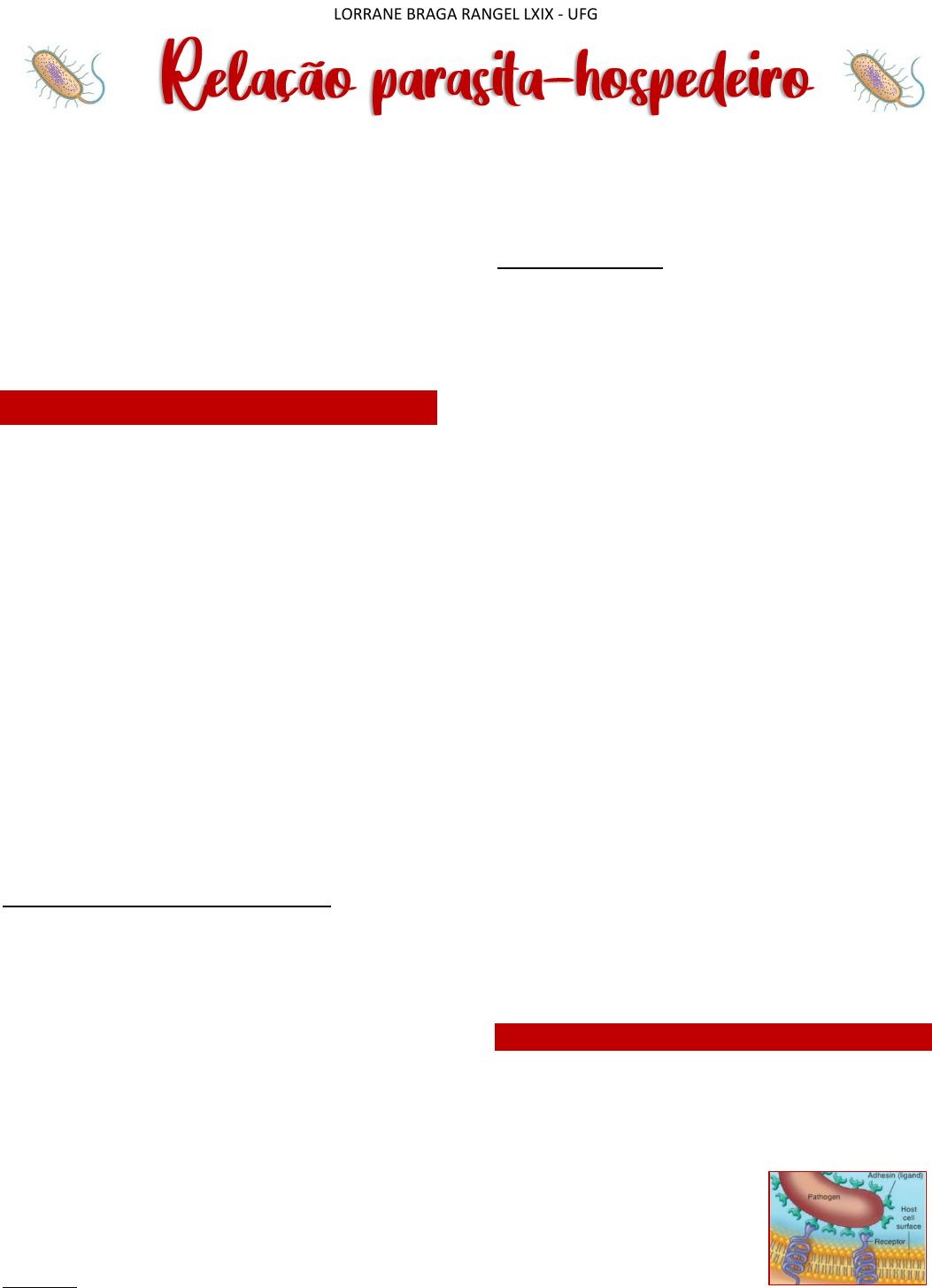 LORRANE BRAGA RANGEL LXIX - UFG Mecanismos de patogenicidade microbiana Patogenicidade – capacidade de causar doença • Equilíbrio entre o hospedeiro e o patógeno • Quando o equilíbrio é favorável para a bactéria, ela consegue se modificar a causar dados • O hospedeiro pode não estar preparado → nascimento, envelhecimento, tratamento de doenças com imunossupressão Virulência: grau de patogenicidade Porta de entrada É o mecanismo pelo qual a bactéria entra no organismo, que pode ser de 3 formas: 1- Membranas mucosas 2- Pele 3- Via parenteral: quando ocorre um rompimento das barreiras íntegras e a bactéria consegue penetrar no organismo através dessas lesões em pele ou mucosas. Membranas mucosas Trato respiratório • Os microrganismos podem ser inalados pela boca ou nariz na forma de partículas de poeira ou gotículas • É a porta de entrada mais comum • Barreiras físicas e celulares tendem a conter a entrada dessas partículas: vibrissas, muco, tosse Doenças adquiridas pelo trato respiratório ✓ Gripe ✓ Resfriado ✓ Tuberculose ✓ Coqueluche ✓ Pneumonia ✓ Infecção de garganta - Strep ✓ Difteria Trato gastrointestinal É muito hostil e consegue matar muitas bactérias → PH ácido do estômago, enzimas, bile • Diarreia → principal sintomatologia • Microrganismos entram por via de alimentos ou água contaminados ou por mãos sujas Doenças: ✓ Salmonelose – Salmonella sp. ✓ Shigelose – Shigella sp. ✓ Cólera – Vibrio cholorea ✓ Úlceras – helicobacter pylori ✓ Botulismo – clostridium Doenças fecais-orais • Entrada dos patógenos via trato GI • Mãos e dedos contaminados ou através de água e alimentos • Higiene pessoal ruim Trato geniturinário • Infecções sexualmente transmissíveis • Gonorreia – Neisseria • Sífilis – Treponema pallidum • Clamídia Pele intacta • Menos frequente quando intacta • Alguns microrganismos conseguem entrar através de pequenos espaços como folículos pilosos e glândulas sudoríparas • Ex: Lectospirose – espiroquetas fininhas Parenteral • Muito frequente • Entram através de cortes, injeções, mordidas, arranhões, cirurgias, rachaduras Portas de entradas preferenciais: • Somente a entrada do microrganismo não resulta em causa de doença • Streptococcus – se inalado causa pneumonia, mas se entrar pelo TGI não sobreviveria • Salmonela – se entra pelo TGI causa febre, mas se entrar em contato com a pele não causa danos Como as bactérias passam pelas defesas do hospedeiro? Aderência: as fímbrias são as principais moléculas que são capazes por promover uma ligação específica → elas possuem adesinas que interagem com receptores específicos nas células hospedeiras • Neisseira Gorrhoeae (TGU) • ETEC (TGI) • Bordetella pertussis (TR) Cápsula: promove uma aderência inespecífica (melhora a chance de multiplicação), além de atuar prevenindo a fagocitose LORRANE BRAGA RANGEL LXIX - UFG • Streptococcus pneumoniae • Mecanismo de evasão do sistema imune Enzimas: existem muitas enzimas que as bactérias produzem para adquirir seus nutrientes → precisa degradar tecidos e células • Enzimas que degradam células e tecidos conjuntivos • Lecocidinas o Matam os glóbulos brancos o Liberam e rompem os lisossomos (fagolisossomos) → liberação da bactéria o Mecanismo de evasão do sistema imune • Hemolisinas o Degradam hemácias o Ferro → nutriente importante para várias funções celulares o Ex: Estreptococos o Hemólise total ou parcial o Não é um mecanismo de evasão do sistema imune • Coagulase o Causam a coagulação do sangue o O coágulo protege as bactérias da fagocitose pelos glóbulos brancos – promove uma proteção física ao redor das bactérias o Mais produzida no início da infecção o Estafilococos – são coagulases positivos • Quinases o Enzimas que dissolvem coágulos para que elas possam ser liberadas e adquirir nutrientes o Ajudam na disseminação bacteriana – bacteremia o Ex: Estreptoquinase; Estafiloquinase o Estreptoquinase → usada para dissolver coágulos • Hialuronidase o Degradam o ácido hialurônico (tecido conjuntivo) o Contribui para a disseminação o Em combinação com uma droga pode ajudar a disseminação dela pelo corpo • Colagenase o Degrada colágeno o Liberação de gases que pode causar gangrena gasosa (Clostridium perfringens) • Fator necrosante: indução de morte celular por necrose o Fasciite necrotizante → bactérias carnívoras o Streptococcus pyogenes, Bacterioides fragilis, clostridium Toxinas: • São dois tipos – endotoxinas e exotoxinas • São substâncias tóxicas produzidas pelos microrganismos • São fatores primários de patogenicidade • Toxemia: toxinas na corrente sanguínea Endotoxinas • Faz parte da composição bacteriana • LPS das gram-negativas Exotoxinas • Existem muitas – 220 • Geralmente são proteínas secretas para fora da célula • Atingem a circulação e tecidos distantes • Fator principal de patogenicidade pra muitos microrganismos • A maioria causa danos nas membranas das células eucarióticas. Ex: neurônios, enterócitos • Toxemia = presença da toxina sistematicamente na corrente sanguínea Citotoxinas = mata células Neurotoxinas = interfere nos impulsos nervosos Enterotoxinas = afetam as células do epitélio do trato GI As toxinas são moléculas que induzem respostas imunes → principal mecanismo de virulência • Altamente imunogênica → levam à produção de anticorpos → neutralização das toxinas • Exotoxinas inativadas não causam doenças, mas estimula a produção de anti-toxinas → calor, formalina ou fenol • Toxoide – exotoxinas alteradas – são injetadas para estimularem o sistema imune a produzir anti-toxinas e ter imunidade • Ex: vacina tríplice DPT (Difteria, Pertussis – não age neutralizando a toxina, Tétano) o Toxoide diftérico e tetânico e antígeno