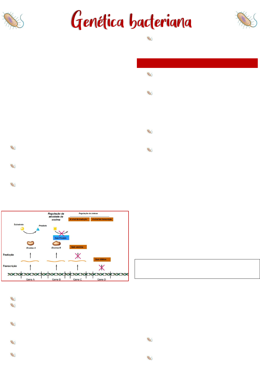 LORRANE BRAGA RANGEL LXIX - UFG Importância do conhecimento dos mecanismos envolvidos em genética bacteriana: 1. Função dos genes = função celular 2. Sistema simples – interferências para outros organismos 3. Isolamento e duplicação de genes de outros organismos 4. Produtores de antibióticos, fermentações, plásticos, anti-tumorais e outros agentes de interesse industrial → a principal fonte de novas drogas antimicrobianas são as próprias bactérias 5. Causadores de doenças 6. Combater a resistência adquirida aos antibióticos Alterações fenotípicas x genotípicas Fenotípicas por regulação da expressão gênica → produção de proteínas que a bactéria já era capaz de produzir com o seu material genética Genotípicas por mutação ou recombinação → produção de proteínas distintas das que já eram produzidas Variabilidade fenotípica – todas as células possuem um potencial de genes, mas nem todos estão sendo expressos, fator esse que podem ser alterados pelo meio ambiente Estruturas das proteínas Estrutura primária – sequência de aminoácidos Estruturas secundárias – dobras feitas pelas proteínas (beta e alfa hélices) → é determinado pela sequência dos aminoácidos Estruturas terciarias → dobramentos maiores e interações entre as estruturas secundárias diversas Toda a informação de como uma proteína vai se dobrar está contida no DNA Pontes di-sulfeto entre dois aminoácidos cisteínas Algumas mutações nas proteínas podem trazer graves alterações nas células → pode matar as bactérias Mutantes bacterianos Mutação = alteração na sequência de bases de um gene, sem adicionar novas informações no gene Pode ser selecionáveis (resistência à droga) ou não o Se a bactéria torna-se resistente a uma droga é vantajoso Mutantes bioquímicos: A maioria das bactérias mutantes possuem natureza bioquímica → são mutações que causam mudanças na natureza bioquímica Os mutantes mais importantes são auxotróficos o Um organismo auxotrófico precisa de alguns nutrientes que a cepa selvagem (prototróficos) pode sintetizar para ela própria o Eles não crescem em meio mínimo, em oposição à linhagem original o Pototróficas → conseguem sintetizar o seu próprio aminoácidos, por exemplo o Assim, as mutações bioquímicas causam a deficiência ou inativação da capacidade da bactéria de sintetizar certas moléculas Mutantes de resistência: drogas, metais pesados, bacteriófagos → esses microrganismos adquirem resistências a agentes microbianos Processos de mutação bacteriana são raros, mas se acumulam ao longo dos processos de multiplicação populacional e portanto podem ser significativos Processos de mutação bacteriana dificilmente criam um gene novo com propriedade novas, apenas alteram as propriedades do produto de genes já existentes As mutações alteram genes que JÁ EXISTEM nas bactérias → pouca variabilidade A mutação deletéria resulta em morte da célula bacteriana: consequência? A célula morre e não gera descendentes, mas se morre poucas células, não se tem tantas consequências Ex: uma mutação em um códon que resulta em substituição de um aminoácido pode resultar LORRANE BRAGA RANGEL LXIX - UFG em alteração de forma da proteína ou até parada de tradução abrupta Mutações que não interfere no fitnes e na sobrevivência das bactérias podem continuar sendo transferidas para as descendentes daquela célula. Vai ser útil para célula? As células vão se multiplicando defeituosas Pode gerar populações de resistência As mutações que possam trazer vantagens para uma bactéria seriam aquelas que alteram uma determinada proteína sem que ela comprometa demais a função da célula, mas ao mesmo tempo traga uma vantagem para ela Ex: Resistência a droga por impermeabilidade ou alteração de alvo da droga Ex: a tetraciclina age na proteína ribossomal → se ocorre uma mutação que altera a forma do ribossomo, mas sem causar a sua perda, ocorre a perda da função desse ribossomo Bactérias mutantes ao sofrerem uma pressão severa como um antimicrobiano, só irão sobreviver se houver uma base genética de resistência para aquela droga Recombinação Recombinação genética refere-se a troca de genes entre duas moléculas de DNA, para formar novas combinações de genes em um cromossomo Processos de transferência de material genético bacteriano seguido de recombinação Os eucariotos possuem processo de meiose para reduzir os diplóides para haplóides e a fertilização para retornar ao estado diplóide Os processos sexuais bacterianos não ocorrem como nos eucariotos, porém eles servem para o mesmo objetivo → misturar os genes de dois organismos diferentes juntos Obs: Todo processo de recombinação bacteriana ocorre somente depois de acontecer um processo de transferência de material genético. Nem todo processo de transferência resulta em uma recombinação. Processos de transferência de material genético: 1- Transformação: DNA livre é internalizado pela célula bacteriana do ambiente 2- Conjugação: transferência direta do DNA de uma célula para outra 3- Transdução: utilização de um bacteriófago para transferir DNA entre as células Transferência gênica vertical: ocorre quando os genes são passados de um organismo para os seus descendentes Transferência genética horizontal: ocorre quando a bactéria troca genes com outros micróbios da mesma geração Recombinação homóloga em bactéria Necessidade de pareamento de nucleotídeos (pelo menos 30) por homologia em duas regiões do fragmento de DNA e do cromossomo bacteriano Por algum motivo um DNA entrou na célula → qual o seu destino após entrar na bactéria? A bactéria não consegue diferenciar a origem do DNA em termo de constituição (bases nitrogenadas, ligações) Quem determinada a proximidade do DNA para o da bactéria é a sequência dos nucleotídeos ➔ essa sequência