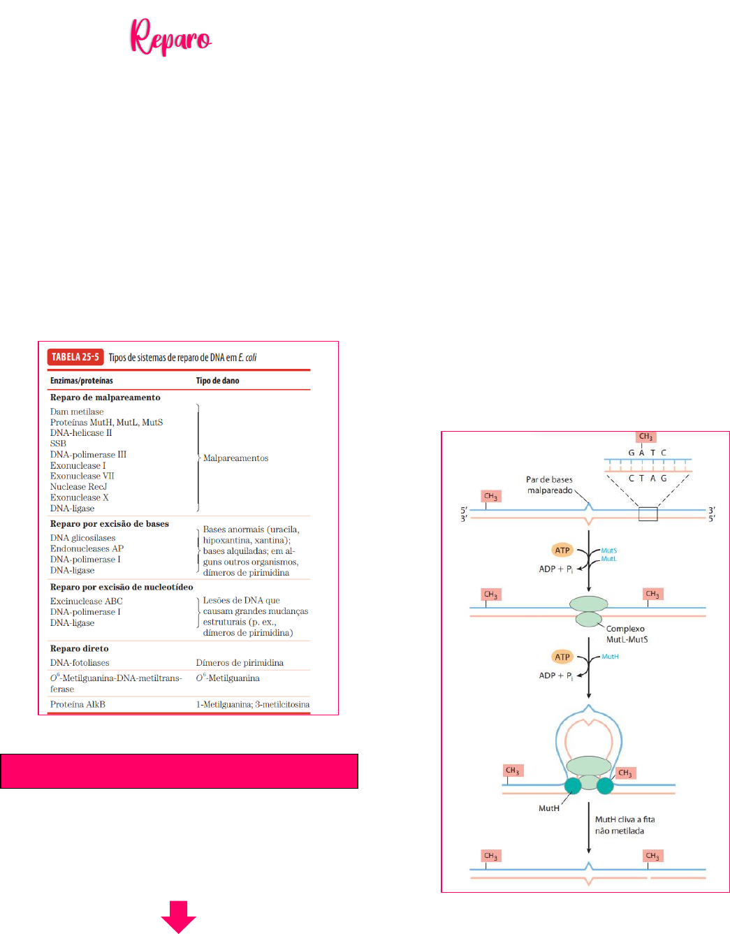 LORRANE BRAGA RANGEL LXIX - UFG • Anda junto com a replicação • Em humanos existem mais de 130 genes que codificam proteínas envolvidas no reparo de DNA • O reparo é possível, em grande parte, porque a molécula do DNA consiste em duas fitas complementares. • Reparo de bases pareadas incorretamente (mismatch repair/correção de erro) • Reparo por excisão de bases ou de nucleotídeos • Reparo direto (ex: fotorreativação de dímeros de pirimidinas pela fotoliase, enzima ativada por luz visível) → exclusivo de bactérias • Os malpareamentos são quase sempre corrigidos para refletir a informação da fita molde, de modo que o sistema de reparo deve conseguir diferenciar a fita molde da recém sintetizada → marcação do DNA molde com grupos metil Dam metilase: reconhece sequências GATC e metila a fita nova recém sintetizada nessas posições → assim não é mais possível diferenciar qual foi a fita molde • Durante um pequeno momento após a passagem da forquilha de replicação, há um curto período durante o qual a fita recém sintetizada não está metilada → permite a diferenciação Como esse processo é dirigido? 1- Erro no pareamento 2- Proteínas MutS e MutL → formam um complexo que reconhece e se liga a todos os pares de bases mal pareados 3- Recrutamento de proteínas MutH → ela se liga às sequências GATC hemimetilada e ao complexo A mutH tem atividade endonuclease específica que é inativa até que o complexo encontre uma sequência GATC hemimetilada 4- o DNA de ambos os lados do mal pareamento é enroscado no complexo → cria uma volta de DNA até chegar em um ponto que a MutH encontra uma sequência GATC 5- A mutH catalisa a clivagem da fita não metilada no lado 5’ no GATC, o que marca a fita para reparo Pode ser reconhecido antes ou depois do local com erro Mal pareamento do lado 5’ do sítio de clivagem • A fita é desenrolada e degradada no sentido 3’ → 5’ • DNA-helicase, SSB, exonuclease I ou X (3’→5’) Reparo de mal pareamento LORRANE BRAGA RANGEL LXIX - UFG Mal pareamento do lado 3’ • Muda a exonuclease que é usada, pois precisa de uma que degrade a fita no sentido 5’→3’ 1- A ação combinada da DNA – helicase II, SSB e de diferentes exonucleases remove o segmento da nova fita entre o sítio de clivagem multH e um ponto logo adiante do mal pareamento 2- A exonuclease usada depende da localização do sítio de clivagem 3- O intervalo resultante é preenchido pela DNA polimerase III 4- A DNA-ligase sela o corte • DNA-glicosilases: reconhecem lesões particularmente comuns no DNA e removem a base afetada por meio da clivagem da ligação N-glicosil → cria um sítio apurínico (AP) • Primeiro é removido a base e depois que remove o que resta do nucleotídeo Uracila e bases alquiladas são reconhecidas pelas glicosilases e removidas diretamente do DNA → sítio apurínico A capacidade para distinguir a timina da uracila (produto da desaminação da citosina) pode ser a razão pelo qual o DNA evoluiu para conter só timina, ao invés da uracila • Células mutantes sem essa enzima apresentam uma taxa elevada de G=C para mutações A-T Como ocorre? 1- Base danificada 2- Quebra da ligação glicosídica por uma DNA- glicosilase→ sítio apurínico O reparo não é realizado pela simples inserção de uma nova base e reformação da ligação N-glicosil 3- Ação de uma AP nuclease que quebra a ligação fosfodiéster que o ex nucleotídeo fazia removendo-o 4- A dna polimerase I inicia a síntese de reparo a partir da hidroxila 3’ no corte, removendo (com sua atividade exonuclease 5’→3’) e substituindo a porção danificada 5- Dna ligase sela o corte remanescente Reparo de excisão de base LORRANE BRAGA RANGEL LXIX - UFG • Clivagem da ligação fosfodiéster e remoção de nucleotídeos em conjunto. Em quais casos? • Lesões no DNA que provocam grandes distorções na estrutura helicoidal do DNA • Dímeros de pirimidinas Como ocorre? 1- Uma enzima multisubunidades (excinuclease) hidrolisa duas ligações fosfodiésteres, uma de cada lado da distorção provocada pela lesão. 2- Os oligonucleotídios retirados são liberados do duplex quando a helicase rompe as ligações de hidrogênio 3- O espaço é preenchido por uma DNA- polimerase 4- A DNA-ligase fecha o corte Mutações em genes que estão envolvidos no reparo por excisão de nucleotídeos → Xeroderma pigmentosum • Alta susceptibilidade ao câncer de pele e extrema sensibilidade à luz solar • Gene POLH • Danos que são reparados sem a remoção de uma base ou nucleotídeo Ex: fotorreativação direta de dímeros de pirimidina → DNA-fotoliases • A fotoliase usa a energia proveniente da luz visível para reverter a lesão (dímeros de pirimidinas) • Não existe em humanos Reparo direto de bases alquiladas • Através de uma metil-transferase que transfere o metil da O6-metilguanina para um resíduo de cisteína da proteína Existem alquilações que não podem ser corrigidos pela metil-transferase • 1-metiladenina e 3-metilcitosina • Usa a AlkB Efeito de lesões sobre a replicação do DNA ✓ Quebras na fita dupla ✓ Ligações cruzadas na fita dupla ✓ Lesões em um DNA de fita simples ✓ Fita complementar é, ela mesma, danificada ou está ausente Surgem mais frequentemente quando a forquilha encontra lesões não reparadas no DNA • Lesões não reparadas → quando a maquinaria de síntese chega a esse ponto e não consegue prosseguir com a síntese → mecanismo diferente de reparo (não tem uma fita molde, pois a forquilha tá aberta) Na ausência de uma segunda fita, a informação necessária para um reparo preciso deve vir de um cromossomo separado e homólogo → recombinação genética de homólogos Reparo de excisão de nucleotídeo Reparo direto Lesões não reparadas LORRANE BRAGA RANGEL LXIX - UFG • Em algumas condições uma segunda via de reparo, a síntese de DNA translesão prope