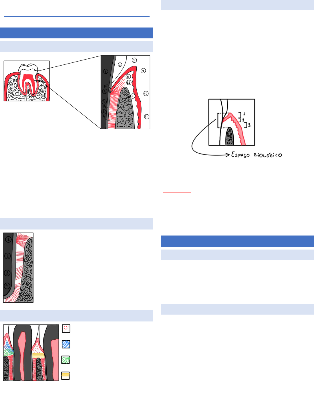 PERIODONTIA RESUMO De: João Gabriel de Sena Gomes ANATOMIA DO PERIODONTO PERIODONTO: 1. Esmalte 2. Dentina 3. Epitélio Juncional 4. Cemento 5. Ligamento Periodontal 6. Osso Alveolar 7. Sulco Gengival/Periodontal 8. Epitélio Sulcular 9. Gengiva Livre 10. Gengiva Inserida 11. Tecido Conjuntivo Adjacente FIBRAS DO LIGAMENTO PERIODONTAL: 1. Fibras da Crista Alveolar 2. Fibras Horizontais 3. Fibras Oblíquas 4. Fibras Apicais FIBRAS GENGIVAIS: 1. Fibras Circulares 2. Fibras Dentogengivais 3. Fibras Dentoperiosteais 4. Fibras Transeptais ESPAÇO BIOLÓGICO: → Corresponde à área de união entre a gengiva e a superfície dental; → Determina a aderência do tecido gengival ao redor do elemento dental; → É determinada pela distância da crista óssea a base do sulco gengival (fim da crista óssea alveolar a porção mais coronal do epitélio juncional); → Formado por: › Epitélio juncional; › Inserção conjuntiva; › Sulco gengival. 1. Sulco Periodontal ou Gengival 2. Epitélio Juncional 3. Iserção do Tecido Conjuntivo Importante: → O epitélio juncional pode ser uma área de risco para a doença periodontal, devido a frágil união com a superfície dentária por apresentar um menor número de queratinócitos e mais espaçados além de não ser queratinizado. HISTOLOGIA DO PERIODONTO LIGAMENTO PERIODONTAL: → É ligado no cemento radicular até o osso alveolar; → Composição: › Fibras oxitalânicas; › 90% são fibras de Colágeno tipo 1; › 10% são fibras de colágeno tipo 3. CEMENTO: → Todo mesênquima que forma o revestimento externo da raiz; → Tecido mineralizado especial sem inervação; → Ancora as fibras do ligamento periodontal ao osso alveolar; → Possui dois tipos: › Acelular: encontrado no terço cervical; › Celular: encontrado em ápice radicular e região de furca. É menos calcificado e aumenta com a idade. → Da junção cemento-esmalte, possui 3 tipos: › 60% a 65% o cimento recobre o esmalt; › 30% nenhum recobre o outro; › 5% a 10% o cemento não encontra o esmalte (exposição de dentina). Anormalidades cementarias: → Anquilose: › Fusão do cemento radicular ao osso alveolar com obliteração do ligamento periodontal. OSSO ALVEOLAR: → Osso que reveste o alvéolo e estende-se acima da crista óssea alveolar; → Aparece frequentemente como uma linha radiopaca nas imagens radiográficas (lâmina dura) Anormalidades do Osso Alveolar: → Fenestração: › Área da raiz que fica descoberta pelo osso ficando recoberta apenas pelo periósteo e pela gengiva; → Deiscência: › Áreas radiculares descobertas devido à ausência de osso marginal. MUCOSA: → Mastigatória: › Gengiva e palato duro → De revestimento: › Responsável por revestir a cavidade oral → Especializada: › Dorso da língua REVISÃO DA DIVISÃO DOS TECIDOS EPITELIAIS: 1. Camada Córnea: a. Ausência ou resquícios do núcleo. 2. Camada Granulosa: a. Produção de queratinócitos. 3. Camada Espinhosa: a. Possui prolongamentos citoplasmáticos dando aspecto de espinhoso. 4. Camada Basal: a. Células cilíndricas ou cúbicas em contato com a membrana basal com adesão via hemidesmossomos. MICROBIOLOGIA PERIODONTAL: → A microbiota (tanto bucal quanto fecal) começa a ser formado a partir de dois anos. Toda microbiota é formada por uma complexa coleção de diferentes tipos de bactérias; › A partir desse momento, o corpo humano contém 10 vezes mais bactérias que células humanas; → Algumas horas após o nascimento, a cavidade oral passa de ser estéril e passa a ser colonizada por bactérias tanto aeróbicas quanto facultativas; › Aeróbicas: necessita de oxigênio para viver; › Anaeróbicas: não vive em local com oxigênio; › Facultativa: vive em ambos os locais; → Com exceção dos micro-organismos presentes na face e em fluidos secretores, TODAS as bactérias se mantêm aderidas em uma superfície; → Os micro-organismos que se comunicam com a cavidade oral e faringe possuem um “sistema de crescimento aberto”, com ingestão contínua de micro- organismos e de seus nutrientes; EQUILÍBRIO DINÂMICO: Força de adesão e remoção: 1. Deglutição, mastigação e o ato de assoar o nariz; 2. Implementos de higiene oral e de língua; 3. O efeito de limpeza da saliva, nasal e fluido gengival; 4. Movimentação ativa dos cílios (paredes nasal e sinusal). → A habilidade de adesão das bactérias ao hospedeiro é crucial para as doenças: › Gengivite; › Periodontite. PRINCIPAIS BACTÉRIAS PATOGÊNICAS RELACIONADAS À ADESÕES: → Porphyromonas gingivalis; → Aggregatibacter actinomycetemcomitans. ECOSSISTEMAS OU NICHOS DA CAVIDADE ORAL: 1. Intra-oral, supra gengival, superfícies duras; 2. Bolsa periodontal/peri-implantar; 3. Epitélio bucal, palatino e do assoalho bucal; 4. Dorso da língua; 5. Amígdalas; 6. Saliva. → Muitas bactérias (com exceção das espiroquetas) são capazes de colonizar todos os nichos: › Amigdalite; › Muitos são capazes de colonizar o seio maxilar. → As superfícies dos tecidos moles não são estruturas passivas no processo de adesão e colonização! → As bactérias podem se aderir às células do hospedeiro e formar uma relação comensal, benéfica para ambas as partes; → Vários estudos mostram que existem elevados números de bactérias inseridas em células epiteliais das bolsas periodontais in vivo; → Em áreas de inflamação gengival, há um número aumentado de bactérias; › Essas áreas aderidas também podem se infiltrar na parede da bolsa, em larga escala, e atingir o estroma (tecido nutritivo) subjacente. Em geral, existe uma correlação positiva entre a taxa de adesão de bactérias patogênicas em diferentes epitélio e a susceptibilidade do paciente a determinadas infecções. → Do ponto de vista microbiológico, dentes e implantes são únicos por duas razões: › Fornecem uma superfícies não desça ática dura, que permite o desenvolvimento de depósitos bacte