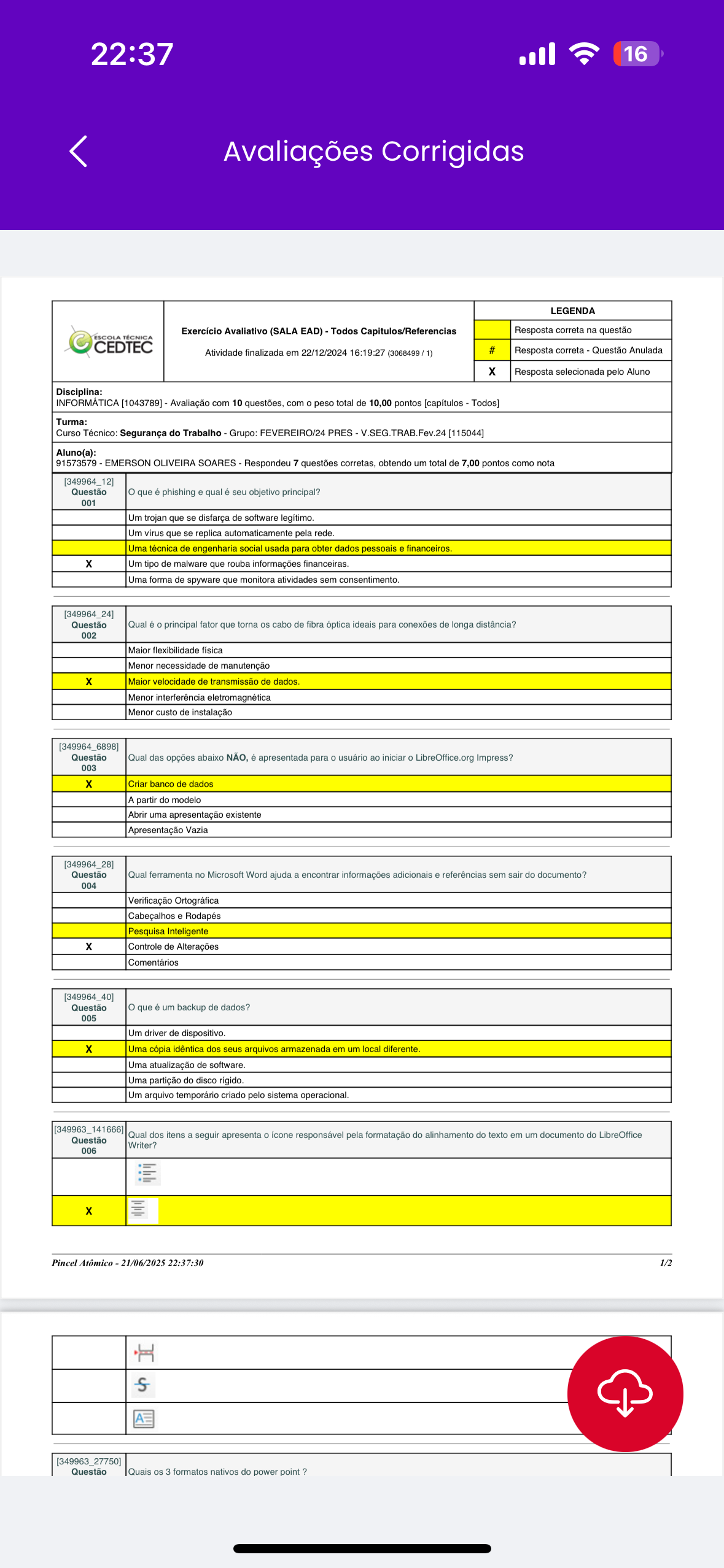 22:37 16 Avaliações Corrigidas LEGENDA Exercício Avaliativo (SALA EAD) Todos Capitulos/Referencias Resposta correta na questão ESCOLA TÉCNICA CEDTEC Atividade finalizada em 22/12/2024 16:19:27 (3068499 1) # Resposta correta Questão Anulada X Resposta selecionada pelo Aluno Disciplina: [1043789] Avaliação com 10 questões, com O peso total de 10,00 pontos [capítulos Todos] Turma: Curso Técnico: Segurança do Trabalho Grupo: FEVEREIRO/24 PRES [115044] Aluno(a): 91573579 EMERSON OLIVEIRA SOARES Respondeu 7 questões corretas, obtendo um total de 7,00 pontos como nota 12] Questão que é phishing e qual é seu objetivo principal? 001 Um trojan que se disfarça de software Um que se replica automaticamente pela rede. Uma técnica de engenharia social usada para obter dados pessoais e financeiros X Um tipo de malware que rouba informações financeiras. Uma forma de spyware que monitora atividades sem consentimento. [349964_24] Questão Qual é principal fator que torna cabo de fibra óptica ideais para conexões de longa distância? 002 Maior flexibilidade física Menor necessidade de manutenção X Maior velocidade de transmissão de dados Menor interferência eletromagnética Menor custo de instalação [349964_6898] Questão Qual das opções abaixo NÃO, é apresentada para usuário ao iniciar 0 LibreOffice.org Impress? 003 Criar banco de dados A partir do modelo Abrir uma apresentação existente Apresentação Vazia [349964_28] Questão Qual ferramenta no Microsoft Word ajuda a encontrar informações adicionais e referências sem sair do documento? 004 Verificação Ortográfica Cabeçalhos Rodapés Pesquisa Inteligente X Controle de Alterações Comentários [349964_40] Questão que é um backup de dados? 005 Um driver de dispositivo. X Uma cópia idêntica dos seus arquivos armazenada em um local diferente Uma atualização de software. Uma partição do disco rígido. Um arquivo temporário criado pelo sistema operacional. [349963_141666] Questão Qual dos itens a seguir apresenta icone responsável pela formatação do alinhamento do texto em um documento do LibreOffice Writer? 006 X Pincel Atômico 21/06/2025 22:37:30 1/2 S [349963_27750] Questão Quais os 3 formatos nativos do power point ?