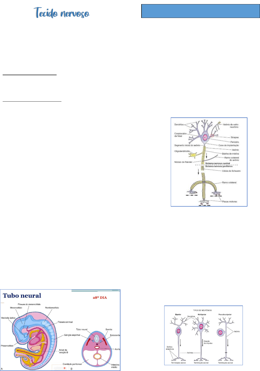 LORRANE BRAGA RANGEL LXIX - UFG Componentes principais ✓ Neurônios: recepção, transmissão e processamento de estímulos ✓ Células da glia (neuroglia): sustentação ✓ Meninges: membranas conjuntivas que promove suprimento sanguíneo Sistema Nervoso Central • Encéfalo • Medula espinal Sistema Nervoso Periférico • Nervos: prolongamentos de neurônios, cujos corpos se situam no SNC ou nos gânglios nervosos. • Gânglios nervosos: pequenos agregados de células nervosas Impulso nervoso: propagação de estímulos ao longo da membrana dos neurônios, cuja função é transmitir sinalizações a outros neurônios, células musculares ou glandulares Funções: • Receber e transmitir informações oriundas de outros neurônios e de estímulos sensoriais • Analisar, organizar e coordenar o funcionamento de quase todas as funções do organismo • Estabiliza as condições intrínsecas do organismo Desenvolvimento • Inicia-se na 3° semana: neurulação (ectoderma) • 4° - formação do tubo neural • 3 meses: já tem a região encefálica muito bem desenvolvido • 6 meses: giros primários • 9 meses: os giros secundários e tem 25% do tamanho do cérebro de um adulto • Responsáveis pela recepção e pelo processamento de informações • Corpo celular (pericário ou soma) → núcleo e citoplasma Componentes: • Dendritos: são prolongamentos ramificados e numerosos que constituem o principal local para receber os estímulos • Corpo celular: concentra as organelas e que é capaz de receber estímulos • Axônio: prolongamento único ramificado em sua terminação. Ele conduz impulsos que transmitem informações do neurônio para outras células Classificação morfológica dos neurônios • Bipolares: um dendrito e um axônio o Gânglios coclear e vestibular, na retina e na mucosa olfatória • Multipolares: vários dendritos e um axônio → maioria • Pseudounipolares: Apresentam junto ao corpo celular um prolongamento único que se divide em dois o Inicialmente são neurônios bipolares o Os prolongamentos se fundem o A informação transita diretamente dos dendritos para os axônios o Gânglios espinais e cranianos Neurônios LORRANE BRAGA RANGEL LXIX - UFG Classificação funcional • Motores: controlam órgãos efetores • Sensoriais: recebem estímulos sensoriais • Interneurônios: estabelecem conexões entre os neurônios → circuitos neuronais Corpo celular É a porção do neurônio que contém o núcleo e o citoplasma que envolve o núcleo • Núcleo esférico e central e pouco corado → cromossomos distendidos com alta atividade sintética • Nucléolo proeminente • Rico em RER entre os quais existem muitos polirribossomos livres → corpúsculos de Nissl (manchas basófilas por causa dos ribossomos) • Complexo de golgi → exclusivamente no pericário • Mitocôndrias → pequena quantidade e muito encontradas nos terminais axonais • Neurofilamentos: filamentos intermediários → deposição de prata → neurofibrilas visíveis ao microscópio óptico • Microtúbulos • Pigmentos de melanina e lipofuscina (lipídios – aumenta com a idade) Dendritos São prolongamentos do pericário que aumentam a superfície celular • Recepção de impulsos • Tornam-se mais finos a medida em que se ramificam • Citoplasma semelhante à do corpo celular, mas sem complexo de golgi • Espinhos dendríticos: são projeções que captam os impulsos que chegam a um neurônio o Numerosos e importantes para a recepção de impulsos nervosos Axônios Prolongamento único e cilíndrico • Podem chegar a 1m • Cone de implantação (projeção cônica do corpo celular): origem do axônio → segmento inicial amielinizado o Possui muitos canais iônicos para sódio → geração do impulso nervoso • Axoplasma: pobre em organelas (mitocôndrias, REL e muitos microfilamentos e microtúbulos) • Colaterais: ramificações em ângulo reto • Telodendro: terminação muito ramificada • Botões sinápticos ou terminais: dilatações do citoplasma, em que se acumulam sinalizadores químicos • As moléculas sintetizadas no pericário migram para os axônios por um fluxo anterógrado • Fluxo retrógrado: transporta substâncias para serem reutilizadas no corpo celular o Vírus da raiva Microtúbulos e proteínas motoras são responsáveis pelos fluxos axonais → dineína (retrógado) e cinesina (anterógrado) LORRANE BRAGA RANGEL LXIX - UFG • Potencial de repouso: diferença de voltagem que resulta da existência de diferentes cargas elétricas entre as superfícies da membrana • O potencial de ação se forma pela entrada súbita dos íons Na+ alterando a polarização local → normalmente se origina no cone de implantação • A chegada do potencial de ação à terminação axonal provoca eventos, que resultam na transmissão de informação a outra célula por intermédio de sinapses Os anestésicos de atuação local atuam sobre os axônios. Bloqueiam canais de Na+, impedindo a transmissão de potenciais de ação e os impulsos não chegam ao cérebro Sinapses São locais de grande proximidade entre neurônios responsáveis pela transmissão unidirecional de sinalização Sinapses elétricas • Junções comunicantes que permite a passagem de íons • Existem em vários locais do SNC • Transmissão rápida com menor possibilidade de controle Sinapse química • Predominante • Neurotransmissores: corpo celular → botões sinápticos → vesículas sinápticas Tipos: • Axossomáticas: axônio → corpo • Axodendríticas • Axoaxônica Estrutura da sinapse • Botão terminal/sináptico → membrana pré- sináptica • Membrana pós-sináptica • Fenda sináptica Transmissão da sinalização Despolarização → canais de cálcio → transporte das vesículas sinápticas (quinesina) → membrana pré- sináptica → zonas ativas → exocitose do neutransmissor → receptores → entrada de íons → despolarizaç