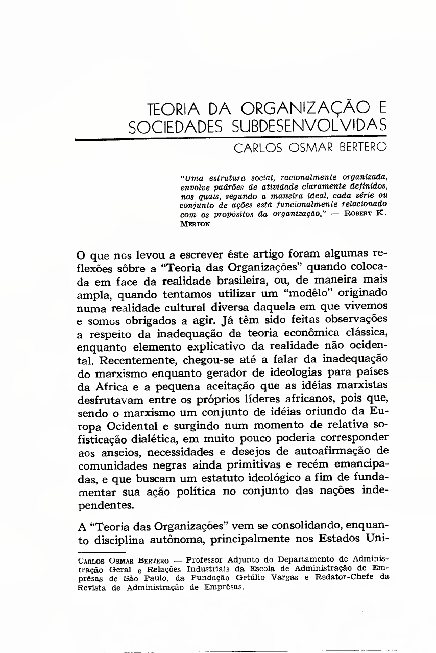 TEORIA DA ORGANIZAÇAO E SOCIEDADES SUBDESENVOLVIDAS CARLOS OSMAR BERTERO "Uma estrutura social, racionalmente organizada, envolve padrões de atividade claramente definidos, nos quais, segundo a maneira ideal, cada série ou conjunto de ações está funcionalmente relacionado com os propósitos da organização." - ROBERT K. MERTON o que nos levou a escrever êste artigo foram algumas re- flexões sôbre a "Teoria das Organizações" quando coloca- da em face da realidade brasileira, ou, de maneira mais ampla, quando tentamos utilizar um "modêlo" originado numa realidade cultural diversa daquela em que vivemos e somos obrigados a agir. Já têm sido feitas observações a respeito da inadequação da teoria econômica clássica, enquanto elemento explicativo da realidade não ociden- tal. Recentemente, chegou-se até a falar da inadequação do marxismo enquanto gerador de ideologias para países da Africa e a pequena aceitação que as idéias marxistas desfrutavam entre os próprios líderes africanos, pois que, sendo o marxismo um conjunto de idéias oriundo da Eu- ropa Ocidental e surgindo num momento de relativa so- fisticação dialética, em muito pouco poderia corresponder aos anseios, necessidades e desejos de autoafirmação de comunidades negras ainda primitivas e recém emancipa- das, e que buscam um estatuto ideológico a fim de funda- mentar sua ação política no conjunto das nações inde- pendentes. A "Teoria das Organizações" vem se consolidando, enquan- to disciplina autônoma, principalmente nos Estados Uni- CARLOS USMAR BERTERO - Professor Adjunto do Departamento de Adminis- tração Geral e Relações Industriais da Escola de Administração de Em- presas de São Paulo, da Fundação Getúlio Vargas e Redator-Chefe da Revista de Administração de Emprêsas. 108 SOCIEDADES SUBDESENVOLVIDAS R.A.E';25 dos e tem resultado do esfôrço de estudiosos com a mais diversificada formação cultural. É possível relacionar en- tre os "teóricos" da Organização sociólogos, psicólogos, ma- temáticos. economistas e biólogos. É inevitável que ten- tem aplicar às suas reflexões os modelos e conceitos fun- damentais das ciências em que foram formados, o que ex- plica o caráter eclético e pouco orgânico da "Teoria das Organizações" na sua fase inicial. Porém todos êstes ele- mentos apesar de sua diversidade contêm, a nosso ver, alguns elementos em comum que poderiam ser resumidos sob a elevada racionalidade atingida pelas sociedades oci- dentais nos últimos quatro séculos. Foi esta racionalidade e particularmente o desenvolvimento das ciências sociais, e dentre elas, a economia, as responsáveis pelo oferecimen- to de um quadro conceitual altamente elaborado e dotado de suficiente operacionalidade que permitiu a todos os teorizadores a formulação de uma "Teoria das Organi-' zações". Ora, considerando-se que os países não desenvolvidos, o que equivale dizer, não-ocidentais de um ponto de vista cultural, (a União Soviética é, em nosso entender, um país permeado de cultura ocidental, o que se tornou definitivo após a revolução de 1917) não têm o mesmo passado que os países ocidentais, e suas culturas se afastam, por vêzes, diametralmente dos padrões de racionalidade, tal qual esta é entendida na cultura ocidental, cabe questionar da va- lidade da "Teoria das Organizações" quando aplicadas a um contexto diverso do ocidental. Portanto, propomo-nos desenvolver êste artigo em quatro etapas: • As teorias de organização como expressão da racionali- dade. • O significado dessa racionalidade. • Exigências organizacionais e • Conclusão. R.A.E./25 SOCIEDADES SUBDESENVOLVIDAS 109 AS TEORIAS DE ORGAN~ZAÇÃO COMO EXPRESSÃO DA RACIONALIDADE As primeiras tentativas no sentido de elaborar uma teo- ria organizacional tiveram lugar nos Estados Unidos, na Inglaterra e na França e, considerando-se a disputa que se tem desenvolvido entre os especialistas, decidimos não nos deter na determinação de quem teria sido realmente o primeiro a formular um conjunto de idéias a respeito das organizações. Conseqüentemente nos ateremos às dou- trinas de FREDERICKW. TAYLORe HENRIFAYOLcomo os teorizadores que exerceram influência decisiva na for- mação de uma teoria que já nos habituamos a chamar de clássica. o que importa considerar do nosso ponto de vista, não são as várias medidas de racionalização do trabalho empre- endidas por TAYLORou a enumeração de "funções" admi- nistrativas realizadas por FAYOL,mas antes nos deter- mos sôbre os procedimentos metodológicos e os pressupos- tos de uma filosofia da ciência, que permeavam as etapas da elaboração das teorias dos referidos pensadores. Acre- ditamos que a "escola clássica" foi a manifestação de uma racionalidade de tipo baconiano e cartesiano ao nível da teoria da organização. O próprio TAYLORlamentava dian- te da Comissão de Inquérito instaurada para investigar os efeitos e conseqüências do taylorismo sôbre o regime de trabalho operário em algumas organizações americanas por volta de 1912, o desperdício em que se incorria por causa da ineficiência industrial que acarretava enormes prejuízos à nação, retardando o seu ritmo de desenvolvi- mento. Esta ineficiência, no entender de TAYLOR,era mo- tivada pela falta de uma ciência da administração que permitisse a objetivação dos procedimentos e a constitui- ção de um corpo de conhecimentos que dessem à adminis- tração as mesmas características de universalidade encon- tradiças em outros setores do conhecimento e da ativida- de humana. A ausência de uma "verdade" administrativa implicava em que se dependesse para a condução das em- 110 SOCIEDADES SUBDESENVOLVIDAS R.A.E./25 prêsas dos "homens de gênio", cuja incidência e apareci- mento eram aleatórios. A criação de uma categoria especial, os administradores profissionais, só seria possível quando se consolidasse um "conjunto de princípi