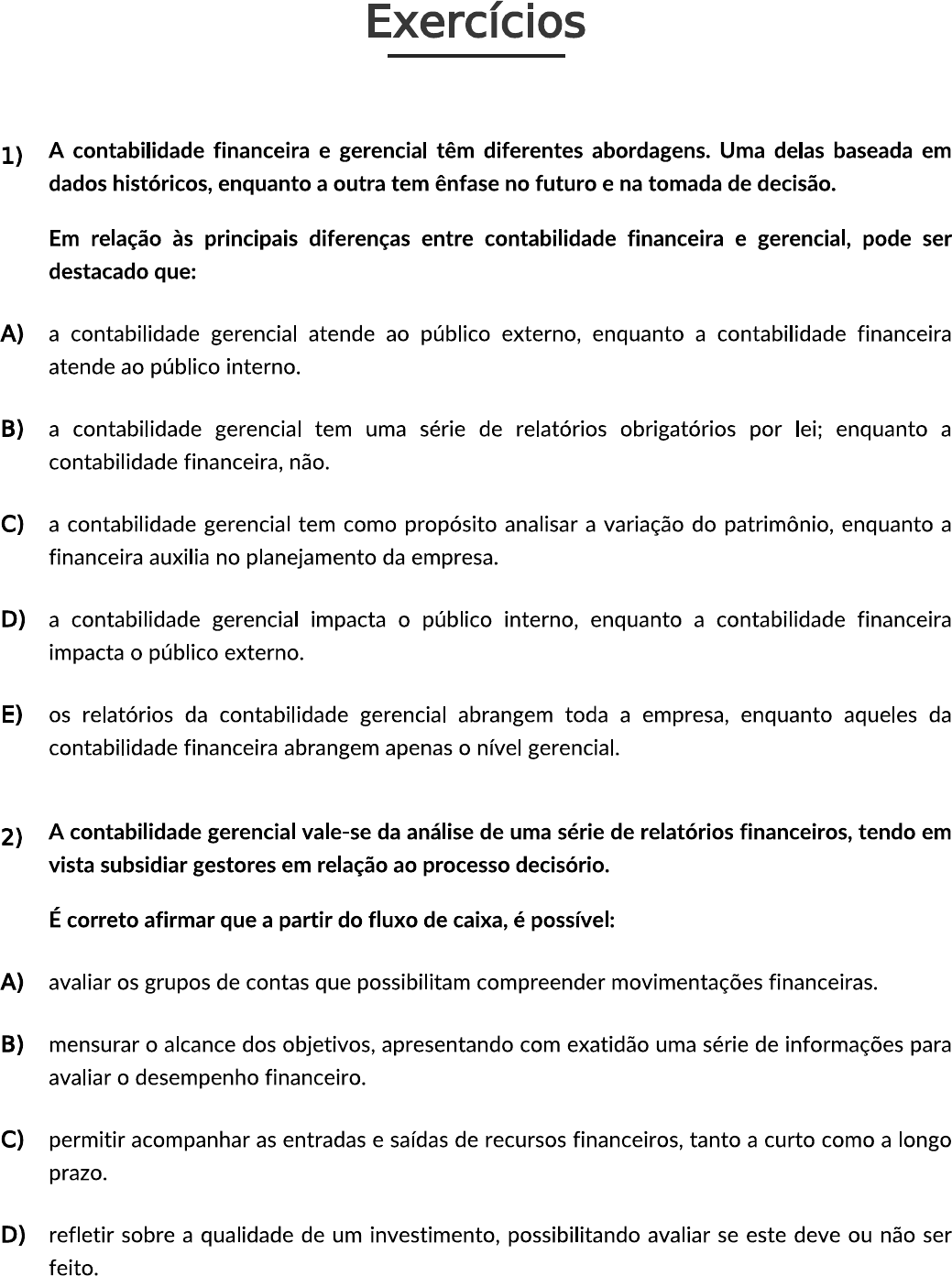 Exercícios 1) A contabilidade financeira e gerencial têm diferentes abordagens. Uma delas baseada em dados históricos, enquanto a outra tem ênfase no futuro e na tomada de decisão. Em relação às principais diferenças entre contabilidade financeira e gerencial, pode ser destacado que: A) a contabilidade gerencial atende ao público externo, enquanto a contabilidade financeira atende ao público interno. B) a contabilidade gerencial tem uma série de relatórios obrigatórios por lei; enquanto a contabilidade financeira, não. C) a contabilidade gerencial tem como propósito analisar a variação do patrimônio, enquanto a financeira auxilia no planejamento da empresa. D) a contabilidade gerencial impacta público interno, enquanto a contabilidade financeira impacta o público externo. E) os relatórios da contabilidade gerencial abrangem toda a empresa, enquanto aqueles da contabilidade financeira abrangem apenas o nível gerencial. 2) A contabilidade gerencial vale-se da análise de uma série de relatórios financeiros, tendo em vista subsidiar gestores em relação ao processo decisório. É correto afirmar que a partir do fluxo de caixa, é possível: A) avaliar os grupos de contas que possibilitam compreender movimentações financeiras. B) mensurar o alcance dos objetivos, apresentando com exatidão uma série de informações para avaliar o desempenho financeiro. C) permitir acompanhar as entradas e saídas de recursos financeiros, tanto a curto como a longo prazo. D) refletir sobre a qualidade de um investimento, possibilitando avaliar se este deve ou não ser feito.E) permitir a análise da viabilidade financeira a partir de elementos, como os gastos fixos e a margem de contribuição. 3) A contabilidade gerencial passou por um processo evolutivo, onde em cada um destes estágios existem diferentes características e ferramentas. Em relação ao estágio atual da contabilidade gerencial, é correto afirmar que: A) tem foco na geração de valor. B) tem como principais ferramentas benchmarking. C) tem foco no planejamento gerencial. D) tem foco na redução do desperdício. E) tem como ferramenta o just in time. 4) contabilidade gerencial possibilita auxiliar gestores no processo de planejamento e na tomada de decisão. Essas decisões estão relacionadas à possibilidade de investimentos. Em relação à importância da contabilidade gerencial nas decisões de investimento, é possível afirmar que uma de suas funções é: A) avaliar a concorrência do setor bancário. B) estabelecer níveis de financiamento a longo prazo. C) estabelecer níveis de financiamento a curto prazo. D) envolver recursos de terceiros. E) avaliar propostas de aplicação de capital. 5) Um dos recursos da contabilidade gerencial, que permite a tomada de decisão, é ponto de equilíbrio. Por meio do cálculo do ponto de equilíbrio, é possível compreender quantas unidades de um produto são necessárias que uma empresa venda para que todos os custos sejam pagos. Na contabilidade gerencial, a partir do ponto de equilíbrio, é possível tomar decisões como: A) reduzir patrimônio líquido.B) reduzir os gastos fixos. C) analisar as melhores taxas de investimento. D) definir o orçamento para metas e objetivos. E) controlar o capital no fluxo da empresa.