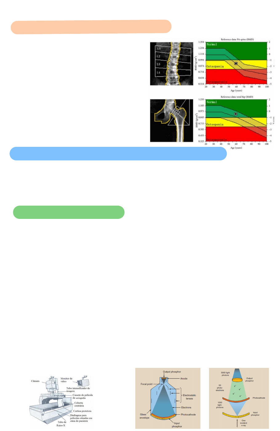2- DENSITOMETRIA ÓSSEA ● Técnica de radiografia utilizada para diagnosticar osteoporose/ osteopenia ● acomete mais mulheres mais velhas ● técnica restrita que não precisa de grandes estruturas para ser realizada ● busca enxergar o contraste ósseo ● Feita em dois pontos: L1 a L4 e no fêmur ● O programa já fornece a informação de se a densidade óssea está normal ou não ● Medido em g/cm^2 3- RADIOGRAFIA INTERVENCIONISTA ● Conjunto de técnicas utilizadas para auxiliar em procedimentos cirúrgicos ● uma das técnicas radiológicas que mais propicia dose para o corpo técnico - reforço dos cuidados com o controle de dose e proteção radiológica ● Várias técnicas que auxiliam na obtenção de imagem 4- FLUOROSCOPIA ● Técnica para observar imagens dinâmicas do paciente ● Utilizada para exames do movimento das estruturas internas e dos fluidos ● há muito tempo de exposição -> muita dose ● pode ou não utilizar agente de contraste (com número atômico maior que o meio, aumentando o efeito fotoelétrico) ● a imagem é enxergada ao contrário ( material que absorver mais, visualizamos mais escuro e o que absorver menos, mais claro) devido ao método de detecção ● raios x entra no tubo intensificador -> interage com um fotocatodo -> fotocatodo emite fótons e os converte em elétrons -> elétrons acelerados em direção ao ânodo -> são colimados em lentes -> invertem a imagem (como uma fotografia) -> saem pelo orifício de saída feito de fósforo -> a interação com a película de fósforo emite luz -> esses fótons colidem no fotocatodo -> transforma fótons de luz em elétrons -> elétrons acelerados e colimados em direção a outra camada de fósforo -> mais emissão de luz ● Ou seja: onde o raio X foi absorvido, teremos menos fótons de luz para enxergar (fica preto) e onde passou mais raios X , temos mais fótons de luz para enxergar (fica branco) 5- TOMOGRAFIA COMPUTADORIZADA ● modalidade versátil de imagem do corpo inteiro em 3 dimensões, com uma ampla gama de aplicações: 1. Diagnóstico e estudo de acompanhamento de pacientes 2. planejamento radioterápico 3. Triagem de subpopulações saudáveis com fatores de risco ● auxilia no controle de radiação aplicada no tecido sadio e direcionamento ao tumoral ● forma que produz uma junção de diversas radiografias, montando a imagem espacial tridimensional (axial ou transversal) ● existem 2 tipos de feixe: Pencil bean (retangular) e o fan bean (cônico) ● 1ª geração de tomógrafos: Pencil bean, 1 feixe e um detector fazendo rotações e translações, criando uma sobreposição de imagens ● 2ª geração: mesmo sistema de rotação e translação, possui uma matriz de detectores e utiliza o fan beam (mais rápido a geração, feixe mais aberto atingindo o máximo de detectores possíveis) ● 3ª geração: sistema de rotação e rotação (tudo gira junto, tempo de imagem em subsegundos) ● 4ª geração: o tubo gira, mas o anel de detectores fica estacionado (detectores em 360°) ● utiliza o sistema de interpolação: uma reta traçada gerando pontos prováveis (nunca de extrapolação) ● vizualização por voxels e em escala de cinza (128 valores de cinza) ● A exibição é definida usando: 1. Nível da janela (WL) como número TC de cinza médio 2. Largura da janela (WW) como o número de HU de preto para branco