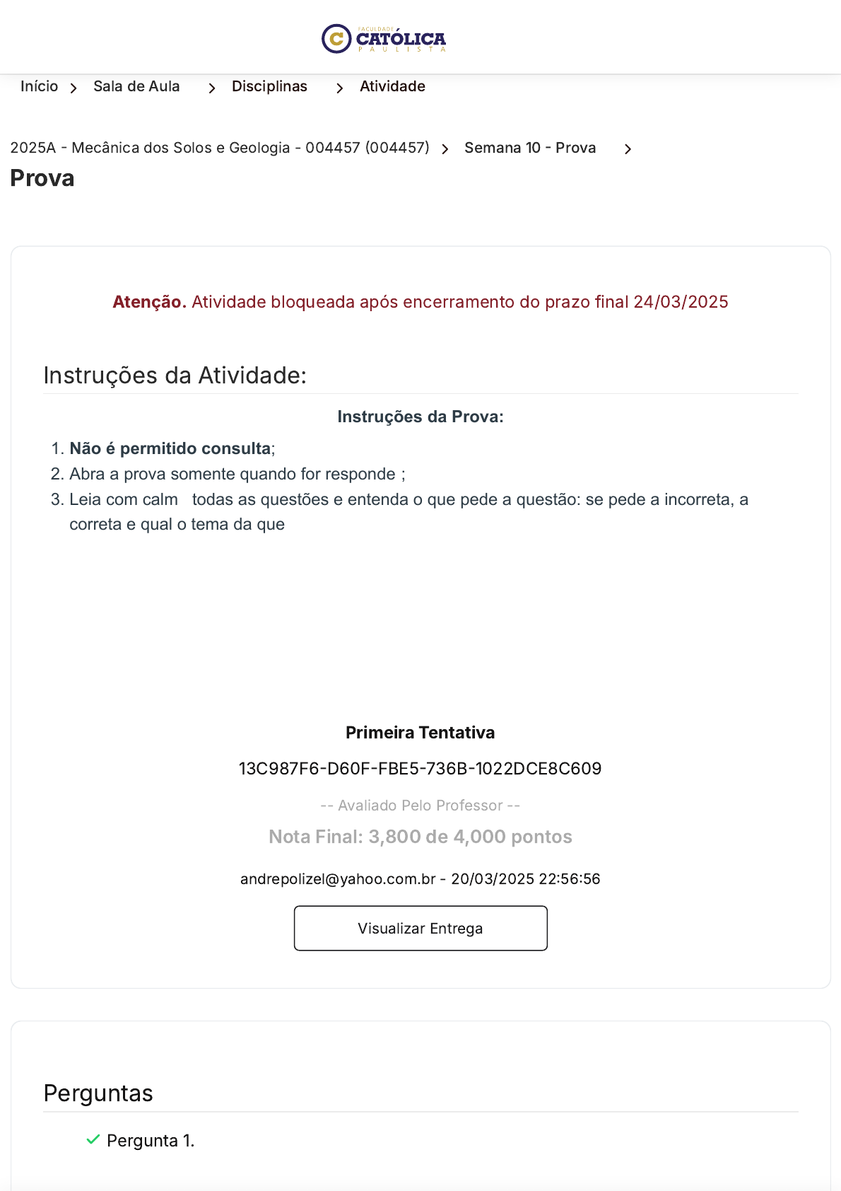 Início 〉 Sala de Aula 〉 Disciplinas 〉 Atividade 2025A - Mecânica dos Solos e Geologia - 004457 (004457) 〉 Semana 10 - Prova 〉 Prova Instruções da Atividade: Atenção. Atividade bloqueada após encerramento do prazo final 24/03/2025 Instruções da Prova: 1. Não é permitido consulta; 2. Abra a prova somente quando for responder; 3. Leia com calma todas as questões e entenda o que pede a questão: se pede a incorreta, a correta e qual o tema da questão; 4. Responda as questões dissertativas com suas próprias palavras de forma clara e objetiva; 5. Você tem 3h para finalizar a prova; 6. Lembre-se de Clicar no botão "Enviar"; 7. A nota da prova será somada às notas das atividades semanais. Boa sorte! Primeira Tentativa 13C987F6-D60F-FBE5-736B-1022DCE8C609 -- Avaliado Pelo Professor -- Nota Final: 3,800 de 4,000 pontos andrepolizel@yahoo.com.br - 20/03/2025 22:56:56 Visualizar Entrega Perguntas Pergunta 1. https://ava.uca.edu.br/aluno/sala-de-aula/disciplina/modulo/atividade/340379 https://ava.uca.edu.br/aluno/sala-de-aula/disciplina/modulo/atividade/340379 https://ava.uca.edu.br/aluno/sala-de-aula/disciplina https://ava.uca.edu.br/aluno/sala-de-aula/disciplina/modulo/atividade/:id/:nome javascript:void(0); Pergunta 2. Pergunta 3. Pergunta 4. Pergunta 5. Pergunta 6. Pergunta 7. Pergunta 8. Pergunta 9. Pergunta 10. Pergunta 11. Pergunta 12. Esta atividade têm tempo limite de 3 horas pontos: 0,200Pergunta 1. Deve-se sempre ser empregado o teste mais propício para uma análise completa a depender do tipo de solo. As areias e as argilas se comportam de maneira distintas e, consequentemente, possuem resistência ao cisalhamento com peculiaridades. Dessa forma, assinale a alternativa correta: Múltipla Escolha: A. Para argilas, o ensaio da compressão simples é uma melhor representação do estado de resistência ao cisalhamento. B. Para as argilas e as areias, o ensaio de cisalhamento direto ou teste de compressão triaxial é uma melhor representação do estado de resistência ao cisalhamento. C. A resistência ao cisalhamento das areias é determinada e representada mais adequadamente através do ensaio de cisalhamento direto ou teste de compressão triaxial. javascript:void(0); D. A resistência ao cisalhamento das areias é determinada e representada mais adequadamente através do ensaio de compressão simples. E. Para as argilas e as areias, o ensaio da compressão simples é uma melhor representação do estado de resistência ao cisalhamento. pontos: 0,200Pergunta 2. Os carregamentos aplicados durante o processo de compactação do solo são dinâmicas e o efeito alcançado é imediato, através de vários equipamentos, podemos citar: compactadores de percussão, rolos lisos e pé de carneiro. Já o processo de adensamento é retardado no tempo (a efetivação total pode levar vários anos, dependendo do tipo de solo) e as cargas são geralmente estáticas. Qual o efeito da compactação: Múltipla Escolha: A. Expulsão somente da umidade, prevalecendo a estrutura e textura original do solo. B. Expulsão da umidade do solo e do ar presente nos poros. C. A redução do volume de solo implica no aumento da permeabilidade, o que garante a durabilidade do solo. Avaliação Nota Avaliada: Prof. Marcio Benavides Lessa em 21/03/2025 13:24 0,200 de 0,200 javascript:void(0); D. Reduz o volume do solo e proporcionalmente os vazios que compõem sua estrutura, além de quebrar as partículas de solo. E. Reduz o volume do solo e consequentemente reduz os vazios que compõem sua estrutura, porém a quantidade de água e partículas de solo não modifica. pontos: 0,200Pergunta 3. Segundo a norma NBR 7250/82, que rege a descrição e identificação de amostras de solo, a propriedade de solos finos, entre largos limites de umidade, de se submeterem a grandes deformações permanentes, sem sofrer ruptura, fissuramento ou variação de volume apreciável é: Múltipla Escolha: A. Limite de contração B. Limite de semi-sólido C. Índice de vazios do solo D. Avaliação Nota Avaliada: Prof. Marcio Benavides Lessa em 21/03/2025 13:24 0,200 de 0,200 javascript:void(0); Limite de liquidez E. Plasticidade pontos: 0,200Pergunta 4. A porcentagem de matéria orgânica é variável de solo para solo, pois depende da quantidade de resíduos orgânicos depositados de quanto dessa matéria orgânica foi mineralizada. O ciclo de nutrientes é um processo muito importante, a respeito desse conteúdo, assinale a alternativa que contém a afirmativa correta: Múltipla Escolha: A. Pelo fato de ser depositado principalmente por plantas e animais sobre ou na superfície do solo, está concentrado nas camadas mais internas, ou seja, à medida que a profundidade do solo aumenta, o conteúdo de matéria orgânica no solo aumenta proporcionalmente. B. As frações húmicas são de grande importância, pois segregam as partículas sólidas, compactando os poros e dificultando a retenção de água do solo. C. A atividade da matéria orgânica presente nos solos colabora para a coesão das partículas, além disso, aumenta a porosidade do solo, ou seja, facilitando a transferência de água no perfil do solo. Avaliação Nota Avaliada: Prof. Marcio Benavides Lessa em 21/03/2025 13:24 0,200 de 0,200 javascript:void(0); D. Os solos que possuem uma coloração mais escuras indicam a presença de matéria orgânica decomposta ou em decomposição. É um solo considerado bom para engenharia civil e de fundações, mas não é um solo bom para agricultura, pois ele possui uma boa compactação e cria vazios devido a decomposição da matéria orgânica. E. A quantidade de matéria orgânica pode ser observada através da coloração. As camadas de solo com maior teor de matéria orgânica variam de tons amarelados. pontos: 0,200Pergunta 5. Alguns métodos científicos permitem analisar a ocorrência de danos causados por fenômenos de colapso e subsidência. Entre eles sobressaem os métodos de identificação