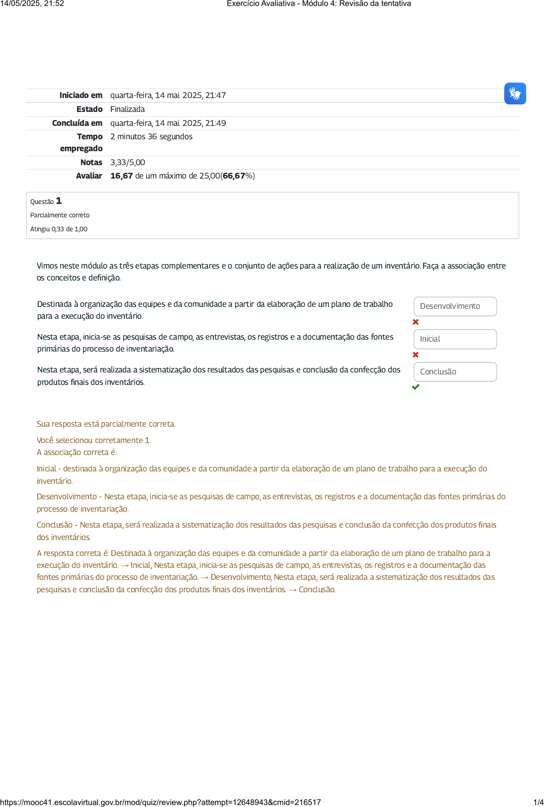 Iniciado em quarta-feira, 14 mai. 2025, 21:47 Estado Finalizada Concluída em quarta-feira, 14 mai. 2025, 21:49 Tempo empregado 2 minutos 36 segundos Notas 3,33/5,00 Avaliar 16,67 de um máximo de 25,00(66,67%) Questão 1 Parcialmente correto Atingiu 0,33 de 1,00 Vimos neste módulo as três etapas complementares e o conjunto de ações para a realização de um inventário. Faça a associação entre os conceitos e definição. Destinada à organização das equipes e da comunidade a partir da elaboração de um plano de trabalho para a execução do inventário. Nesta etapa, inicia-se as pesquisas de campo, as entrevistas, os registros e a documentação das fontes primárias do processo de inventariação. Nesta etapa, será realizada a sistematização dos resultados das pesquisas e conclusão da confecção dos produtos finais dos inventários. Desenvolvimento Inicial Conclusão Sua resposta está parcialmente correta. Você selecionou corretamente 1. A associação correta é: Inicial - destinada à organização das equipes e da comunidade a partir da elaboração de um plano de trabalho para a execução do inventário. Desenvolvimento – Nesta etapa, inicia-se as pesquisas de campo, as entrevistas, os registros e a documentação das fontes primárias do processo de inventariação. Conclusão – Nesta etapa, será realizada a sistematização dos resultados das pesquisas e conclusão da confecção dos produtos finais dos inventários. A resposta correta é: Destinada à organização das equipes e da comunidade a partir da elaboração de um plano de trabalho para a execução do inventário. → Inicial, Nesta etapa, inicia-se as pesquisas de campo, as entrevistas, os registros e a documentação das fontes primárias do processo de inventariação. → Desenvolvimento, Nesta etapa, será realizada a sistematização dos resultados das pesquisas e conclusão da confecção dos produtos finais dos inventários. → Conclusão. 14/05/2025, 21:52 Exercício Avaliativa - Módulo 4: Revisão da tentativa https://mooc41.escolavirtual.gov.br/mod/quiz/review.php?attempt=12648943&cmid=216517 1/4 Questão 2 Incorreto Atingiu 0,00 de 1,00 Analise os itens a seguir: I - Caso o inventário participativo seja realizado por profissionais, não precisará passar pela etapa de aprovação da comunidade participantes. II - O recorte da pesquisa não deve ser preciso, pois isso pode ser trocado a todo momento, de acordo com quem dirige a pesquisa. III - A formação da equipe não precisa estar prevista no cronograma, pois como é um trabalho simples, qualquer um pode ser instruído ao preenchimento das fichas rapidamente. IV - É importante que todas as etapas sejam elaboradas com cuidado e que toda equipe esteja ciente do processo e em diálogo com a comunidade em questão. Escolha uma: Escolha uma opção: a. Apenas a afirmativa I está correta. b. Apenas a afirmativa IV está correta. c. Apenas II e III estão incorretas. d. Apenas III e IV estão incorretas. Sua resposta está incorreta. Comentários sobre as afirmativas incorretas: Caso o inventário participativo seja realizado por profissionais, não precisará passar pela etapa de aprovação da comunidade participantes. Nessa tipologia de inventário, é a comunidade e seus representantes que conduzem e protagonizam todas as etapas do processo. A escolha da equipe e dos pesquisadores é feita pelos membros da comunidade que protagonizará o inventário, de forma participativa. O recorte da pesquisa não deve ser preciso, pois isso pode ser trocado a todo momento, de acordo com quem dirige a pesquisa. Iniciar um processo de inventariação requer tomar decisões e direcionamentos que influenciarão todo o processo de pesquisa. O recorte da pesquisa deve definir de forma precisa o universo de bens culturais que se pretende inventariar e deve direcionar a realização das demais etapas. A formação da equipe não precisa estar prevista no cronograma, pois como é um trabalho simples, qualquer um pode ser instruído ao preenchimento das fichas rapidamente. A primeira ação para iniciar a realização de um inventário participativo deve ser a constituição de um grupo impulsionador da ideia na comunidade onde o trabalho será desenvolvido. Esse coletivo irá animar as atividades, bem como articular o processo de sensibilização e participação comunitária necessária para a concretização do objetivo almejado. Essa atividade inicial é de grande importância para o desenvolvimento satisfatório do trabalho, pois, como já foi sinalizado, é fundamental a participação social em todas as etapas do processo de inventariação. A resposta correta é: Apenas a afirmativa IV está correta. 14/05/2025, 21:52 Exercício Avaliativa - Módulo 4: Revisão da tentativa https://mooc41.escolavirtual.gov.br/mod/quiz/review.php?attempt=12648943&cmid=216517 2/4 Questão 3 Correto Atingiu 1,00 de 1,00 Questão 4 Correto Atingiu 1,00 de 1,00 Arraste solte: Iniciar um processo de inventariação requer tomar decisões e direcionamentos que irão influenciar todo o processo de realização da pesquisa . Assim, é preciso definir o mais previamente possível o universo de bens culturais que se pretende inventariar, estabelecer problemáticas e um recorte para a pesquisa, mediante o tempo e os recursos humanos, financeiros e materiais disponíveis ajudam a evitar surpresas desagradáveis e a conduzir de maneira satisfatória o desenvolvimento de todo trabalho. Sua resposta está correta. Iniciar um processo de (inventariação) requer tomar decisões e direcionamentos que irão influenciar todo o processo de realização da (pesquisa). Assim, é preciso definir o mais previamente possível o universo de (bens culturais) que se pretende inventariar, estabelecer problemáticas e um recorte para a pesquisa, mediante o tempo e os recursos humanos, financeiros e materiais disponíveis ajudam a evitar surpresas desagradáveis e a conduzir de maneira satisf