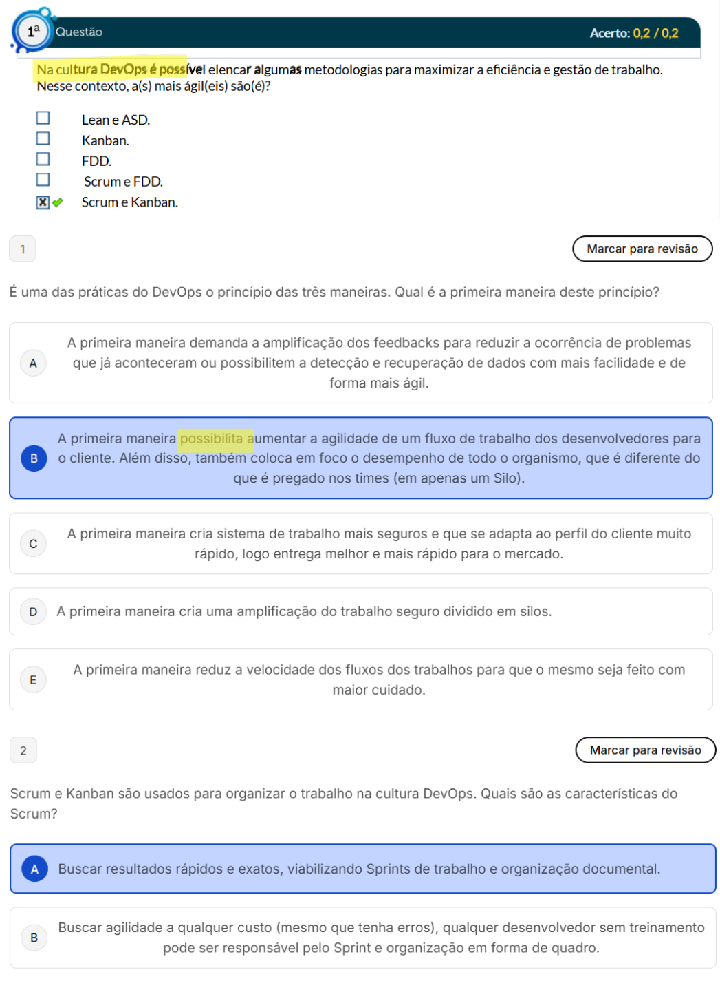 Questão Acerto: 0,2 / 0,2 Na cultura DevOps é possível elencar algumas metodologias para maximizar a eficiência e gestão de trabalho. Nesse contexto, a(s) mais ágil(eis) são(é)? Lean e ASD. Kanban. FDD. Scrum e FDD. X Scrum e Kanban. 1 Marcar para revisão É uma das práticas do DevOps princípio das três maneiras. Qual é a primeira maneira deste princípio? A primeira maneira demanda a amplificação dos feedbacks para reduzir a ocorrência de problemas A que já aconteceram ou possibilitem a detecção e recuperação de dados com mais facilidade e de forma mais ágil. A primeira maneira possibilita aumentar a agilidade de um fluxo de trabalho dos desenvolvedores para cliente. Além disso, também coloca em foco o desempenho de todo organismo, que é diferente do que é pregado nos times (em apenas um Silo). A primeira maneira cria sistema de trabalho mais seguros e que se adapta ao perfil do cliente muito rápido, logo entrega melhor e mais rápido para mercado. D A primeira maneira cria uma amplificação do trabalho seguro dividido em silos. A primeira maneira reduz a velocidade dos fluxos dos trabalhos para que mesmo seja feito com E maior cuidado. 2 Marcar para revisão Scrum e Kanban são usados para organizar trabalho na cultura DevOps. Quais são as características do Scrum? A Buscar resultados rápidos e exatos, viabilizando Sprints de trabalho e organização documental. Buscar agilidade a qualquer custo (mesmo que tenha erros), qualquer desenvolvedor sem treinamento pode ser responsável pelo Sprint e organização em forma de quadro.Não precisa de nenhum curso para ser Scrum Master. D Apenas buscar resultados rápidos, independente da qualidade. E A metodologia Scrum tende a ser contínua e mais fluida. 3 Marcar para revisão Em DevOps, alguns processos se destacam. Entre eles os processos de entrega contínua e integração contínua. Qual a diferença entre entrega contínua e integração contínua? A entrega contínua é feita por processos automatizados e a integração contínua é a liberação A constante de funcionalidades para cliente. termo entrega contínua não tem relação com as metodologias ágeis, já a integração contínua sim. A entrega contínua consiste em liberar constantemente novas funcionalidades para cliente de forma segura, já a integração contínua é uma prática que depende de processos manuais ou automatizados. A entrega contínua não depende dos desenvolvedores, já a integração depende exclusivamente dos D desenvolvedores não podendo ter nenhum tipo de automação. A entrega contínua visa aguardar todo desenvolvimento do produto ser finalizado para liberar sua E versão. Já a integração contínua visa executar os processos de infraestrutura separadamente, de forma manual e desencadeada. 4 Marcar para revisão DevOps é uma forma de gerir processo de desenvolvimento, teste e operação de software. Quais são principais benefícios da implantação da Cultura DevOps? Maior agilidade na comunicação do desenvolvimento e infraestrutura; Economia de recursos; Maior A velocidade de produção; Melhor qualidade; Redução de erros; Soluções com melhor desempenho e estabilidade; Melhor ambiente de trabalho. Menor agilidade na comunicação do desenvolvimento e infraestrutura; aumento de recursos; menor velocidade produção; Melhor qualidade; Redução de erros; Soluções com melhor desempenho e estabilidade; Melhor ambiente de trabalho.Maior agilidade nos processos do desenvolvimento e infraestrutura sem se preocupar com erros; Economia de recursos; Maior velocidade produção; Melhor qualidade; redução de erros; Soluções com melhor desempenho e estabilidade; Melhor ambiente de trabalho. Maior agilidade na comunicação do desenvolvimento e infraestrutura; Economia de recursos; Maior D velocidade produção; Melhor qualidade; aumento de erros; Soluções com melhor desempenho e estabilidade; Melhor ambiente de trabalho. Entregas no prazo; Melhor governança dos equipamentos; Melhora a disponibilidade dos E equipamentos do time. 5 Marcar para revisão DevOps usa metodologias para organizar trabalho (gerir trabalho). Dentre elas, Scrum e Kanban se destacam. Qual a diferença entre Scrum e Kanban? Kanban precisa ter um product owner, Scrum Master e uma equipe scrum. Enquanto Scrum baseia- A se apenas no kanban board. A metodologia Kanban é baseada em sprints de trabalho curtos e fluidos, enquanto Scrum é contínuo e estruturado. No Kanban, utiliza-se três organizações documentais para trabalho (product backlog, Sprint backlog e definição de ponto), já Scrum não. Scrum foi criado no Japão e é a modalidade mais utilizada no mercado de Software. Kanban não é D mais utilizado, sendo visto apenas como um modelo de referência. A metodologia Kanban é contínua e mais fluida, enquanto Scrum é baseado em sprints de trabalho E curtos e estruturados. 6 Marcar para revisão NuGet é um gerenciador de dependências bastante utilizado. Sobre gerenciador de dependências NuGet, determine se as afirmações são verdadeiras ou falsas: NuGet viabiliza desenvolver uma biblioteca com arquivos no formato DLL (código compilado) ou projetos de uma biblioteca (arquivo compactado). É um gerenciador voltado para aplicações .NET e mantém um repositório público. ( ) Analisa se pacote do desenvolvedor é compatível com a versão definida do projeto destino e faz mesmo com as dependências do pacote. Assinale a alternativa que apresenta a sequência correta de cima para baixo.A F;F;F V;F;F F;V;F D F;F;V E V;V;V 7 Marcar para revisão Controlar as versões do código fonte é uma importante medida em qualquer ambiente de desenvolvimento. Quais as funções do controle de versão? A Configurar softwares no seu ciclo de vida, sem recuperar configurações perdidas. Identificar, armazenar e gerenciar tanto os itens de configuração como suas versões ao longo do ciclo de vida do software, avaliar histórico de alterações 