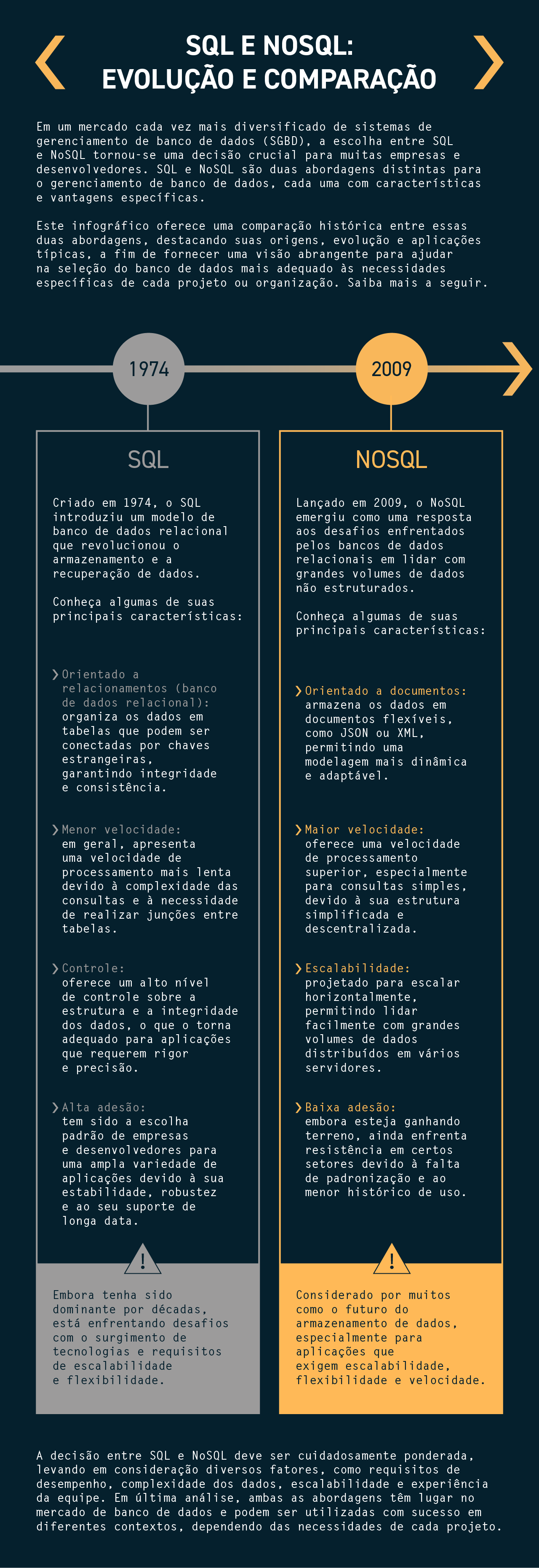 SQL E NOSQL: EVOLUÇÃO E COMPARAÇÃO Em um mercado cada vez mais diversificado de sistemas de gerenciamento de banco de dados (SGBD), a escolha entre SQL e NoSQL tornou-se uma decisão crucial para muitas empresas e desenvolvedores. SQL e NoSQL são duas abordagens distintas para gerenciamento de banco de dados, cada uma com características e vantagens específicas. Este infográfico oferece uma comparação histórica entre essas duas abordagens, destacando suas origens, evolução e aplicações típicas, a fim de fornecer uma visão abrangente para ajudar na seleção do banco de dados mais adequado às necessidades específicas de cada projeto ou organização. Saiba mais a seguir. 1974 2009 SQL NOSQL Criado em 1974, SQL Lançado em 2009, NoSQL introduziu um modelo de emergiu como uma resposta banco de dados relacional aos desafios enfrentados que revolucionou pelos bancos de dados armazenamento e a relacionais em lidar com recuperação de dados. grandes volumes de dados não estruturados. Conheça algumas de suas principais características: Conheça algumas de suas principais características: > Orientado a relacionamentos (banco > Orientado a documentos: de dados relacional): armazena dados em organiza dados em documentos flexíveis, tabelas que podem ser como JSON ou XML, conectadas por chaves permitindo uma estrangeiras, modelagem mais dinâmica garantindo integridade e adaptável. e consistência. > Menor velocidade: > Maior velocidade: em geral, apresenta oferece uma velocidade uma velocidade de de processamento processamento mais lenta superior, especialmente devido à complexidade das para consultas simples, consultas e à necessidade devido à sua estrutura de realizar junções entre simplificada e tabelas. > Controle: > Escalabilidade: oferece um alto nível projetado para escalar de controle sobre a horizontalmente, estrutura e a integridade permitindo lidar dos dados, que torna facilmente com grandes adequado para aplicações volumes de dados que requerem rigor distribuídos em vários e precisão. servidores. > Alta adesão: > Baixa adesão: tem sido a escolha embora esteja ganhando padrão de empresas terreno, ainda enfrenta e desenvolvedores para resistência em certos uma ampla variedade de setores devido à falta aplicações devido à sua de padronização e ao estabilidade, robustez menor histórico de uso. e ao seu suporte de longa data. ! Embora tenha sido Considerado por muitos dominante por décadas, como futuro do está enfrentando desafios armazenamento de dados, com surgimento de especialmente para tecnologias e requisitos aplicações que de escalabilidade exigem escalabilidade, e flexibilidade. flexibilidade e velocidade. A decisão entre SQL e NoSQL deve ser cuidadosamente ponderada, levando em consideração diversos fatores, como requisitos de desempenho, complexidade dos dados, escalabilidade e experiência da equipe. Em última análise, ambas as abordagens têm lugar no mercado de banco de dados e podem ser utilizadas com sucesso em diferentes contextos, dependendo das necessidades de cada projeto.
