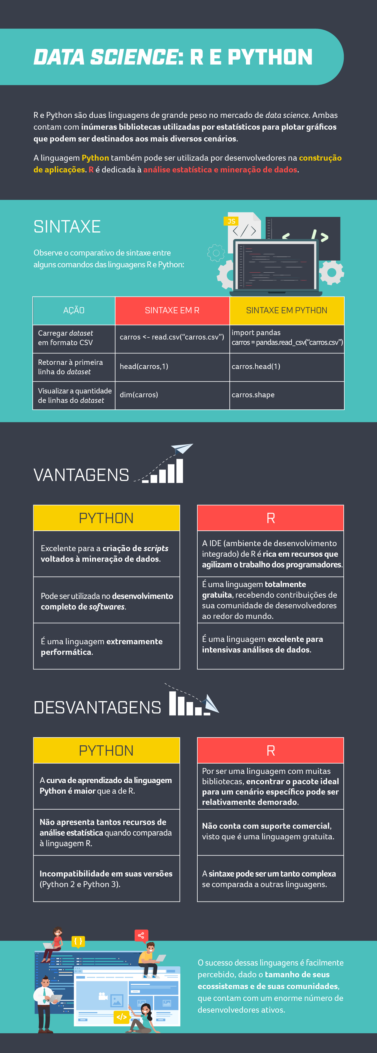 DATA SCIENCE: R E PYTHON Re Python são duas linguagens de grande peso no mercado de data science. Ambas contam com inúmeras bibliotecas utilizadas por estatísticos para plotar gráficos que podem ser destinados aos mais diversos cenários. A linguagem Python também pode ser utilizada por desenvolvedores na construção de aplicações. R é dedicada à análise estatística e mineração de dados. SINTAXE Observe comparativo de sintaxe entre alguns comandos das linguagens Re Python: AÇÃO SINTAXE EM R SINTAXE EM PYTHON Carregar dataset carros
