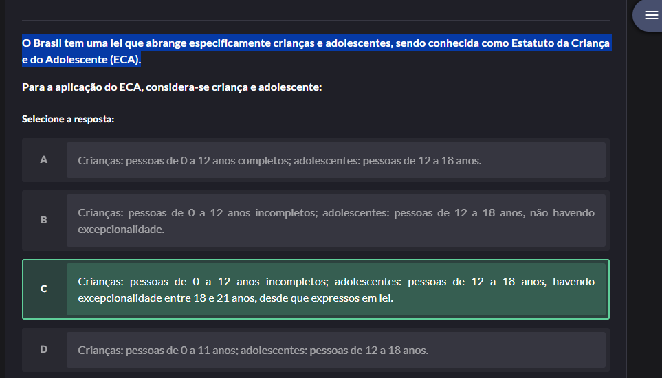 Brasil tem uma lei que abrange especificamente crianças e adolescentes, sendo conhecida como Estatuto da Criança e do Adolescente (ECA). Para a aplicação do ECA, considera-se criança e adolescente: Selecione a resposta: A Crianças: pessoas de 0 a 12 anos completos; adolescentes: pessoas de 12 a 18 anos. Crianças: pessoas de 0 a 12 anos incompletos; adolescentes: pessoas de 12 a 18 anos, não havendo excepcionalidade. Crianças: pessoas de 0 a 12 anos incompletos; adolescentes: pessoas de 12 a 18 anos, havendo excepcionalidade entre 18 e 21 anos, desde que expressos em lei. D Crianças: pessoas de 0 a 11 anos; adolescentes: pessoas de 12 a 18 anos.