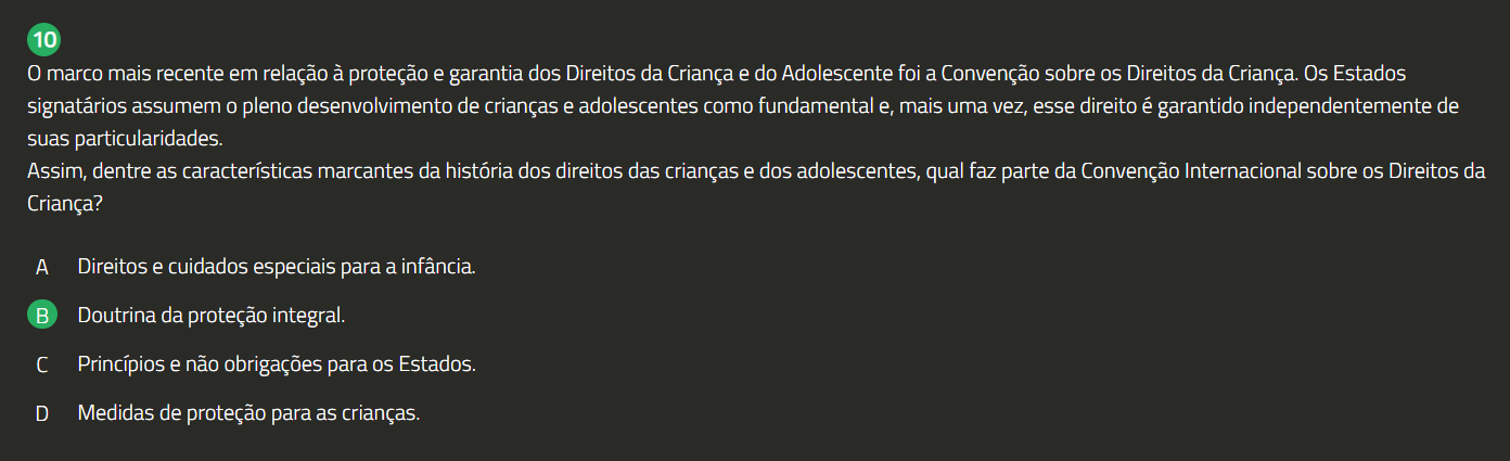10 0 marco mais recente em relação à proteção e garantia dos Direitos da Criança e do Adolescente foi a Convenção sobre OS Direitos da Criança. Os Estados signatários assumem 0 pleno desenvolvimento de crianças e adolescentes como fundamental e, mais uma vez, esse direito é garantido independentemente de suas particularidades. Assim, dentre as características marcantes da história dos direitos das crianças e dos adolescentes, qual faz parte da Convenção Internacional sobre Direitos da Criança? A Direitos e cuidados especiais para a infância. Doutrina da proteção integral. Princípios e não obrigações para Estados. D Medidas de proteção para as crianças.