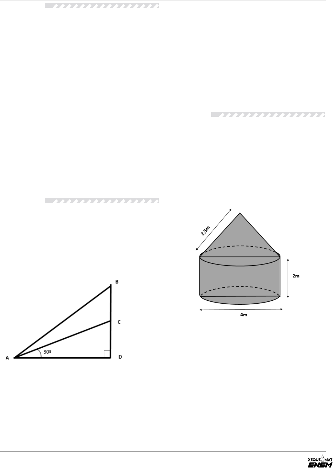 enem2022 Página 12 Questão 37 Uma prefeitura possui modelos de lixeira de forma cilíndrica, sem tampa, com raio medindo 10 cm e altura de 50 cm. Para fazer uma compra adicional, solicita à empresa fabricante um orçamento de novas lixeiras, com a mesma forma e outras dimensões. A prefeitura só irá adquirir as novas lixeiras se a capacidade de cada uma for no mínimo dez vezes maior que o modelo atual e seu custo unitário não ultrapassar R$ 20,00. O custo de cada lixeira é proporcional à sua área total e o preço do material utilizado na sua fabricação é de R$ 0,20 para cada 100 cm2. A empresa apresenta um orçamento discriminando o custo unitário e as dimensões, com o raio sendo o triplo do anterior e a altura aumentada em 10 cm. (Aproxime π para 3.) O orçamento dessa empresa é rejeitado pela prefeitura, pois A o custo de cada lixeira ficou em R$ 21,60. B o custo de cada lixeira ficou em R$ 27,00. C o custo de cada lixeira ficou em R$ 32,40. D a capacidade de cada lixeira ficou 3 vezes maior. E capacidade de cada lixeira ficou 9 vezes maior. Questão 38 André Gabriel ganhou de presente um drone. Certo dia, ele e seu irmão Tomás fizeram a seguinte brincadeira: Tomás coloco o drone no chão, no ponto D, e em seguida André Gabriel, localizado no ponto A, levantou o drone até o ponto C, situado a 2 metros do ponto D, formando um ângulo de 30º (DÂC) com a horizontal. Depois, com o drone ainda no ponto C, ele o subiu até o ponto B, formando agora um ângulo de 45º (DÂB) com a horizontal, como mostra a figura a seguir. Considerando √3 = 1,73, a medida, em metros, da distância entre os pontos B e C é, aproximadamente, igual a A 0,73 B 1,47 C 1,73 D 2,46 E 3,46 Questão 39 O responsável por certo local realizou um processo de licitação para a construção de 100 cisternas de placas de cimento para famílias da sua zona rural. Esse sistema de armazenamento de água é simples, de baixo custo. A empreiteira vencedora estipulou o preço de 40 reais por m² construído, tomando por base a área externa da cisterna. O modelo de cisterna pedido no processo tem a forma de um cilindro com uma cobertura em forma de cone, conforme a figura abaixo. Considerando π = 3,14 e que a construção da base das cisternas deve estar incluída nos custos, é correto afirmar que o valor, em reais, a ser gasto pela prefeitura na construção das 100 cisternas será, no máximo, de A 100.960 B 125.600 C 140.880 D 202.888 E 213.520 enem2022 Página 13 Questão 40 Possivelmente você já tenha escutado a pergunta: "O que pesa mais, 1 kg de algodão ou 1 kg de chumbo?". É óbvio que ambos têm a mesma massa, portanto, o mesmo peso. O truque dessa pergunta é a grande diferença de volumes que faz, enganosamente, algumas pessoas pensarem que pesa mais quem tem maior volume, levando-as a responderem que é o algodão. A grande diferença de volumes decorre da diferença de densidade (ρ) dos materiais, ou seja, a razão entre suas massas e seus respectivos volumes, que pode ser representada pela expressão: ρ = M/V Considere as substâncias A, B, C, D e E representadas no sistema cartesiano (volume x massa) a seguir: A substância com maior densidade é A A. B B. C C. D D. E E. Questão 41 A vazão de água (em m3/h) em tubulações pode ser medida pelo produto da área da seção transversal por onde passa a água (em m2) pela velocidade da água (em m/h). Uma companhia de saneamento abastece uma indústria utilizando uma tubulação cilíndrica de raio r, cuja vazão da água enche um reservatório em 4 horas. Para se adaptar às novas normas técnicas, a companhia deve duplicar o raio da tubulação, mantendo a velocidade da água e mesmo material. Qual o tempo esperado para encher o mesmo reservatório, após a adaptação às novas normas? A 1 hora B 2 horas C 4 horas D 8 horas E 16 horas Questão 42 Para fazer um pião, brinquedo muito apreciado pelas crianças, um artesão utilizará o torno mecânico para trabalhar num pedaço de madeira em formato de cilindro reto, cujas medidas do diâmetro e da altura estão ilustradas na Figura 1. A parte de cima desse pião será uma semiesfera, e a parte de baixo, um cone com altura 4 cm, conforme Figura 2. O vértice do cone deverá coincidir com o centro da base do cilindro. O artesão deseja fazer um pião com a maior altura que esse pedaço de madeira possa proporcionar e de modo a minimizar a quantidade de madeira a ser descartada. Dados: Por simplicidade, aproxime π para 3. A quantidade de madeira descartada, em centímetros cúbicos, é A 45. B 48. C 72. D 90. E 99. enem2022 Página 14 Questão 43 Uma pessoa comprou um aquário em forma de um paralelepípedo retângulo reto, com 40 cm de comprimento, 15 cm de largura e 20 cm de altura. Chegando em casa, colocou no aquário uma quantidade de água igual à metade de sua capacidade. A seguir, para enfeitá-lo, irá colocar pedrinhas coloridas, de volume igual a 50 cm³ cada, que ficarão totalmente submersas no aquário. Após a colocação das pedrinhas, o nível da água deverá ficar a 6 cm do topo do aquário. O número de pedrinhas a serem colocadas deve ser igual a A 48. B 72. C 84. D 120. E 168. Questão 44 Para configurar a rede de uma empresa, três técnicos em telecomunicação planejam trabalhar 8 horas por dia em 5 dias. O dono da empresa solicitou que o serviço fosse realizado em apenas 2 dias. Quantos técnicos mais terão que ser contratados para realizar o serviço a tempo, trabalhando 10 horas por dia? A 5 B 1 C 2 D 4 E 3 Questão 45 Em uma confeitaria, um cliente comprou um cupcake (pequeno bolo no formato de um tronco de cone regular mais uma cobertura, geralmente composta por um creme), semelhante ao apresentado na figura: Como o bolinho não seria consumido no estabelecimento, o vencedor verificou que as caixas disponíveis para embalar o doce eram todas em formato de blocos retangulares, cujas medidas estão apresentadas no quadro: A embalagem mais apropriad