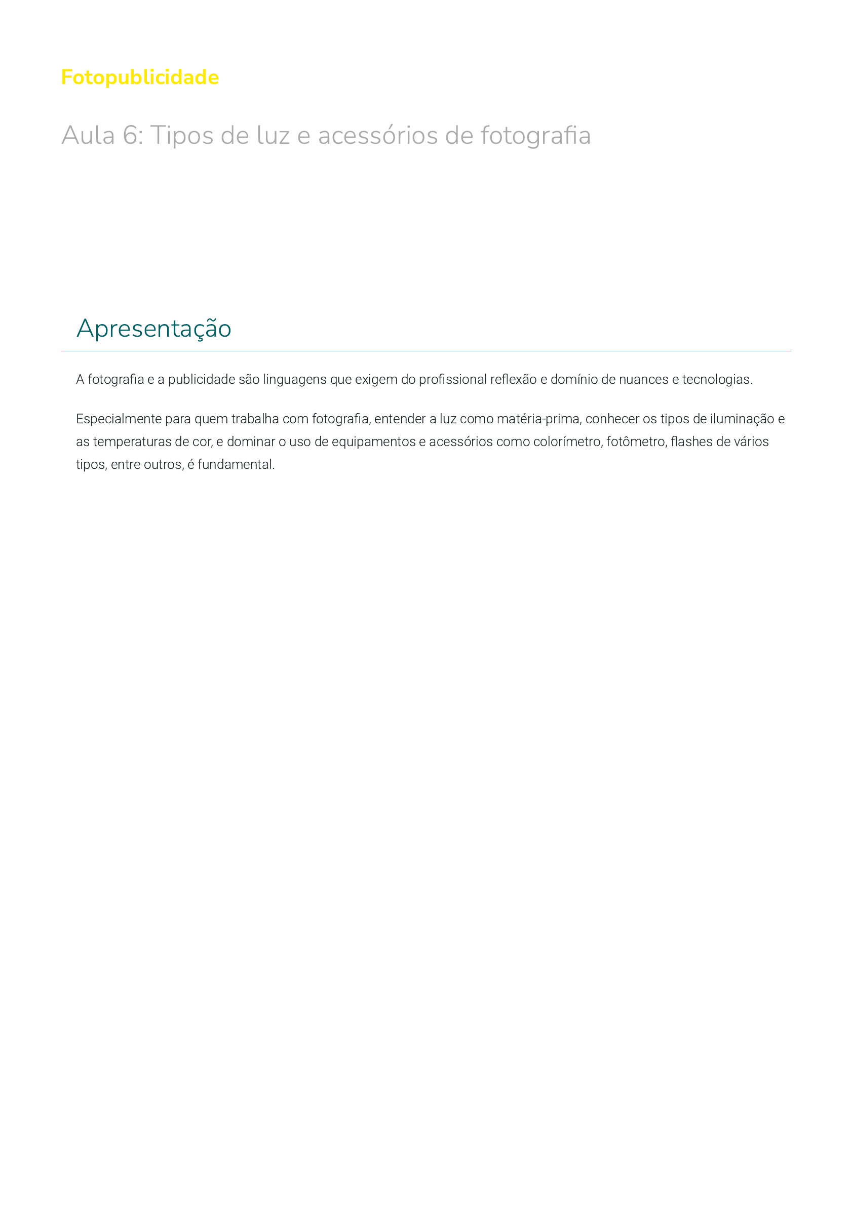 Fotopublicidade Aula 6: Tipos de luz e acessórios de fotografia Apresentação A fotografia e a publicidade são linguagens que exigem do profissional reflexão e domínio de nuances e tecnologias. Especialmente para quem trabalha com fotografia, entender a luz como matéria-prima, conhecer os tipos de iluminação e as temperaturas de cor, e dominar o uso de equipamentos e acessórios como colorímetro, fotômetro, flashes de vários tipos, entre outros, é fundamental. Objetivos Reconhecer a luz como matéria-prima da fotografia e sua complexidade; Descrever os equipamentos de iluminação e suas funcionalidades; Analisar o trabalho com modelos. A luz Atenção! Aqui existe uma videoaula, acesso pelo conteúdo online Não é por acaso a junção de foto (luz) com grafia (escrita). Sem luz não existe imagem. Assim como na escuridão, sem a menor fonte de luz, o homem não enxerga nada, as câmeras não registram imagens sem que haja um mínimo de luz, . seja ela analógica, com película, ou digital, com um sensor. Assim como a imagem digital tem o pixel como unidade básica, a luz, de acordo com a física, é formada pelo fóton ou fotão. Essa é a sua partícula constitutiva. Ainda de acordo com a física, a luz, quando em contato com qualquer superfície, sofre três ações simultâneas: reflexão, refração e absorção (CIPRIANO, 2017). Reflexão Acontece quando a luz encontra uma superfície e, ao tocá- la, volta, ou seja, é rebatida. Pode ser uma reflexão regular – em espelhos e metais – ou difusa – quando encontra Refração Ocorre quando a luz encontra tecidos, vidros, água e ar, e continua a se propagar. Absorção Se dá em casos de superfícies que absorvem a luz, como corpos negros – tecidos, espumas ou elementos pintados de preto. superfícies rugosas ou irregulares, como paredes e similares. Não estamos aqui analisando a física de forma abstrata. Esses conhecimentos são importantes para os fotógrafos, que os utilizam em muitas ações técnicas. Mais adiante analisaremos exemplos. Existem dois tipos luz ou de iluminação: natural e artificial. Natural é quando o fotógrafo estuda um local, uma locação, e observa como a luz do sol se comporta: sua intensidade, onde há sombra e como ela incide , entre outros inúmeros fatores. Artificial é aquela criada pelo homem com o uso de equipamentos. Podem ser flashes, pontos de luz/tochas, fresnéis no teto do estúdio, ou mesmo um abajur utilizado de forma inteligente, uma simples lâmpada auxiliar, entre outros. Os raios ultravioletas constituem a melhor fonte de luz para o registro de imagens desde os equipamentos amadores até os profissionais mais sofisticados. Fonte: Google Luz/iluminação artificial em estúdio fotográfico. Fonte: Google Atenção! Aqui existe uma videoaula, acesso pelo conteúdo online Atenção Também se pode utilizar uma iluminação mista. Por exemplo, mesclar uma luz que entra pela janela com um flash ou um ponto de luz. Todavia, esse tipo de mistura exige conhecimento de temperatura de cor, assunto que será abordado ainda nesta aula. Equipamentos, acessórios e técnicas Um trabalho fotográfico profissional, principalmente de teor publicitário, necessita de equipamentos que atendam as demandas do mercado e do público-alvo. No que diz respeito à iluminação direta, podemos citar alguns como os mais requisitados. Flash externo. A parte inferior (em vermelho) é o sensor, que permite ao fotógrafo acionar a distância. Fonte: Google Flash externo O flash é um equipamento que auxilia o fotógrafo na iluminação. Eles podem ser externos ou internos – estes por vezes também chamados de embutidos/integrados. No flash externo, a cabeça localizada na parte superior é móvel para que o fotógrafo possa direcionar o feixe. Geralmente esses flashes trazem controles de zoom e foco que se relacionam, respectivamente, com a intensidade da luz a ser disparada e com o tamanho da luz, isto é, o diâmetro sobre o objeto. Flash interno O flash interno ou embutido/integrado fica localizado na parte superior da câmera e pode ser configurado em intensidade e sincronização com o obturador. Os modelos atuais das câmeras DSLR vêm com a função TTL (Through The Lens – através das lentes), que realiza a leitura da iluminação ambiente através da luz que entra pela objetiva e dessa forma define automaticamente a configuração do flash. javascript:void(0); Flash interno. Fonte: Google Flash com sincronizador e luz contínua Existe um mecanismo com um sensor que identifica o disparo de um flash principal e no mesmo momento realiza um segundo disparo como luz complementar. Trata-se do com sincronizador e luz contínua, muito utilizado em estúdios e eventos em que os cenários são montados e de cada lado se coloca um flash com as sombrinhas rebatedoras ou difusoras. A luz contínua serve para compor o design de um cenário ou para fotografar modelos e produtos com uma luz previamente determinada. No linguajar do cotidiano, alguns fotógrafos chamam os flashes ou pontos de luz contínua de tochas. Na imagem a seguir você pode ver duas lâmpadas: a maior, centralizada para luz contínua, e uma lâmpada mais fina ao seu redor, para disparar como um flash convencional. Flash de luz contínua com sincronizador. | Fonte: Ebay Fresnel O fresnel é um equipamento de iluminação presente em estúdios fotográficos, de televisão e cinema, e também em teatros. Sua potência é extraordinária, permitindo o controle da intensidade da iluminação e do foco (diâmetro do feixe). Fresnel. Fonte: BH Photovideo javascript:void(0); javascript:void(0); javascript:void(0); Mesa dimmer. Fonte: Vendas rápidas Fresnéis são usados para auxiliar a realização de fotografias mais dramáticas e também nas produções publicitárias e televisivas. Trata-se de um equipamento caro, pois em geral precisa estar ligado em um dimmer, uma mesa que controla a iluminação do estúdio; já o diâmetro é 