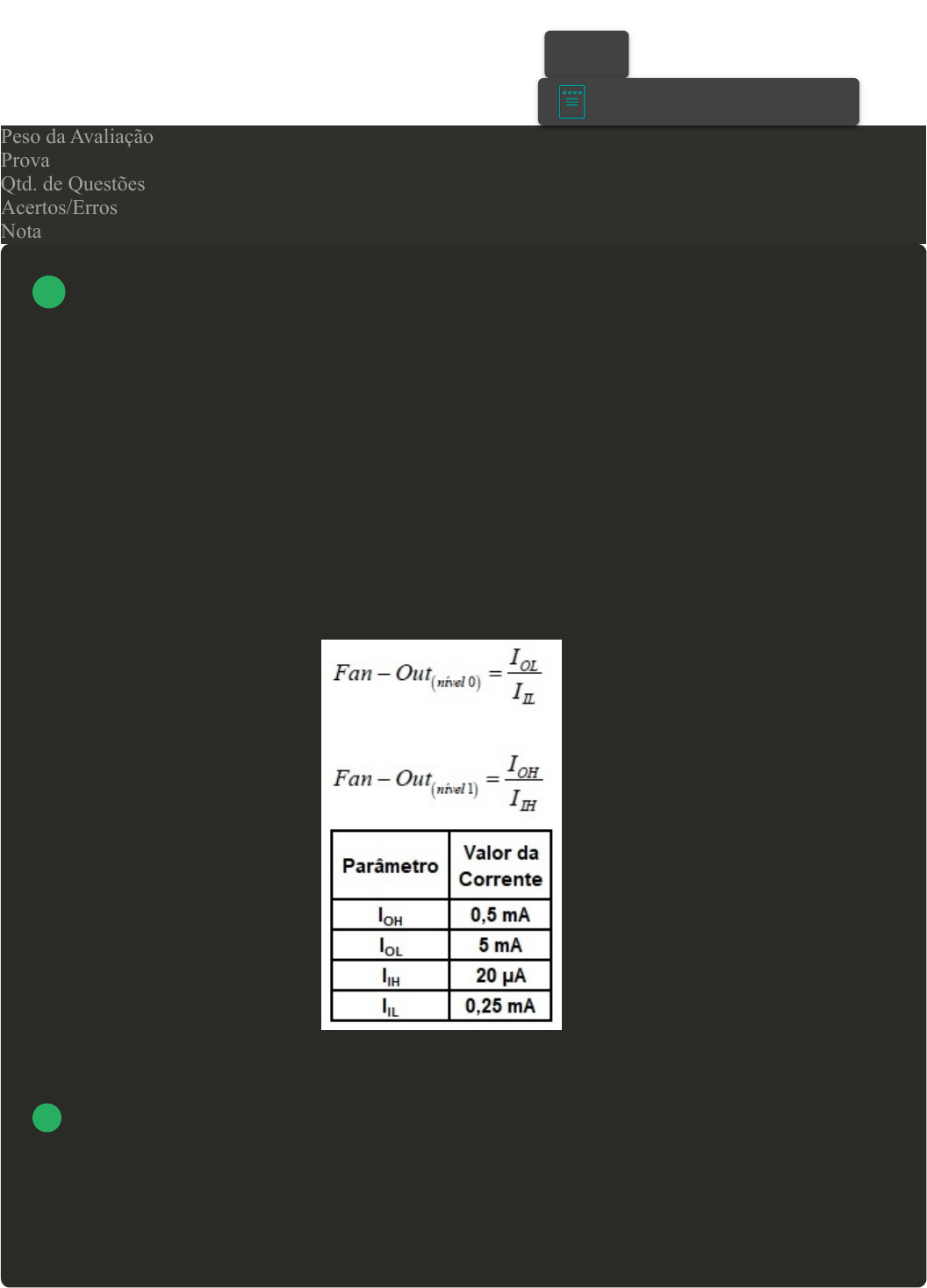 Prova Impressa GABARITO | Avaliação Final (Objetiva) - Individual (Cod.:768590) Peso da Avaliação 3,00 Prova 59217528 Qtd. de Questões 10 Acertos/Erros 10/0 Nota 10,00 As portas lógicas digitais são, na prática, dispositivos chamados de circuitos integrados, ou ainda de chips. Para isso podem ser utilizadas algumas tecnologias distintas, gerando as chamadas famílias lógicas. A família TTL e a família CMOS são as famílias lógicas digitais mais conhecidas. As famílias lógicas digitais possuem estruturas internas, características e aspectos técnicos distintos. Entre os aspectos técnicos importantes existem as correntes máximas de entrada e saída das portas lógicas, além do Fan-Out, que define a quantidade máxima de portas lógicas que podem ser ligadas na saída de outra porta. Na figura são apresentadas as fórmulas para calcular o Fan-Out e os valores de correntes de entrada e de saída de uma determinada porta TTL. Considerando esses dados, analise as seguintes sentenças a seguir: I- O valor do Fan-Out para nível lógico baixo é de 20 portas. II- O valor de Fan-Out para nível lógico alto é de 25 portas. III- O valor da IIH (Corrente de entrada em nível alto) é de 20 mA. IV- O valor da IOH (Corrente de saída em nível alto) é de 0,5 mA. Assinale a alternativa CORRETA: A As sentenças III e IV estão corretas. B As sentenças I, II e IV estão corretas. C As sentenças II, III e IV estão corretas. D As sentenças I, II e III estão corretas. VOLTAR A+ Alterar modo de visualização 1 02/07/2024, 20:43 Avaliação Final (Objetiva) - Individual about:blank 1/7 Os circuitos digitais que variam os estados de suas saídas sob o comando de um Clock, de acordo com uma sequência predeterminada, são chamados de Contadores. Esses circuitos são usados para contagens diversas, divisão e medição de frequência e tempo, geração de formas de onda, entre outros. Os contadores podem ser classificados em dois grandes grupos: Síncronos e Assíncronos. Com relação aos contadores Assíncronos, assinale a alternativa CORRETA: A São aqueles contadores em que todos os flip-flops recebem o mesmo sinal de Clock, simultaneamente, de modo a atuarem de forma sincronizada, ocorrendo a transferência de pulsos de Clock do sistema de uma só vez. B São aqueles em que o sinal de Clock é aplicado apenas no último flip-flop do grupo. Os demais flip-flops recebem Clock vindo da saída Q do flip-flop posterior, ocorrendo a transferência de pulsos de Clock do sistema em cascata. C São aqueles em que o sinal de Clock é aplicado apenas no primeiro flip-flop do grupo. Os demais flip-flops recebem Clock vindo da saída Q do flip-flop anterior, ocorrendo a transferência de pulsos de Clock do sistema em cascata. D São aqueles contadores em que todos os flip-flops recebem o mesmo sinal de Clock, simultaneamente, de modo a atuarem em forma de cascata, ocorrendo a transferência de pulsos de Clock do sistema em cascata. Considerando que o mundo no qual vivemos é regido por eventos analógicos, e que os sistemas digitais possuem diversas vantagens em relação aos sistemas analógicos, é necessário utilizarmos conversores. Estes realizam conversão de grandezas no formato analógico para o formato digital e vice-versa. Nesse contexto, analise as funções dos blocos necessários para construir um sistema digital de controle de temperatura ambiente, e classifique V para as sentenças verdadeiras e F para as falsas: ( ) Processamento digital: é responsável por executar o programa que define o funcionamento geral do sistema de controle conforme desejado. ( ) Conversor analógico-digital: é responsável por efetuar a transformação do valor de temperatura medido para um valor digital que pode ser processado. ( ) Dispositivo de medição (sensor): é responsável por efetuar o resfriamento ou aquecimento da temperatura conforme resultado do processamento. ( ) Controlador: é responsável por efetuar a leitura da temperatura do ambiente e gerar um sinal analógico correspondente ao valor lido. ( ) Conversor digital-analógico: é responsável por efetuar a transformação do valor digital, gerado pelo processamento, para valor analógico viabilizando a atuação do próximo bloco. Assinale a alternativa que apresenta a sequência CORRETA: A V - V - F - V - F. B F - F - F - V - F. C F - V - V - F - V. D V - V - F - F - V. Na álgebra booleana, criada em 1854, as variáveis admitem somente dois valores (0 ou 1). Os teorema de De Morgan são muito utilizados para auxiliar na simplificação de expressões booleanas. O 2 3 4 02/07/2024, 20:43 Avaliação Final (Objetiva) - Individual about:blank 2/7 primeiro teorema de De Morgan afirma que "o complemento do produto é igual à soma dos complementos". Com relação à expressão booleana que representa o primeiro teorema de De Morgan, analise na figura as opções apresentadas, e depois assinale a alternativa CORRETA: A A opção 4 representa o primeiro Teorema de De Morgan. B A opção 3 representa o primeiro Teorema de De Morgan. C A opção 1 representa o primeiro Teorema de De Morgan. D A opção 2 representa o primeiro Teorema de De Morgan. Os circuitos combinacionais possuem uma utilidade muito grande na eletrônica digital. Existem tipos de circuitos combinacionais, como codificadores, decodificadores, somadores, multiplexadores e demultiplexadores. Cada um desses circuitos possui funções e objetivos específicos, que servem para solucionar determinadas necessidades. Com relação à função do circuito Multiplexador, assinale a alternativa CORRETA: A O circuito multiplexador têm a função de enviar, através de várias linhas (ou canais) de saída, os sinais digitais recebidos por várias linhas (ou canais) de entrada, através de uma seleção de entrada. B O circuito multiplexador têm a função de enviar, através de uma única linha (ou canal) de saída, os sinais digitais recebidos por somente uma linha (ou canal) d